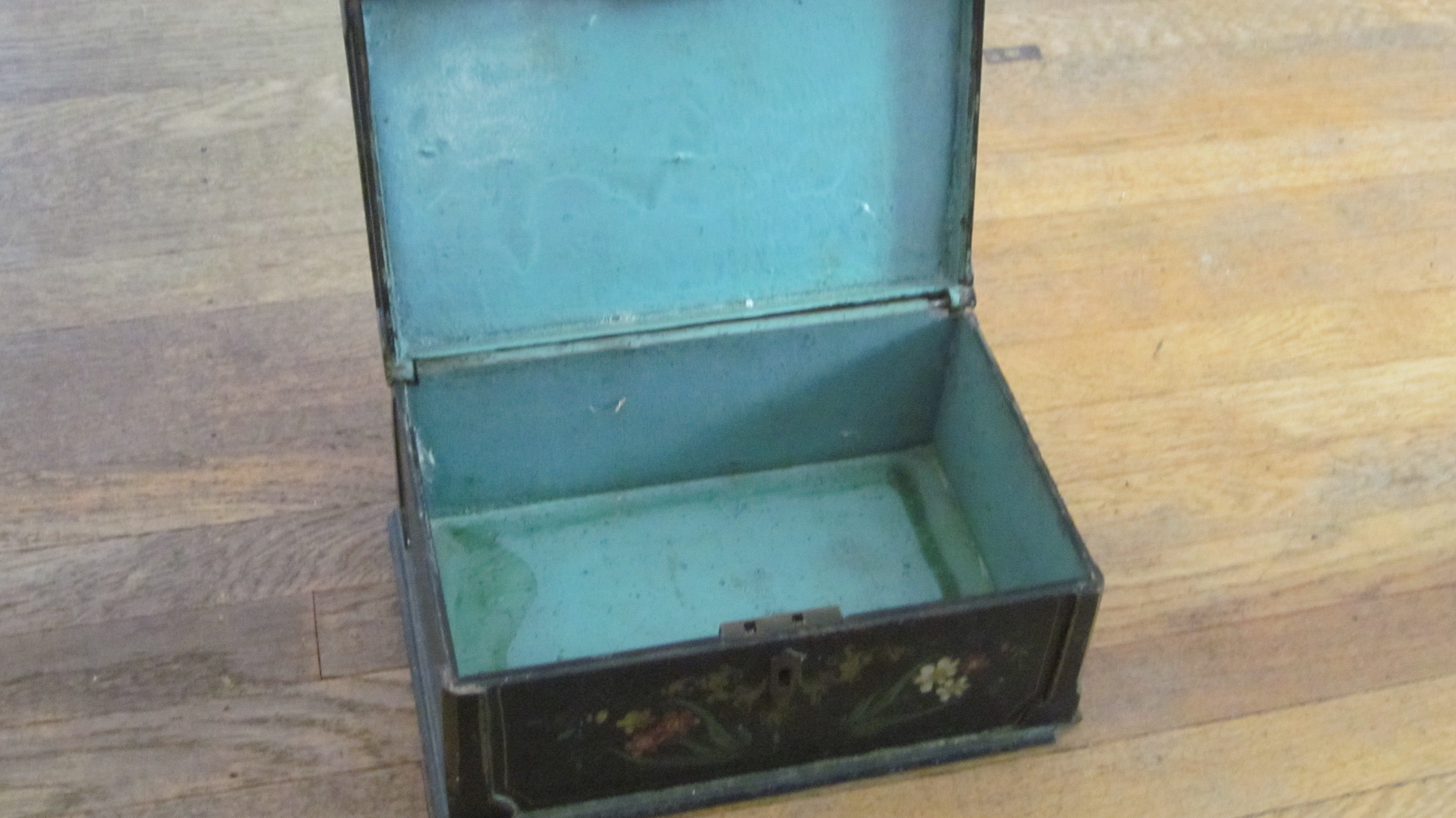 I have a solid, cast iron table top Jewelry Safe that I would like to know more about. It is approximately 11"L x 7.5"D x 4.5"T and weighs about 15-20 lbs. It has painted flowers in great condition on the top and 3 sides. There is a lock but no key and the lock latch appears to be damaged. The hinges are in working order. The overall condition is pretty good. There are raised words on the top of the safe: "Lady's Improved Jewelry Safe".