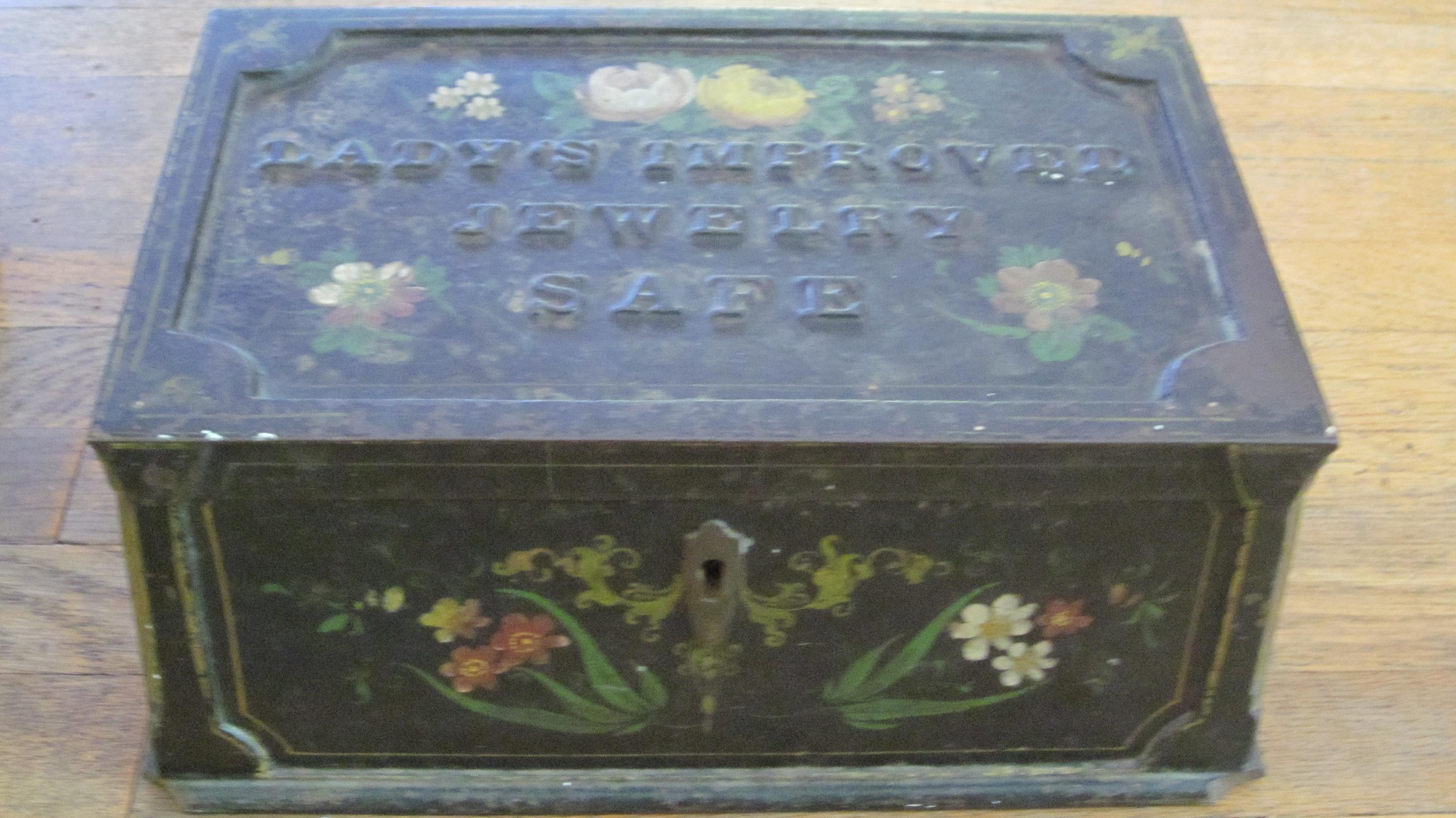 I have a solid, cast iron table top jewelry safe that I would like to know more about. It is approximately 11"L x 7.5"D x 4.5"T and weighs about 15-20 lbs. It has painted flowers in great condition on the top and 3 sides. There is a lock but no key and the lock latch appears to be damaged. The hinges are in working order. The overall condition is pretty good. There are raised words on the top of the safe: "Lady's Improved Jewelry Safe".