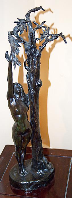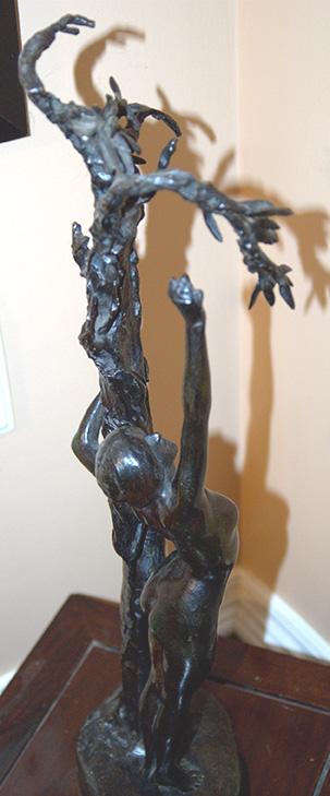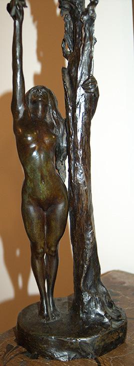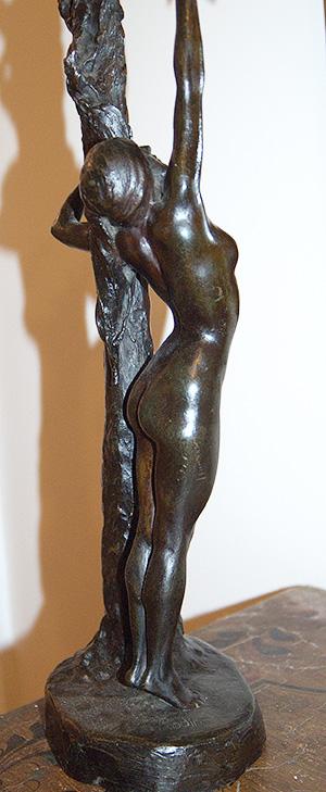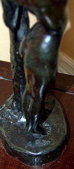 Good morning. My name is Paul Nixon and I purchased this bronze sculpture in 1988 in Mamaroneck New York. The sculpture weight 10 LBS and is 21" tall with its base being 6" by 5". As a bronze sculptor myself and having done some homework. The sculpture appears to be made from three castings as the sculptures base is assembled with the aid of rivets. The nude figure is attached to the tree and base by means of a tapered pin. This I believe puts this sculptures creation in the same time period as Rodin and the Foundry, Alexis Rudier. Both names are stamped into the base of this sculpture. If this is not one of Rodin's pieces was it possibly created by a student.
