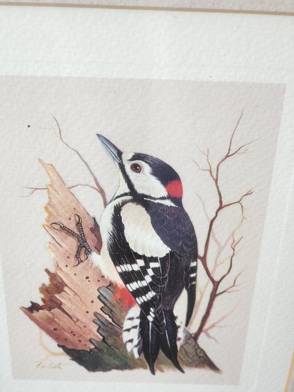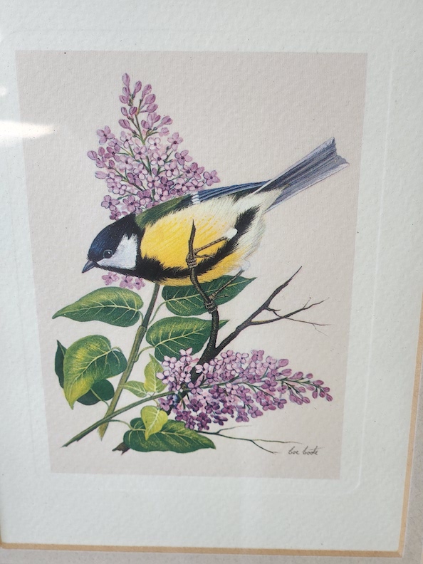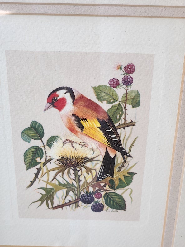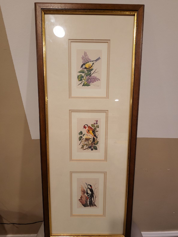 Birds x3 framed with Eve Boote signature. Print. Framed by Robert Grace, Hollister, Ca and has the #J4601 on the back. Wood and gold painted frame