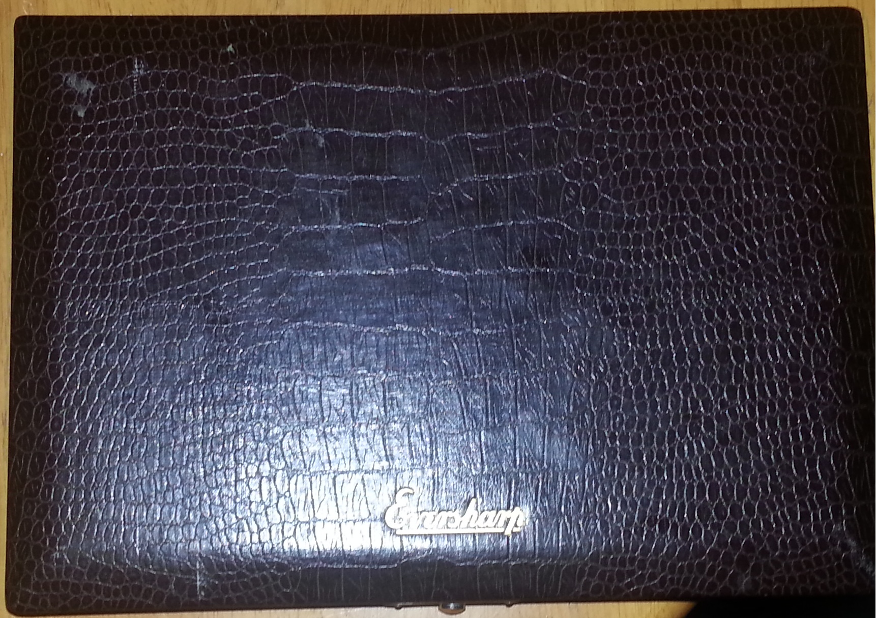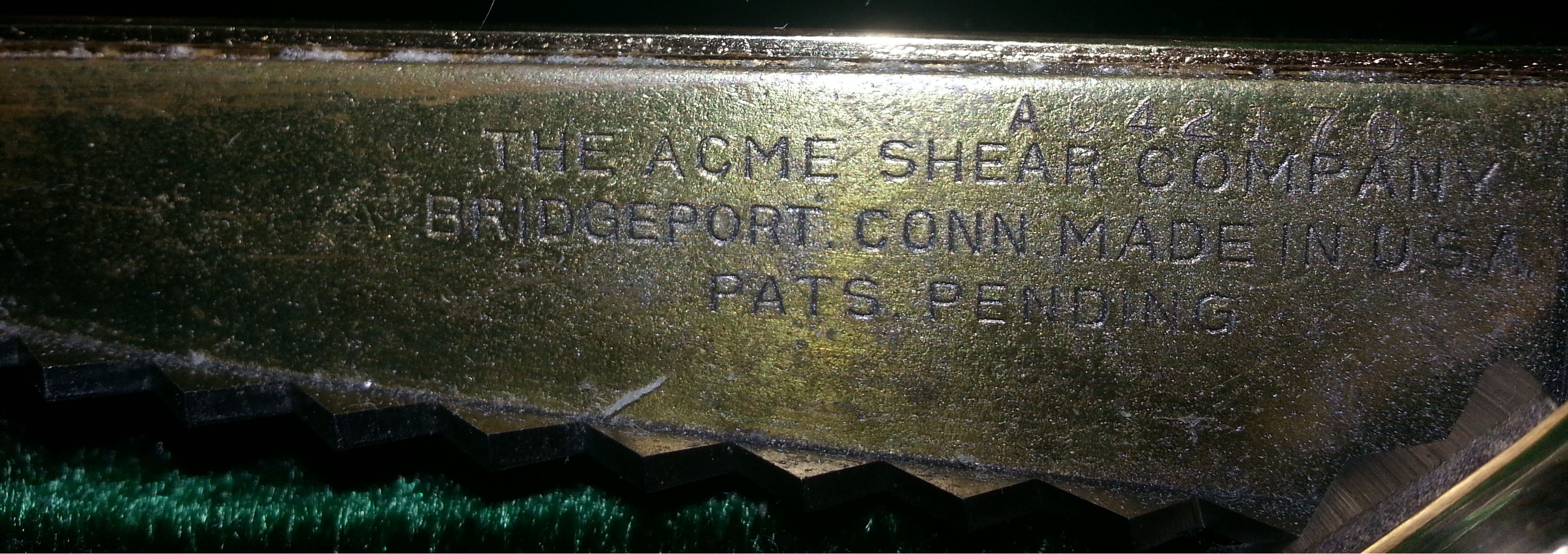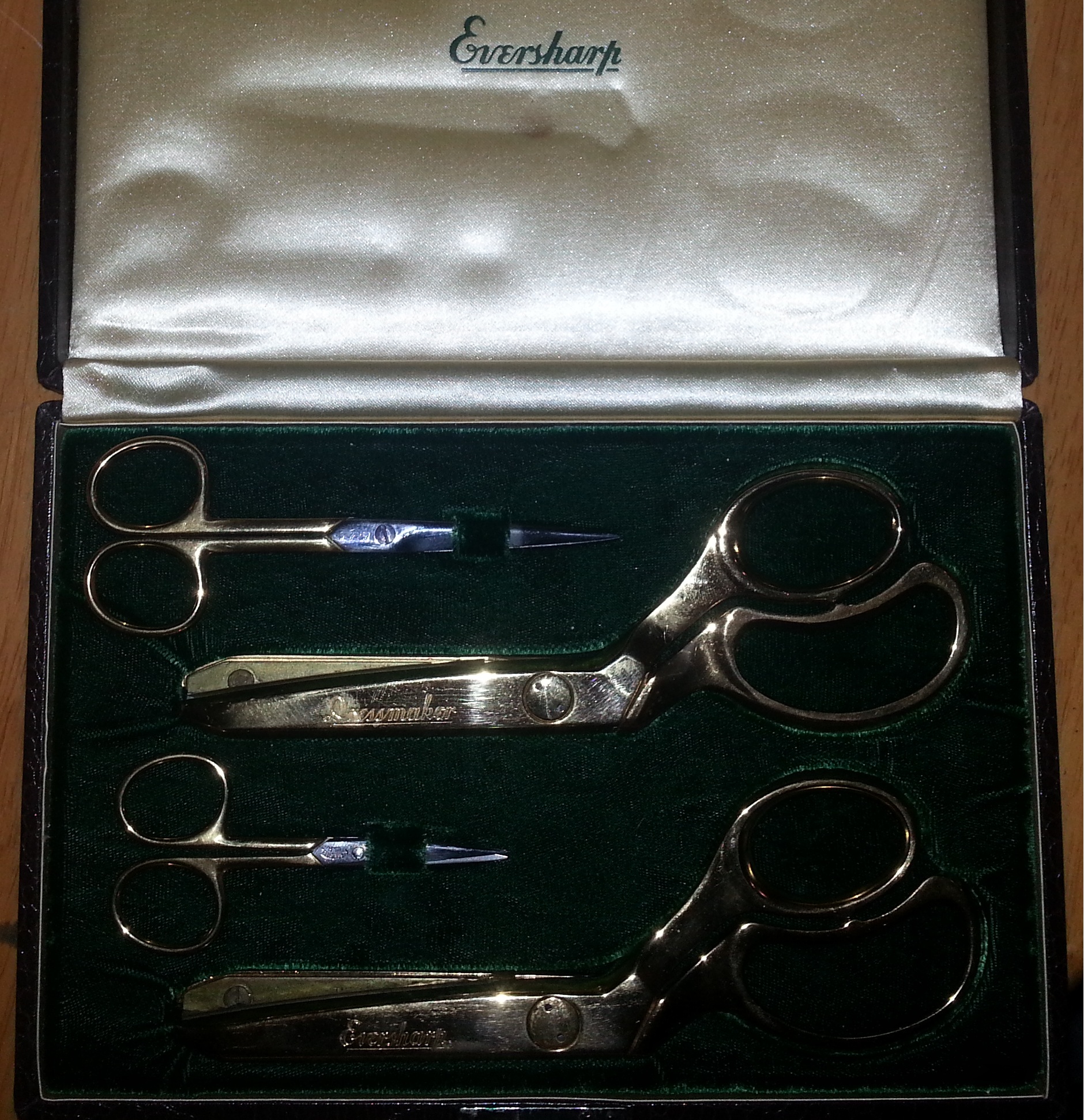 The scissors are a boxset of four from The ACME shear company. The name of the brand is Eversharp. I found an ad from a magazine which is apparently from 1951. The scissors are 24k gold plated and were $29.99 originally. The scissors are labeled "Forgedsteel USA." They're in a leather case lined with gold and green felt. The scissors and case look nearly untouched and are in great condition.