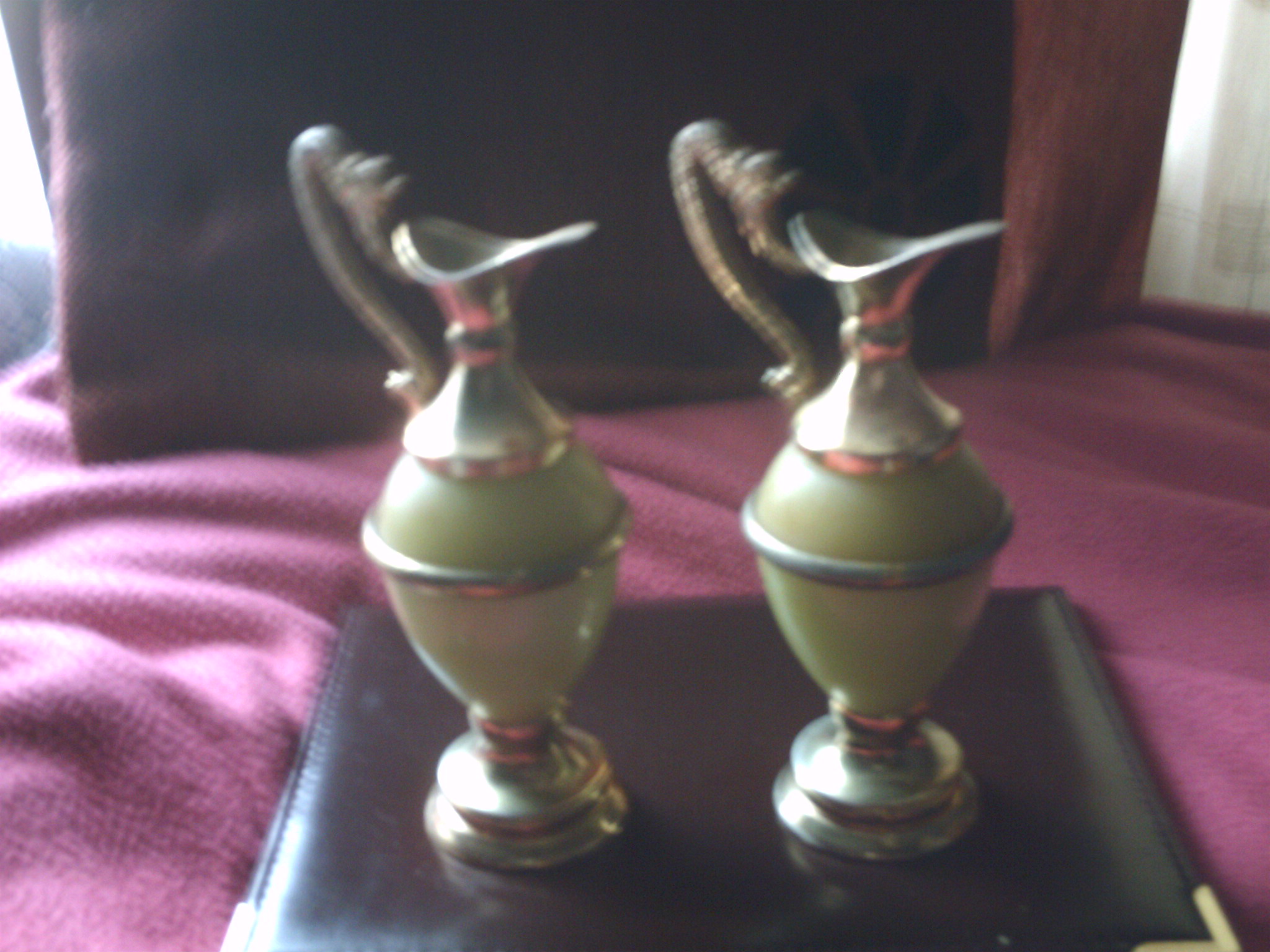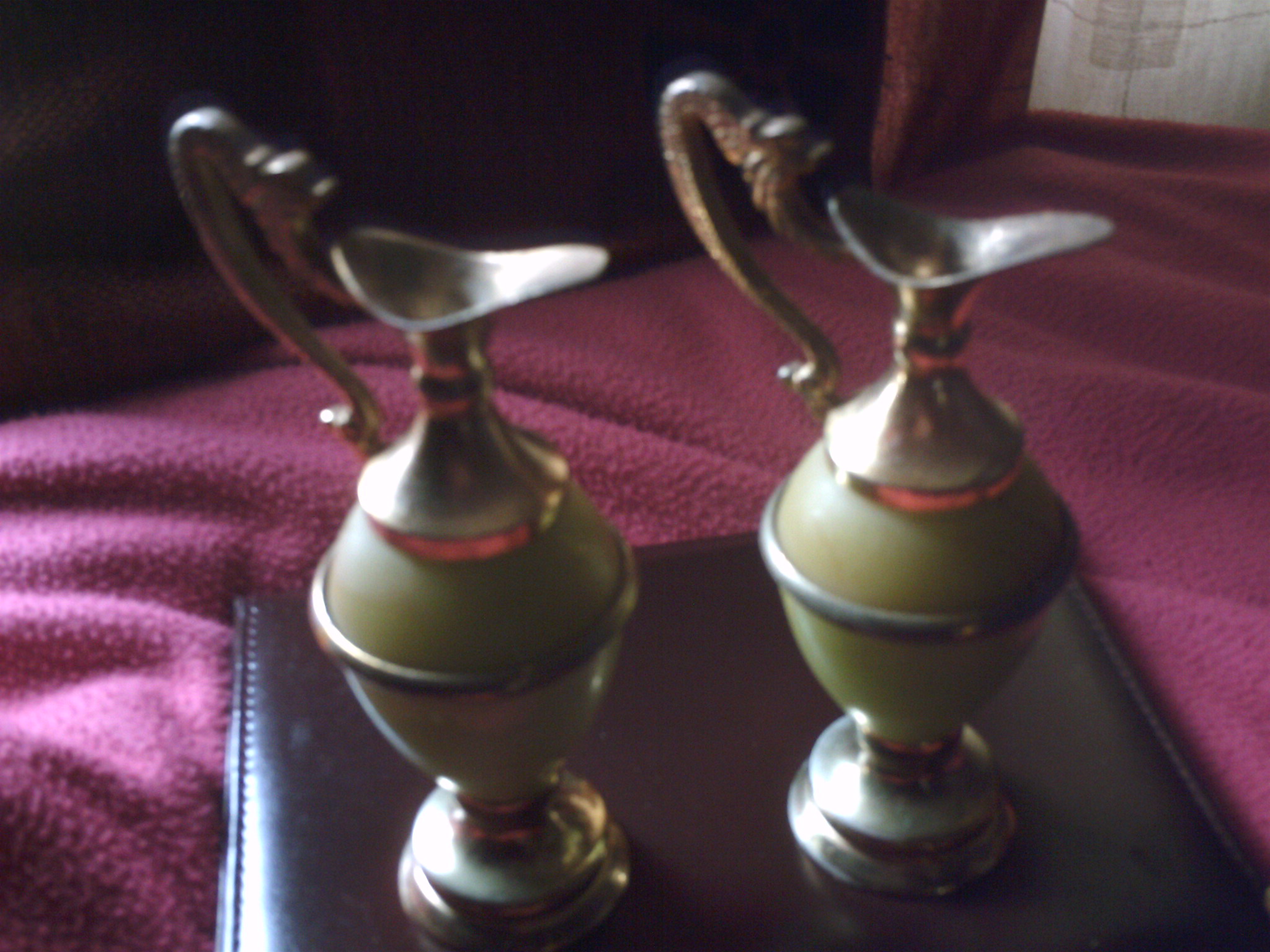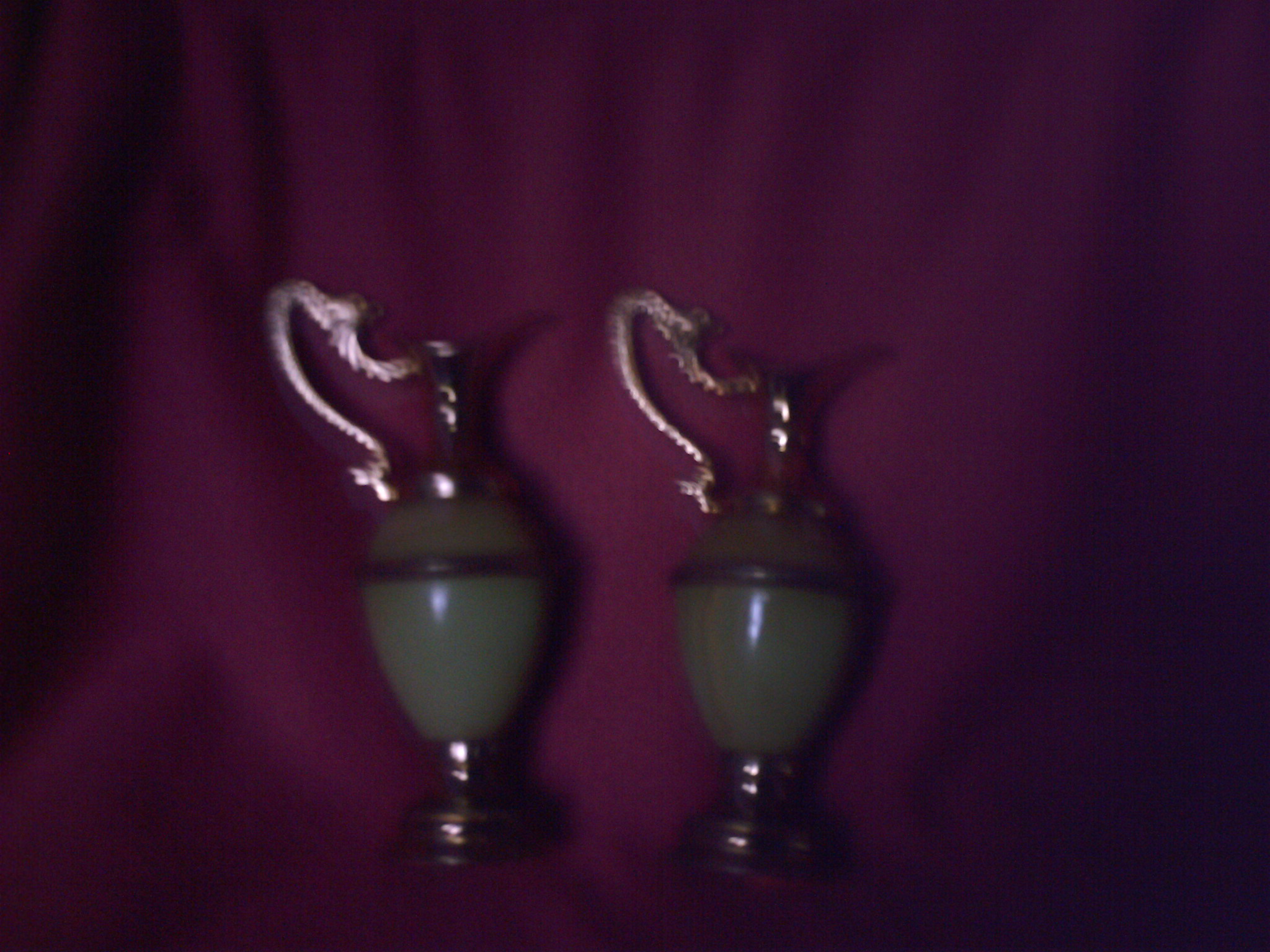 Its a green colour ewer with gold gild rims . in good condition don't know much about them but will be glad to hear what you have to say about them . i bought them at charity shop because i like them with the hope that they will make a good investment.