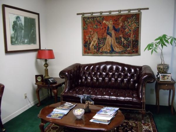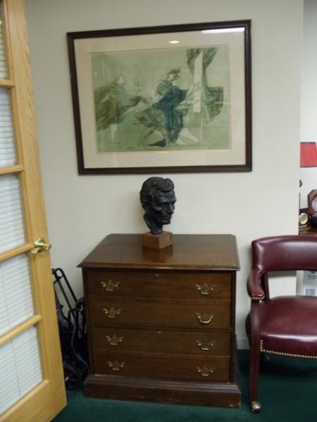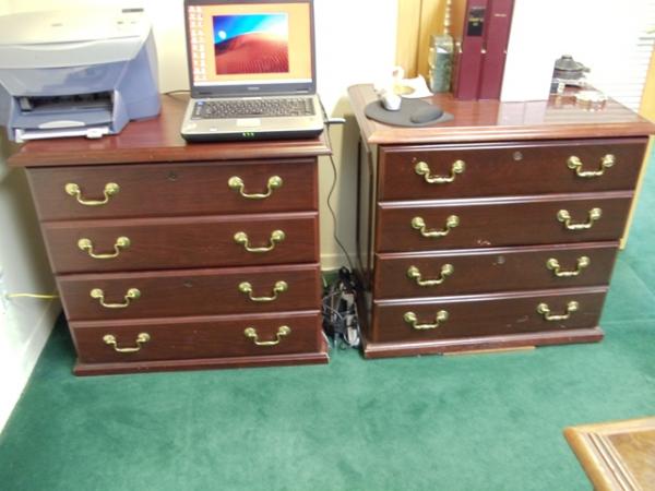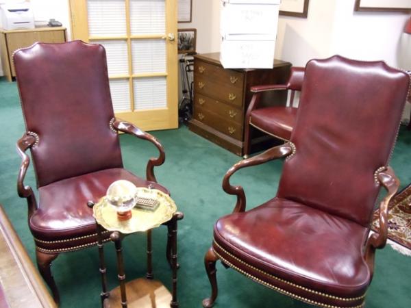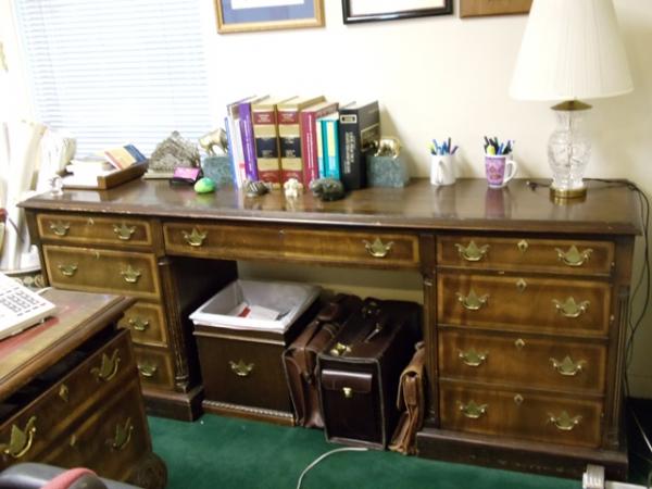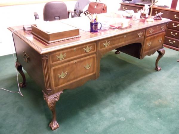 R- Way executive office suite in African mahogany. Queen Anne desk with burgundy leather insets, elegant carved legs with brass pulls on both sides and on the front and back of the desk. Graceful studded high-backed armed burgundy leather client chairs. Matching the desk are a 6-foot credenza, a 2-drawer file cabinet, a mahogany outbox, brass scissors and letter opener in a`matching leather case and a matching mahogany waste basket .. Other accessories, including decor-complementary art, a high-backed studded burgundy leather sofa, side tables, lamps, an oval Queen Anne-legged coffee table and a persian rug are also available.