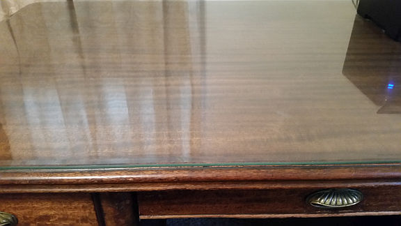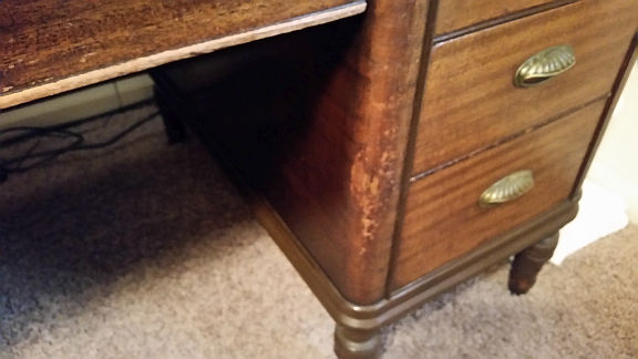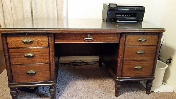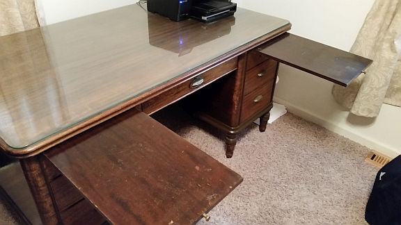 This is a large 59 1/2 X 34 X 30High executive desk featuring one shallow and one deep drawer on each side. Mahogany veneer. Beveled glass top. Center pencil drawer. Encosed back (person's legs not visible to anyone sitting across from the desk.) Some wear and tear along the edges of the opening where chair has bumped it. Gorgeous.