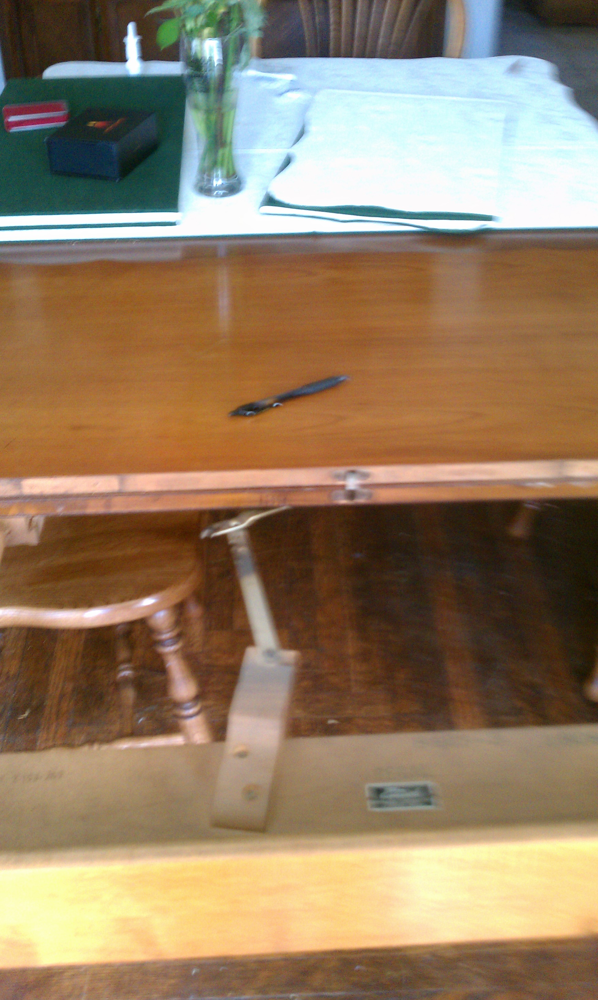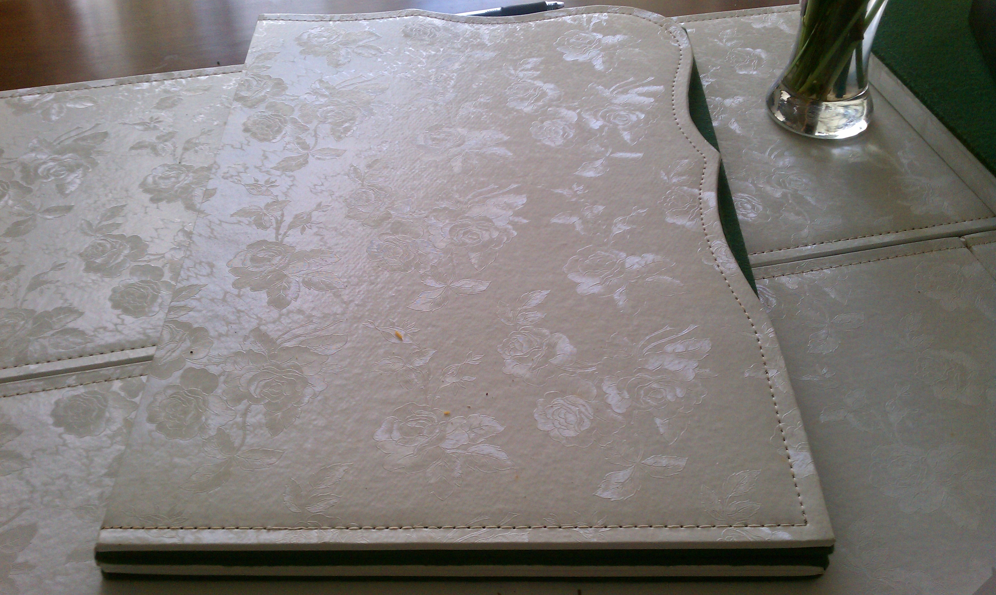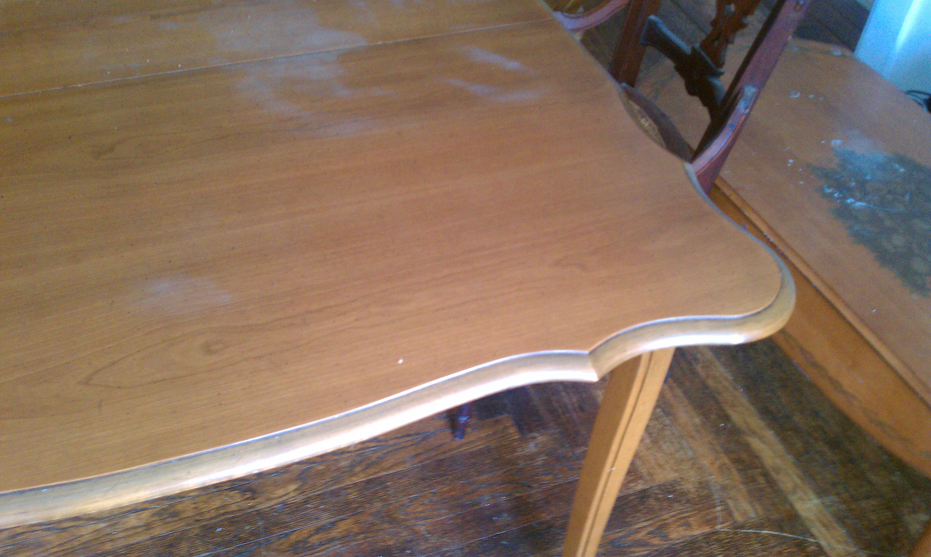 My Photos will not upload. I can say that this table folds up to a small buffet type space and when fully extended it can seat 8 people nicely. It has 3 leaves that are approxmately 1 foot wide each.I have the matching padding for the table to protect the serface. The pads are near mint condition. White rose pattern on top with heave green felt bottoms. The ends of the table have some scroll work. The table is very simple otherwise.