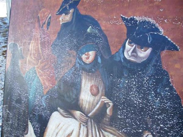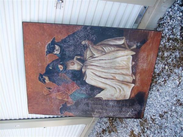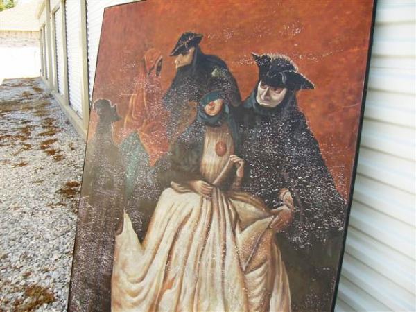 I purchased this at an auction. Paint is flaking, but it looks to be original. Very bizzare piece. Reminds me of the movie "Eyes Wide Shut" some sort of a dark, sexual feel. No artist signature. Painted on a heavey wooden medium. I've purchesed lots of paintings, but this is unique.