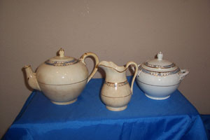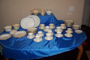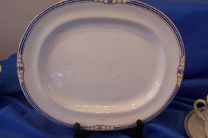 69 Piece dinner ware set with each piece having a stamped hallmark of F. Primavesi & Sons Cardiff, Swansea & Newport. Beautiful gilt edging on each piece with 2 light blue pinstripes surround the edging and gilt design scrollwork on 3 sides of each piece. There is discoloration of some pieces and two coffee cups have hairline cracks. Set has dinner plates/dessert plates/teacups/coffee cups/saucers 3 chargers, 1 soup/salad bowl, 2 large bowls, teapot, creamer, sugar bowl 2 platters.