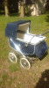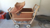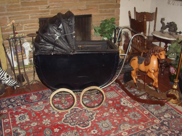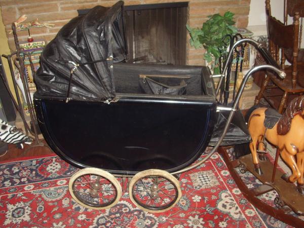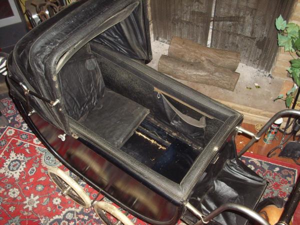 I have a difficult time describing this piece as it is really quite fetching. It has a nearly unblemished wooden body, perhaps black laquer as well. It has a steel frame and handle that has essencially no rust. Metal wheels with white tires. It has an oil cloth hood that is in terrific condition. A three teired pad for the inside that is quite old but not cracked with origianl leather strap buckles. The inside is smooth and has comversion available for a toddler or two to sit upright.