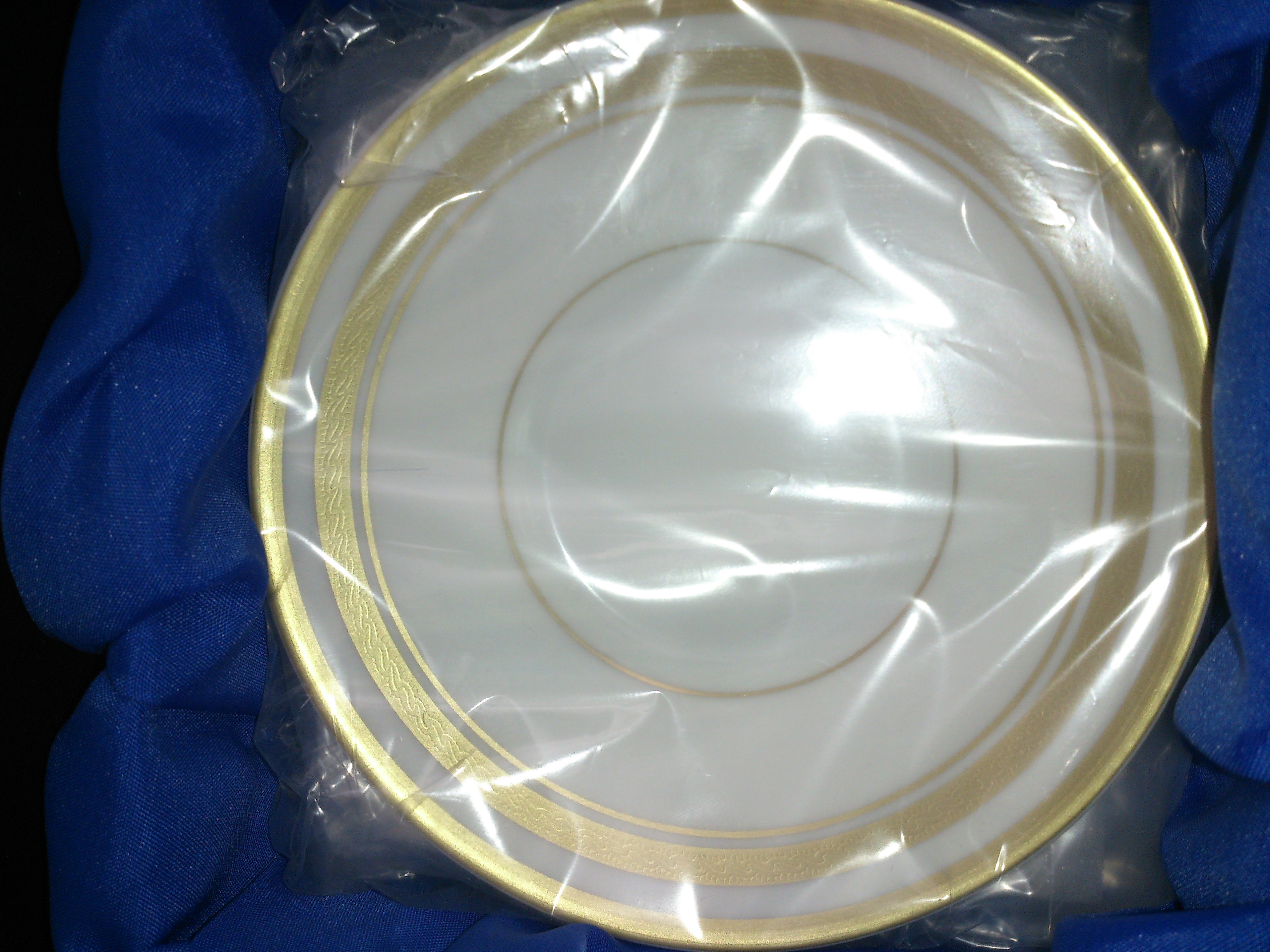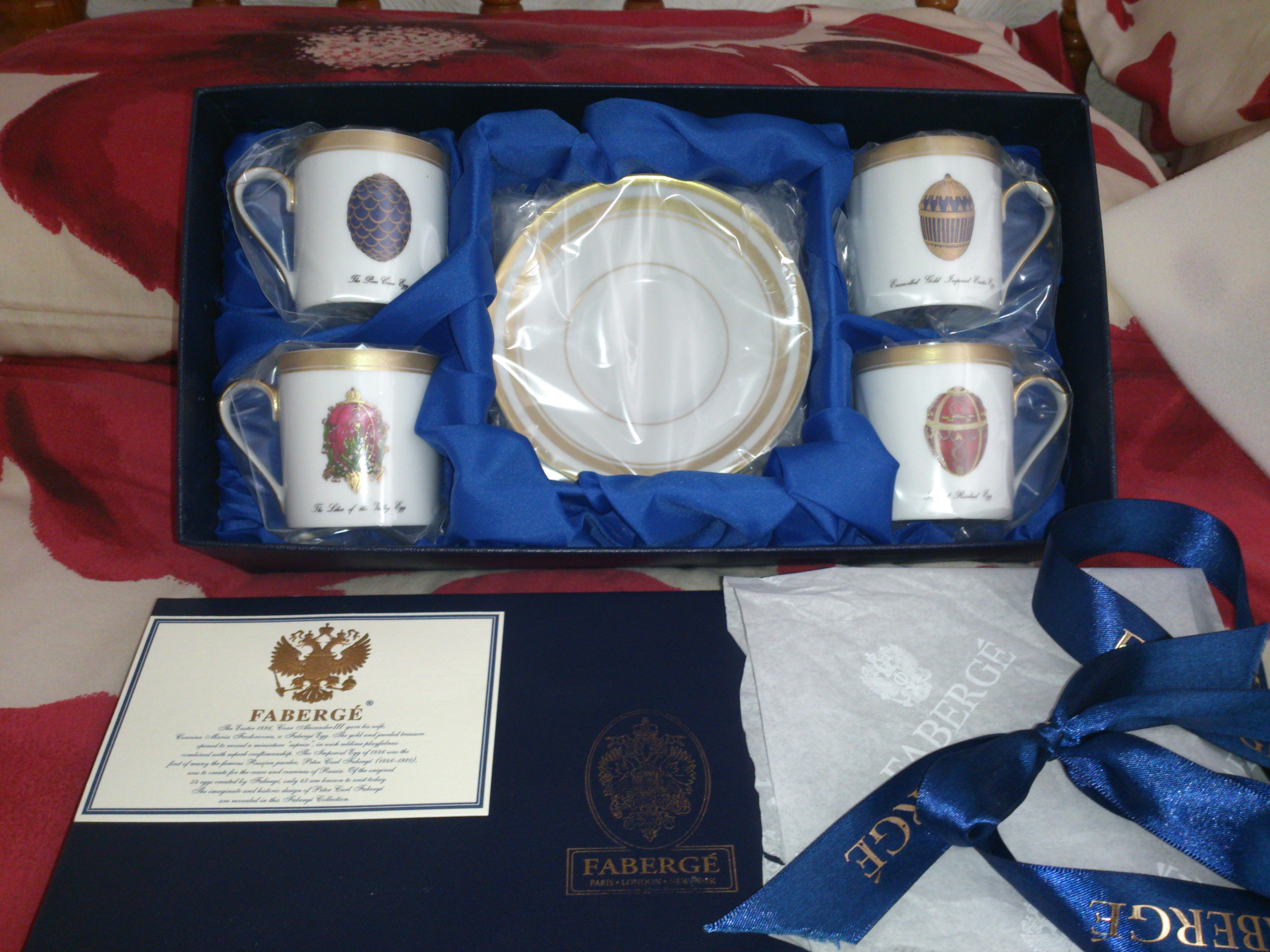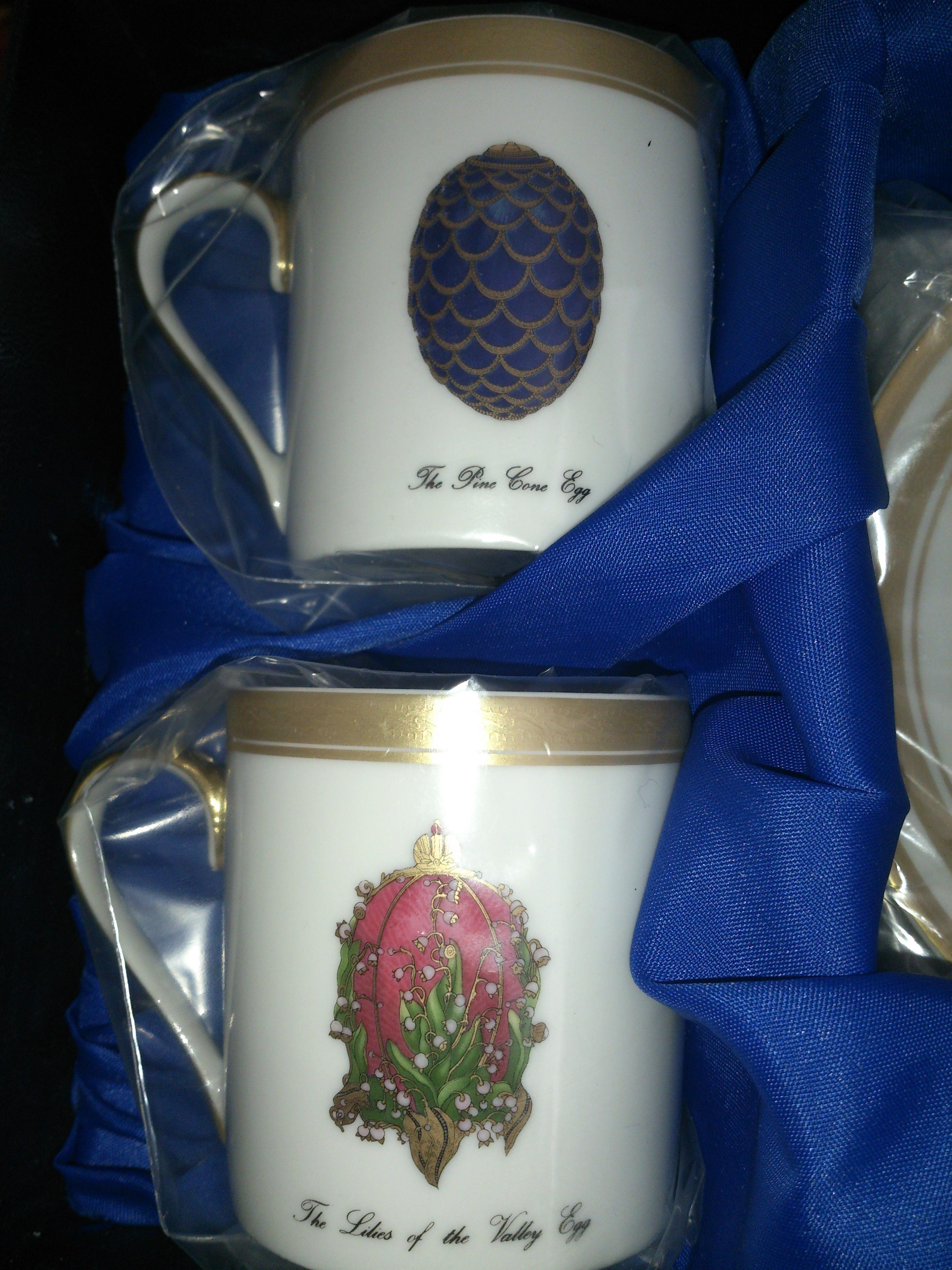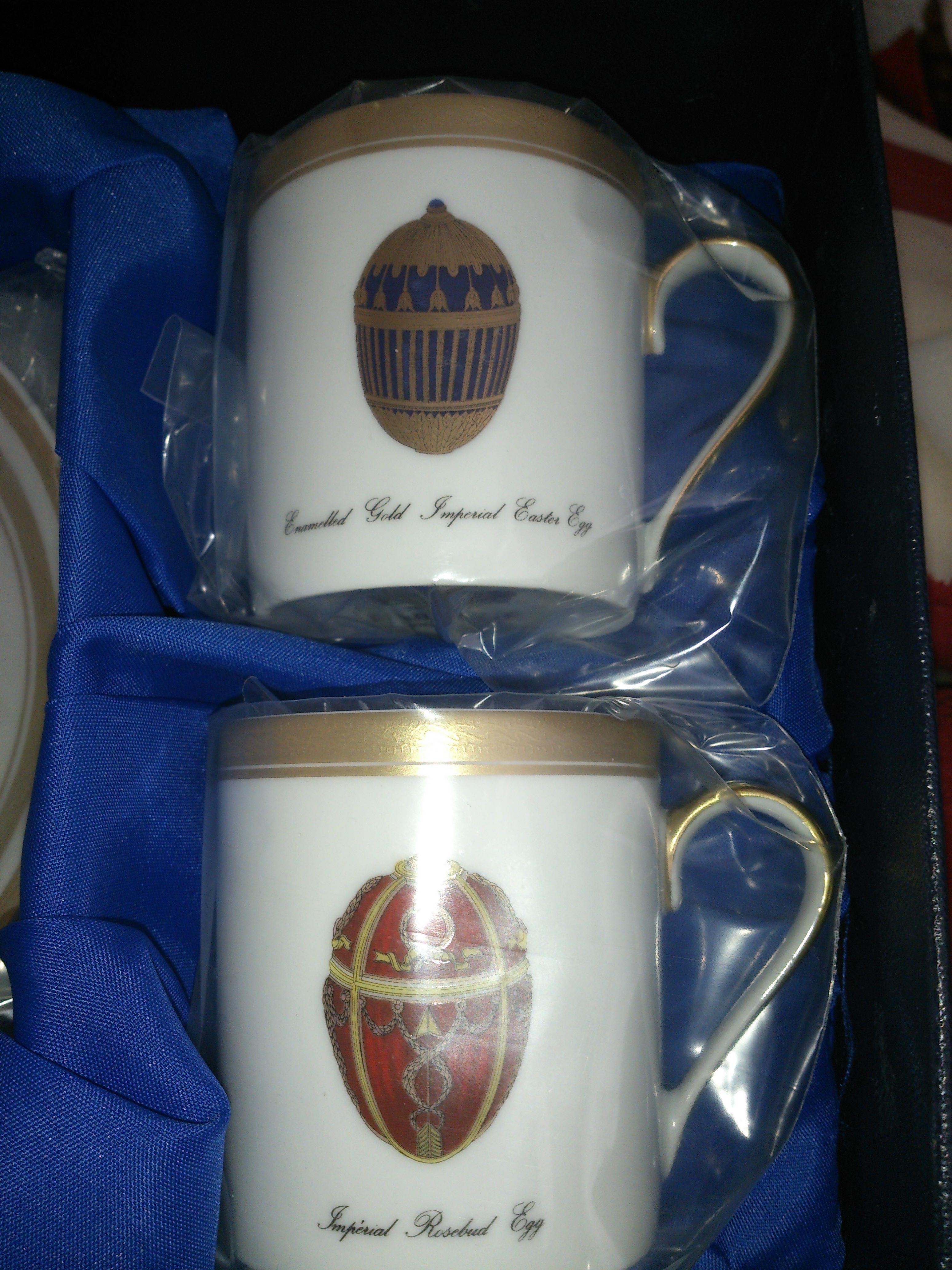 Set of 4 faberge cups and saucers. Laid out in a custom blue box the four cups bear the names The Pine Cone Egg, The Lilies of the Valley Egg, Imperial Rosebud Egg And Enamelled Gold Imperial Easter Egg. The four saucers are all of the same design as shown. Cups and saucers also bear the wording Faberge Limoges France on the underside.