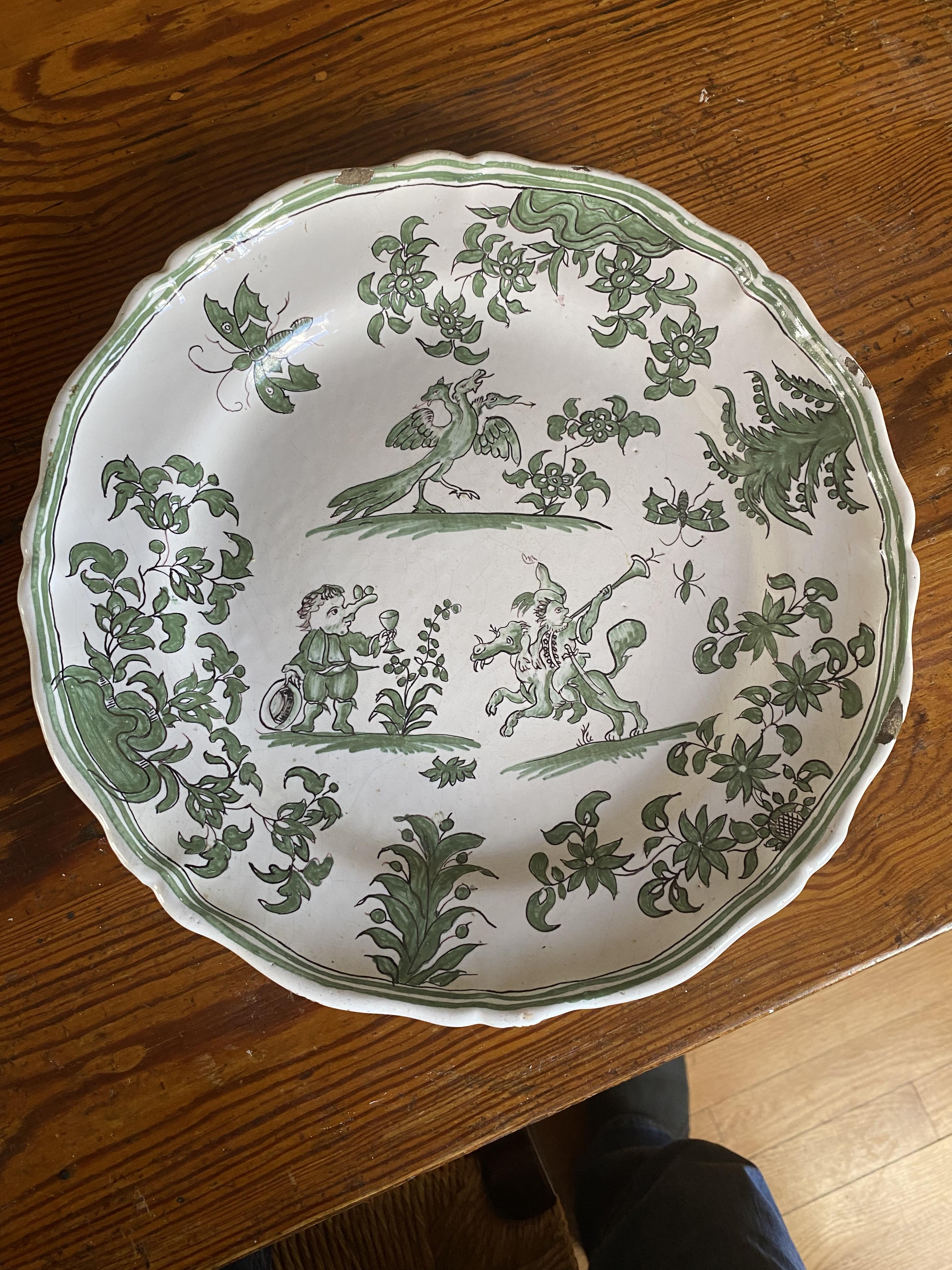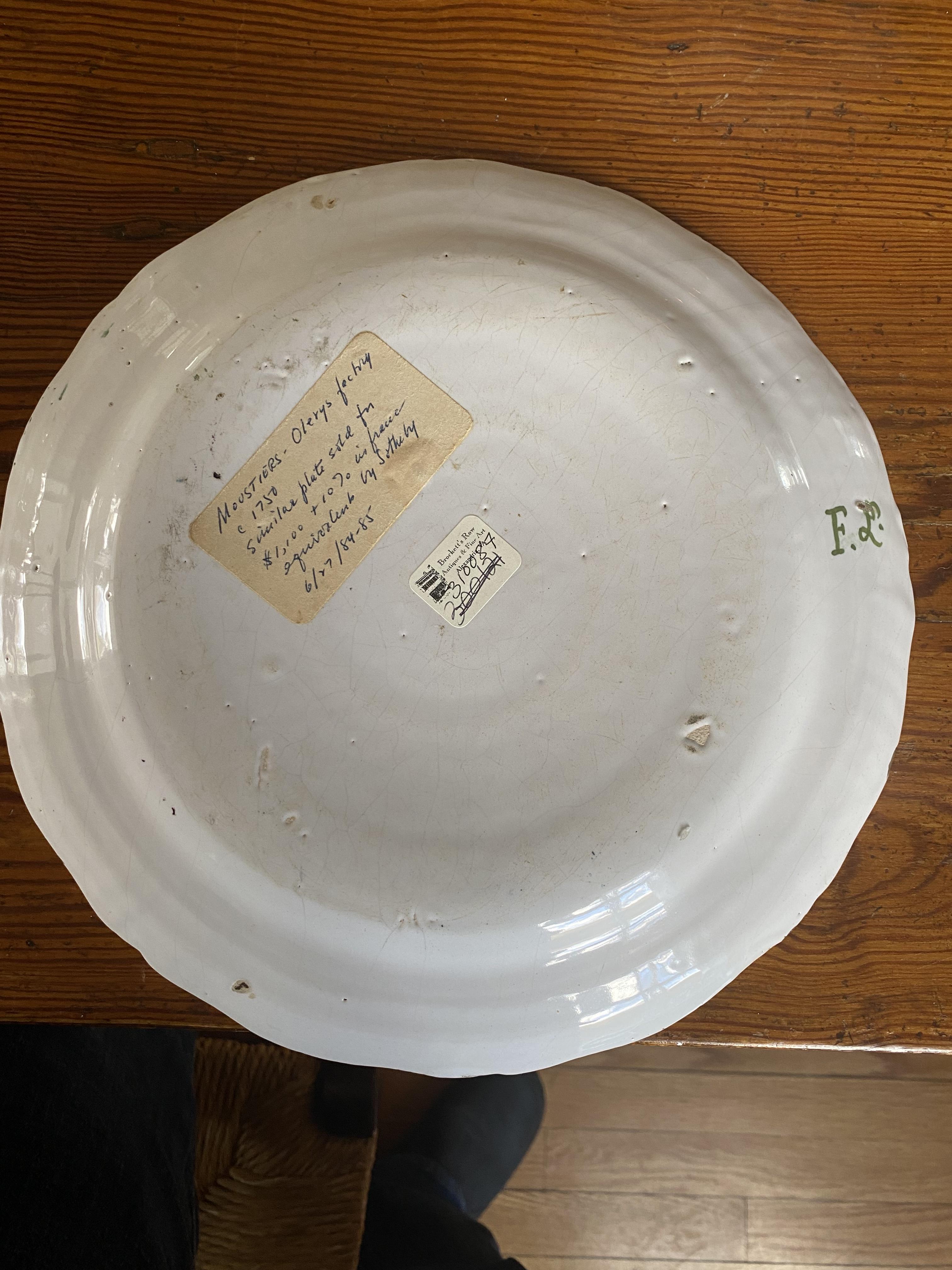 Green on white moustier plate “Grotesque” 1750. Initials FL on the back