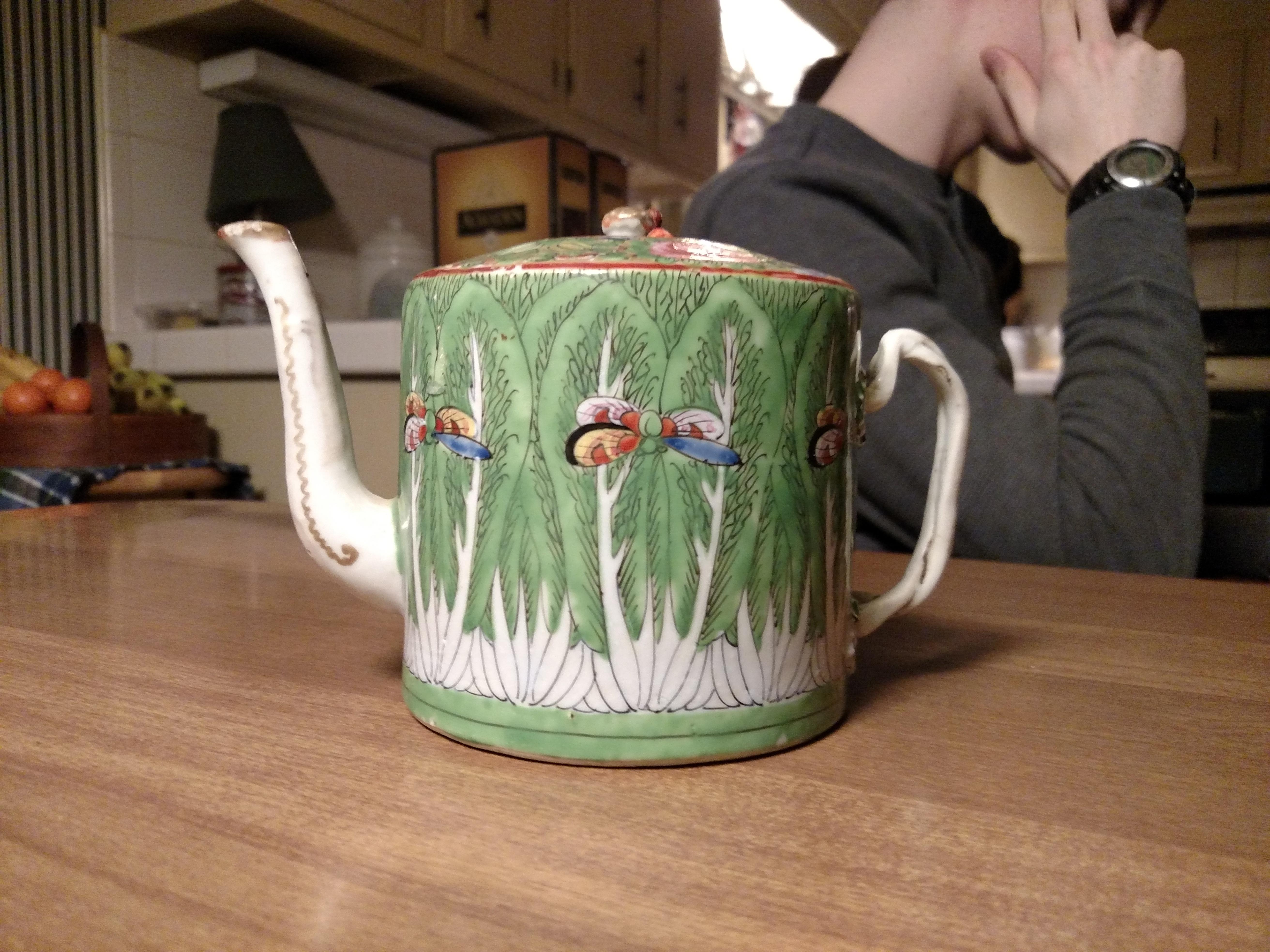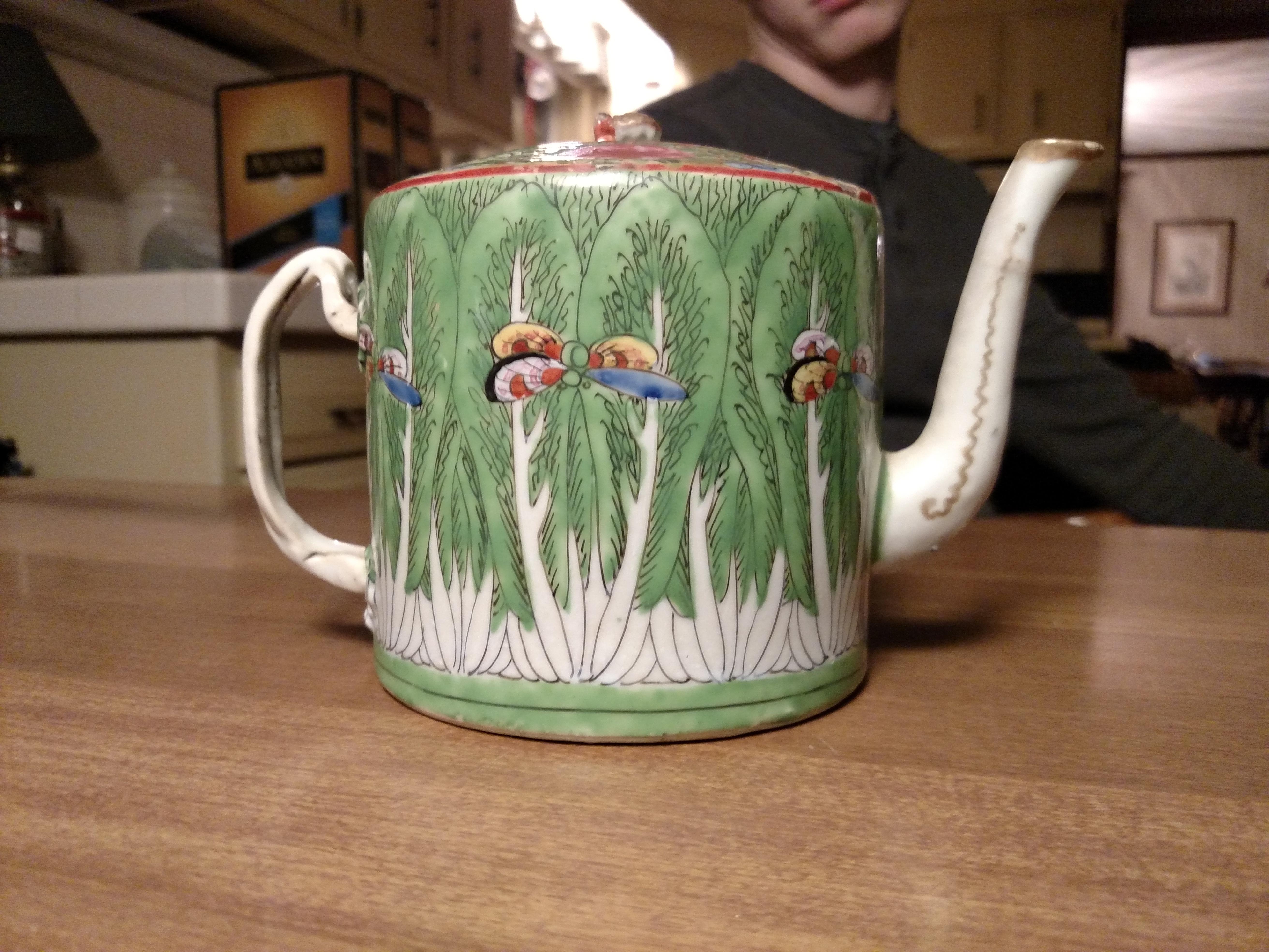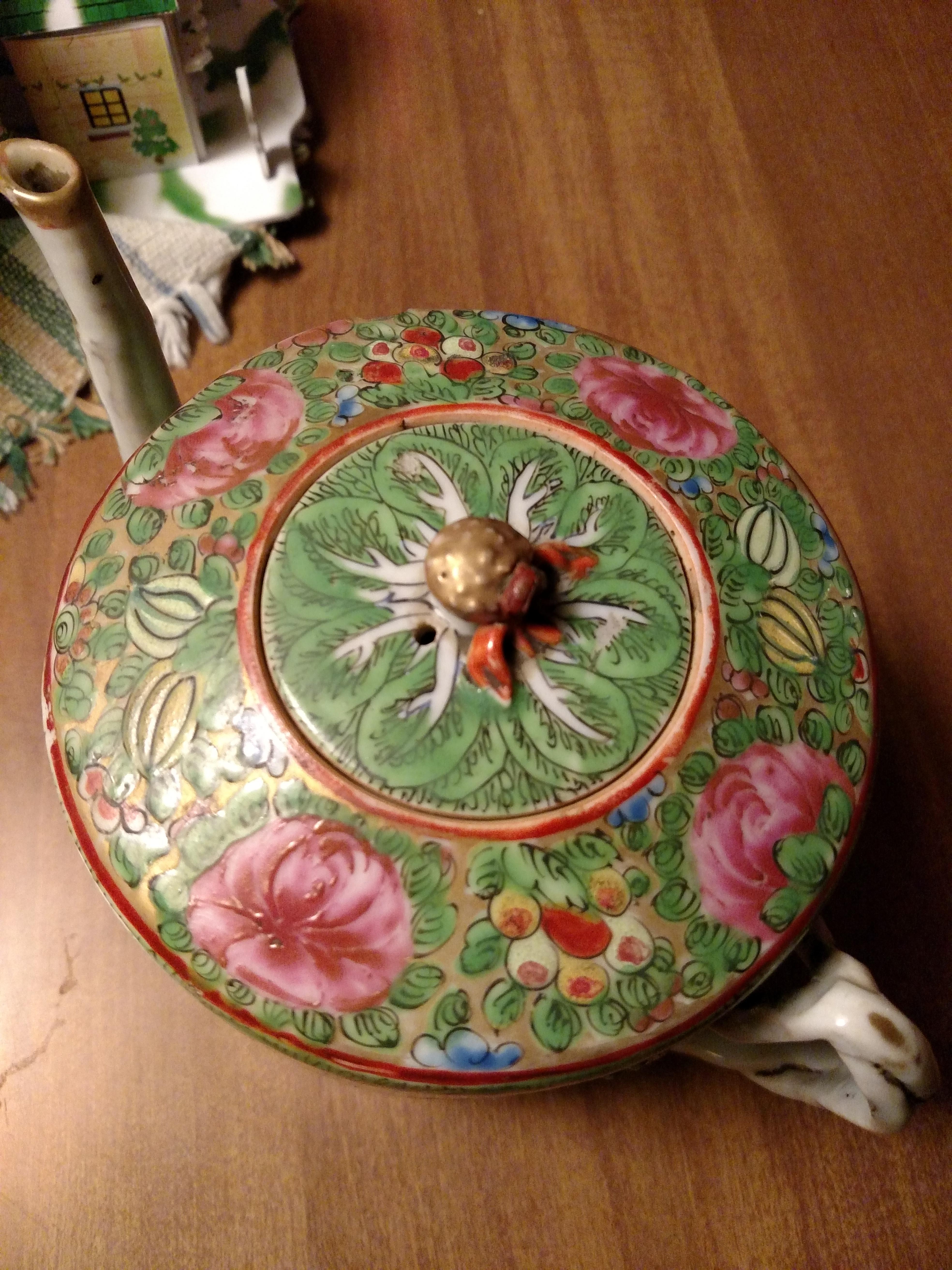 This tea pot has been in my family for several generations. Cabbage design (looks similar to bok choy to me) with multi-colored butterflies. In good condition except for a chip in the glaze by the spout and a few minor spots of wear in the paint. It's about 5" high and 4.5" in diameter (inches). There is a faint "CHINA" stamp on the bottom. It's part of a larger set of matching plates of varying sizes, bowls, tea cups, and a small vase.
