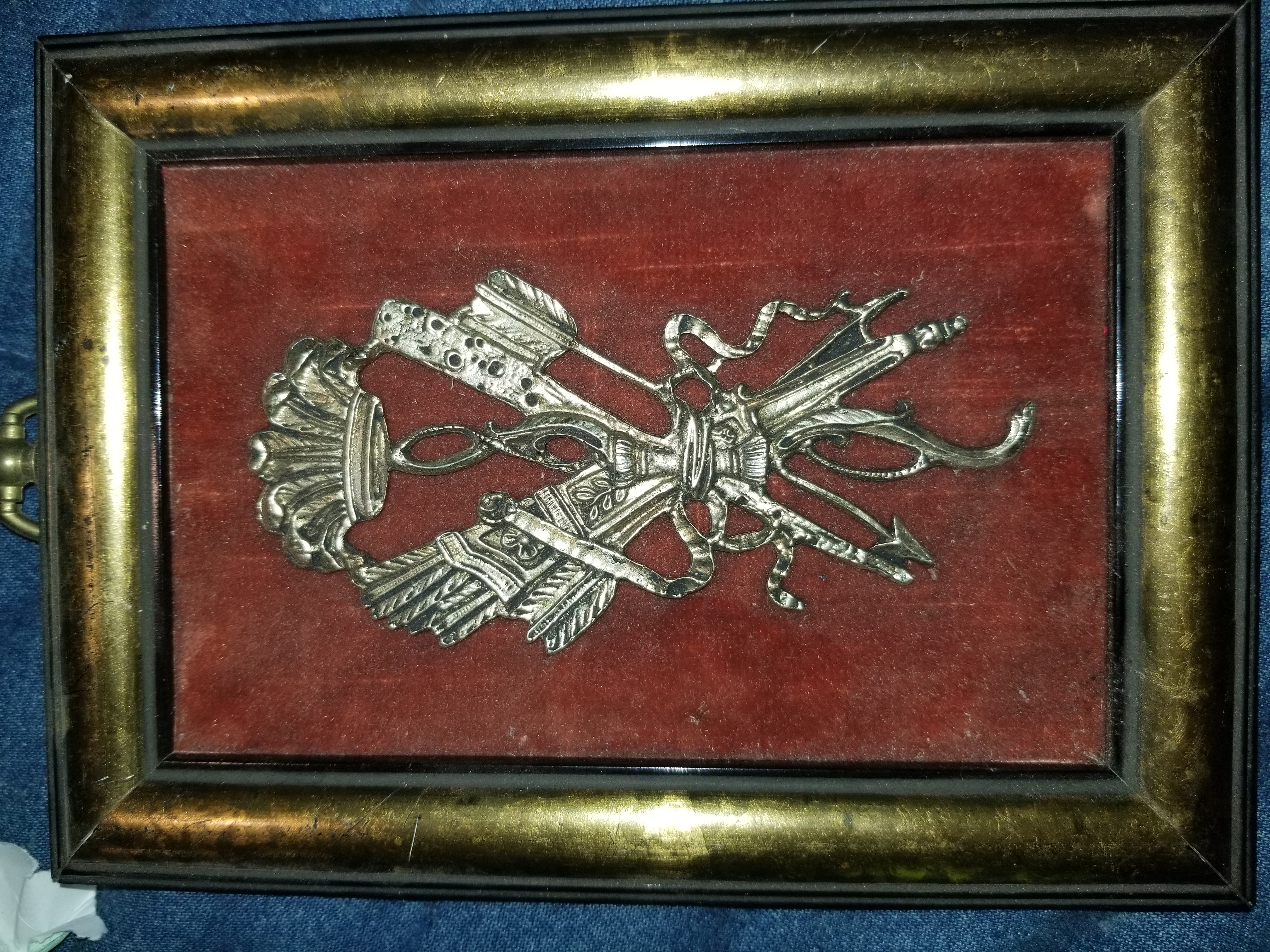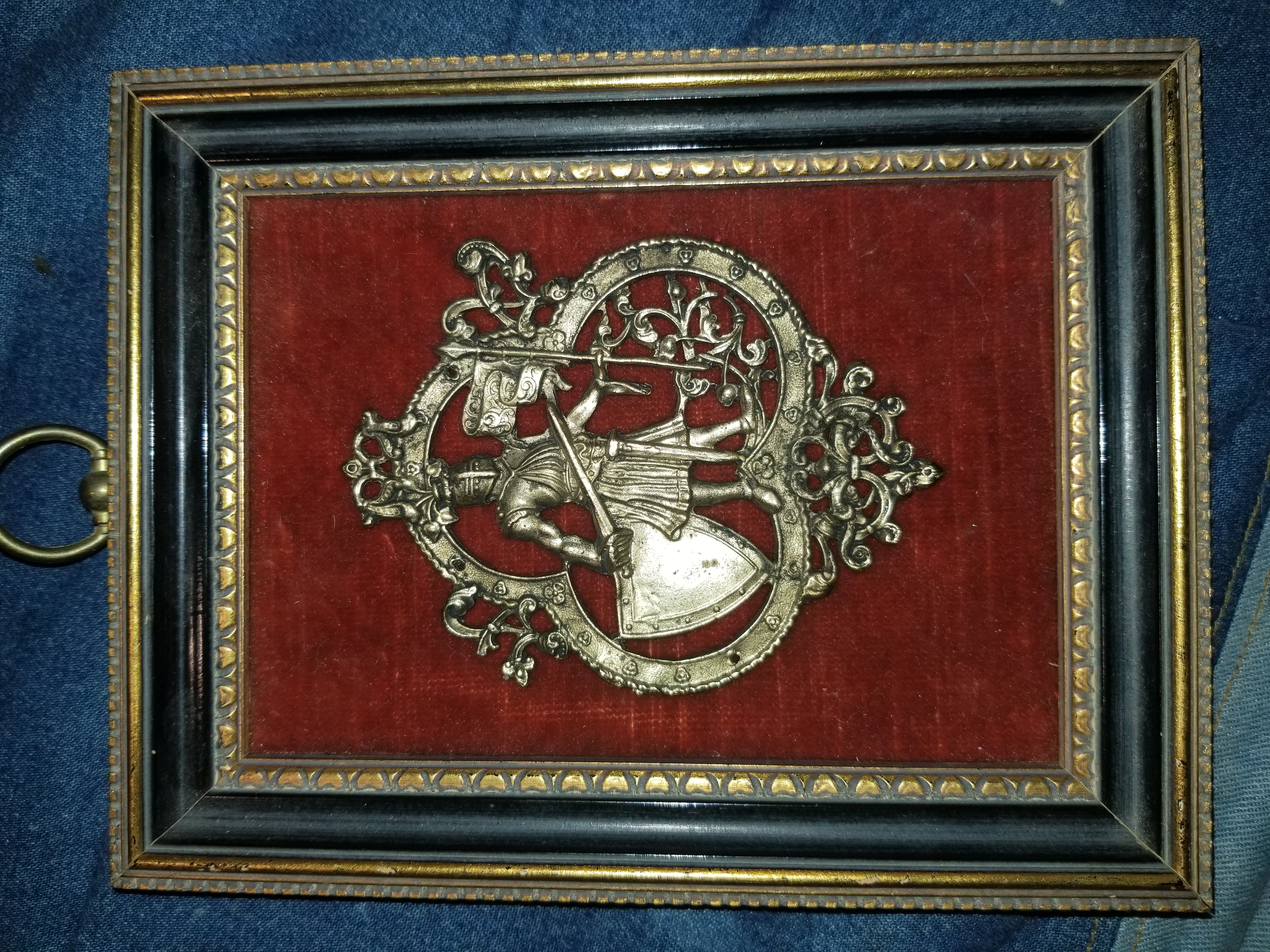 I don't have very much information other than there are 4 pictures of what seems to be Family Crests maybe. They crests are metal and set in the center of a wood frame with red velvet as the background. On the back of the frames, there is a sticker that says [E.A. RIBA CO. INC. BROOKLYN, NY. STYLE NO. 343, 134, 77