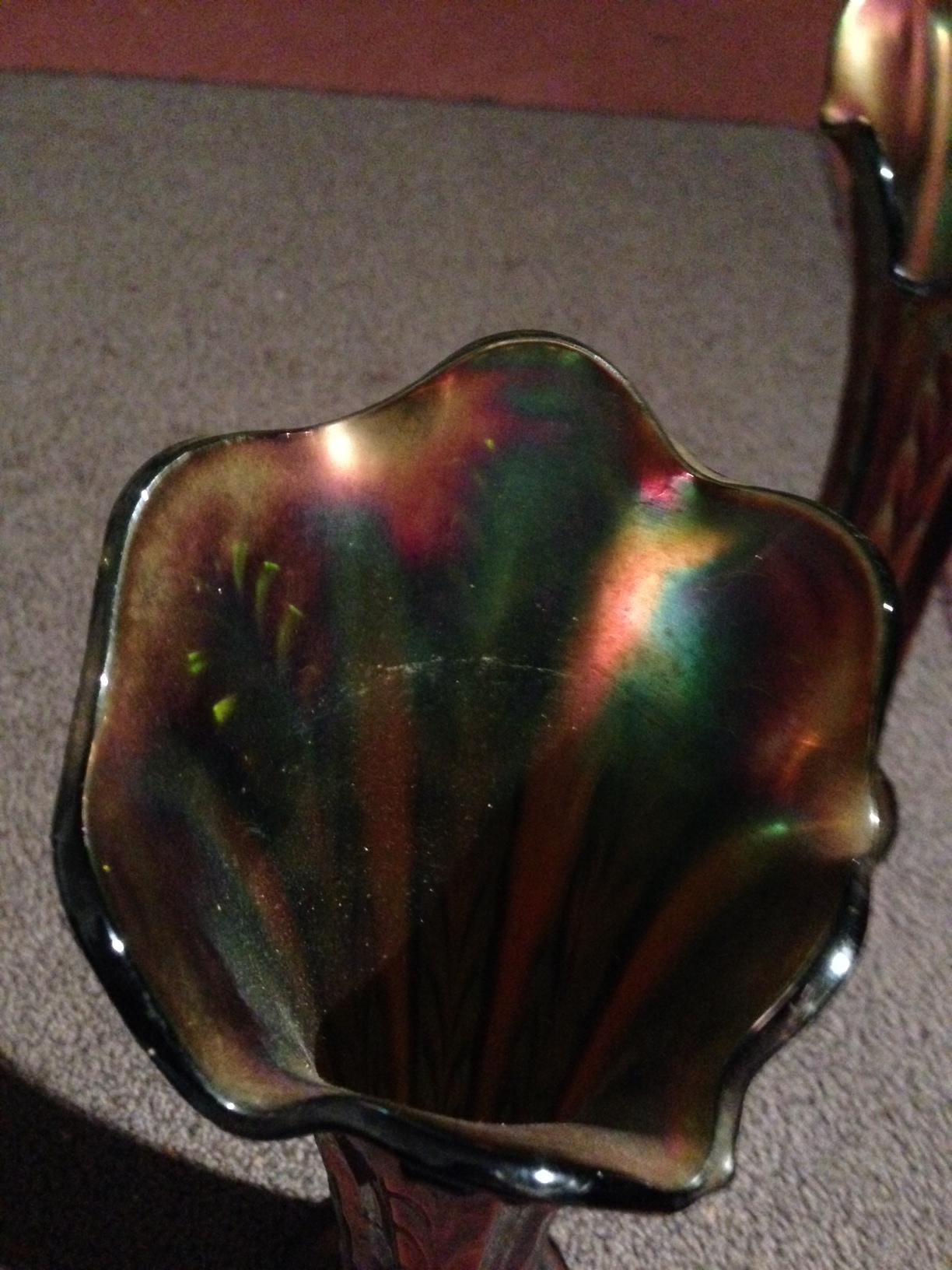 These are Carnival Glass vases, so named because they were often Midway prizes at carnivals during the first quarter of the 20th century. They were also reproduced in great numbers in the 1980's when values for the original climbed dramatically. Not a great deal of demand for them currently though, examples like this now go for less than $50.00 each at auction.