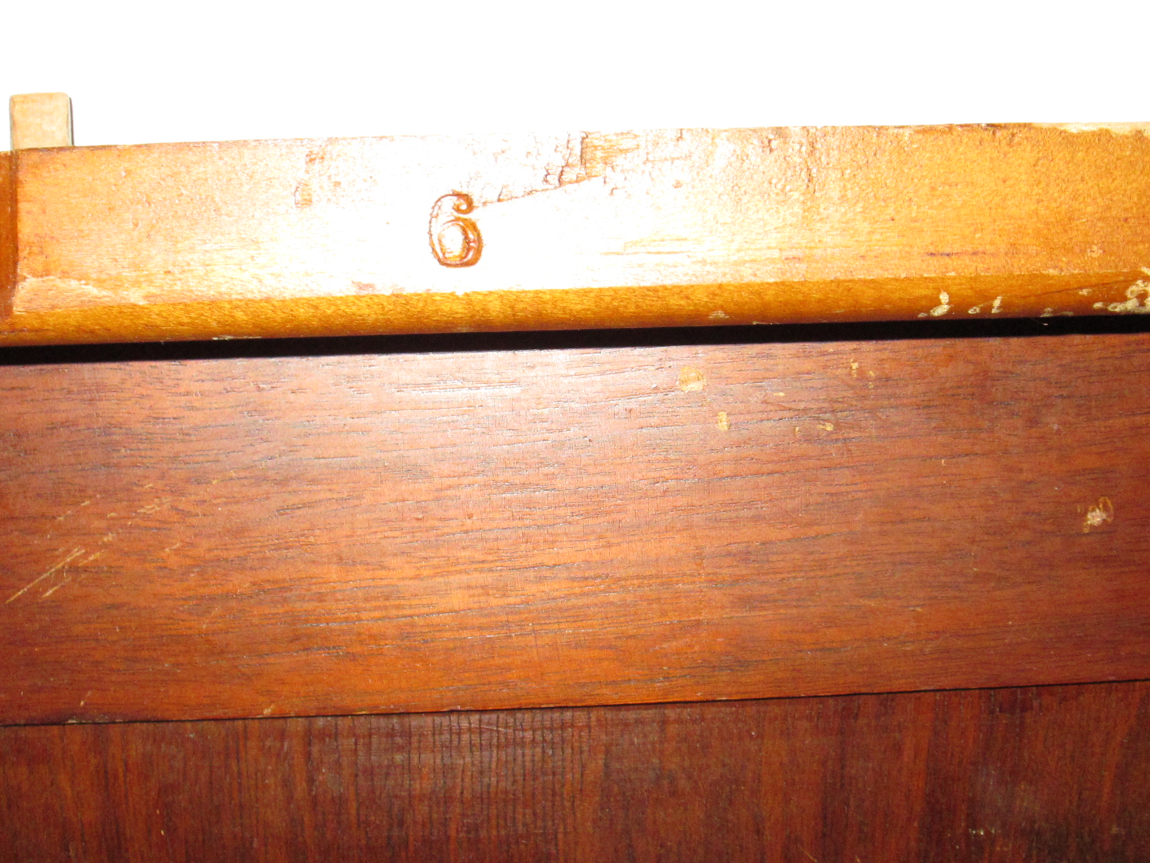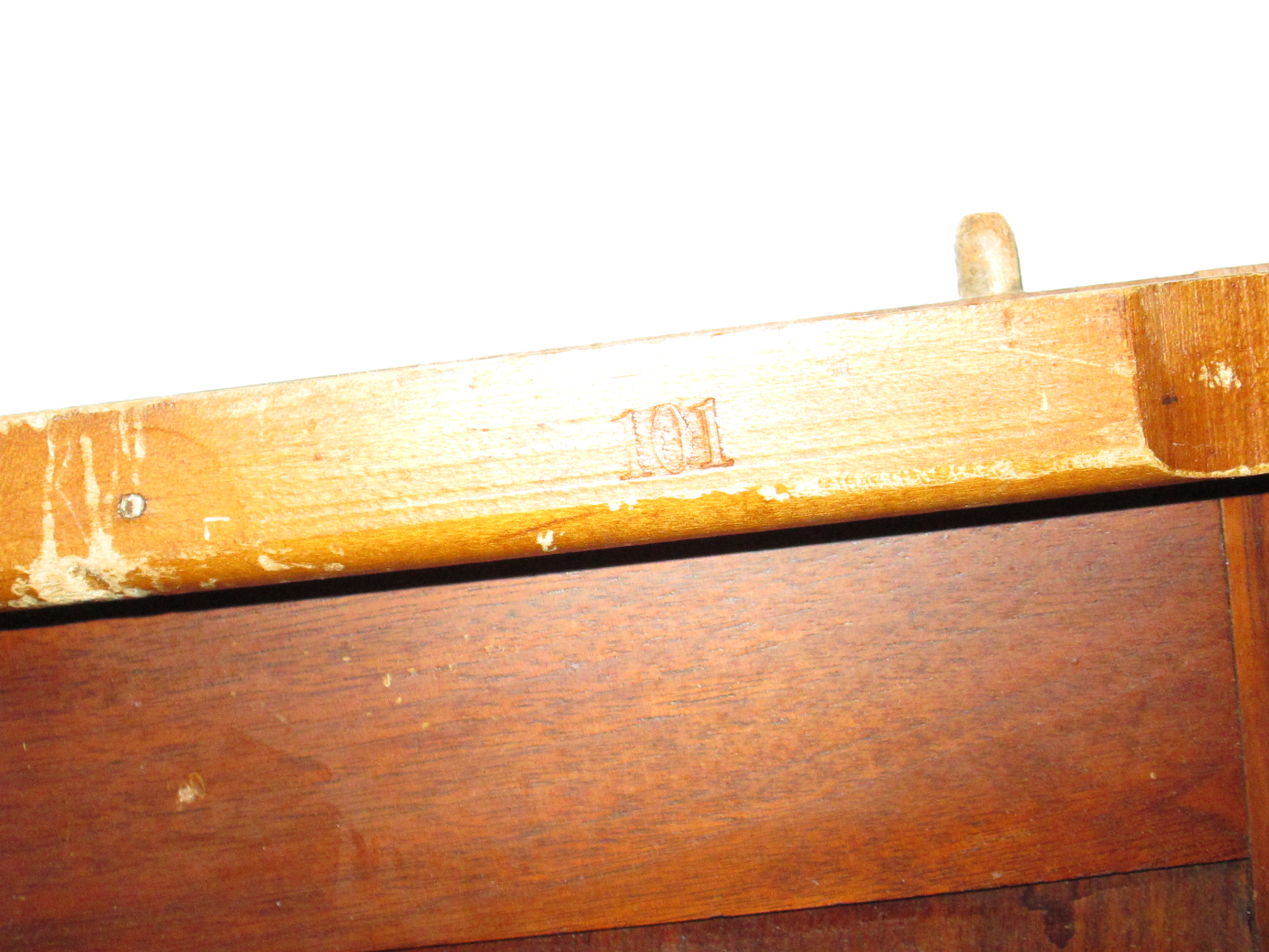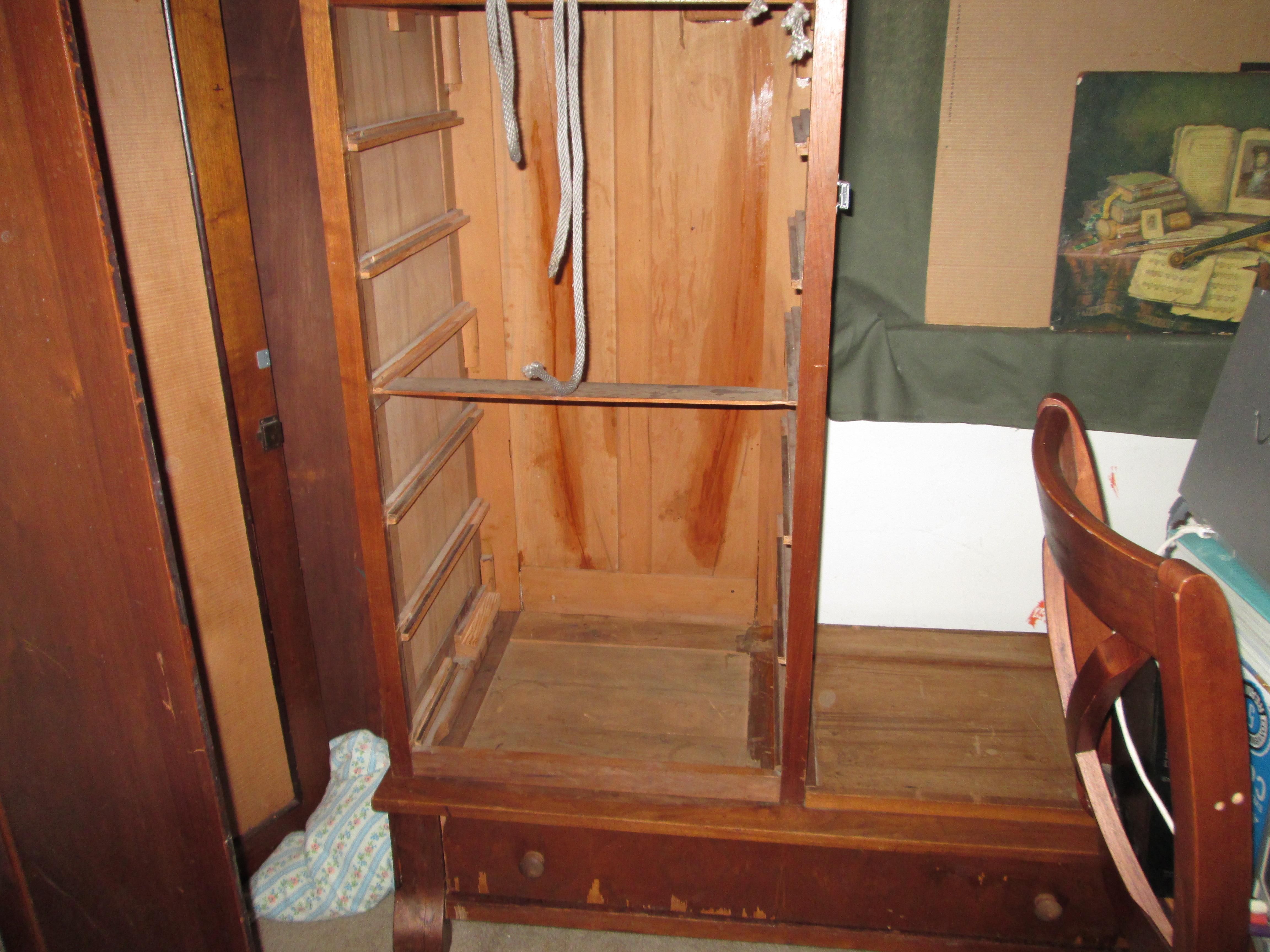 The wardrobe comes apart can be easily broken down into several pieces, but because of its age it is starting to fall apart. There are several metal pieces that go into slots that actually lock the different wood pieces/sections into place. The original metal coat hanger still exist inside.