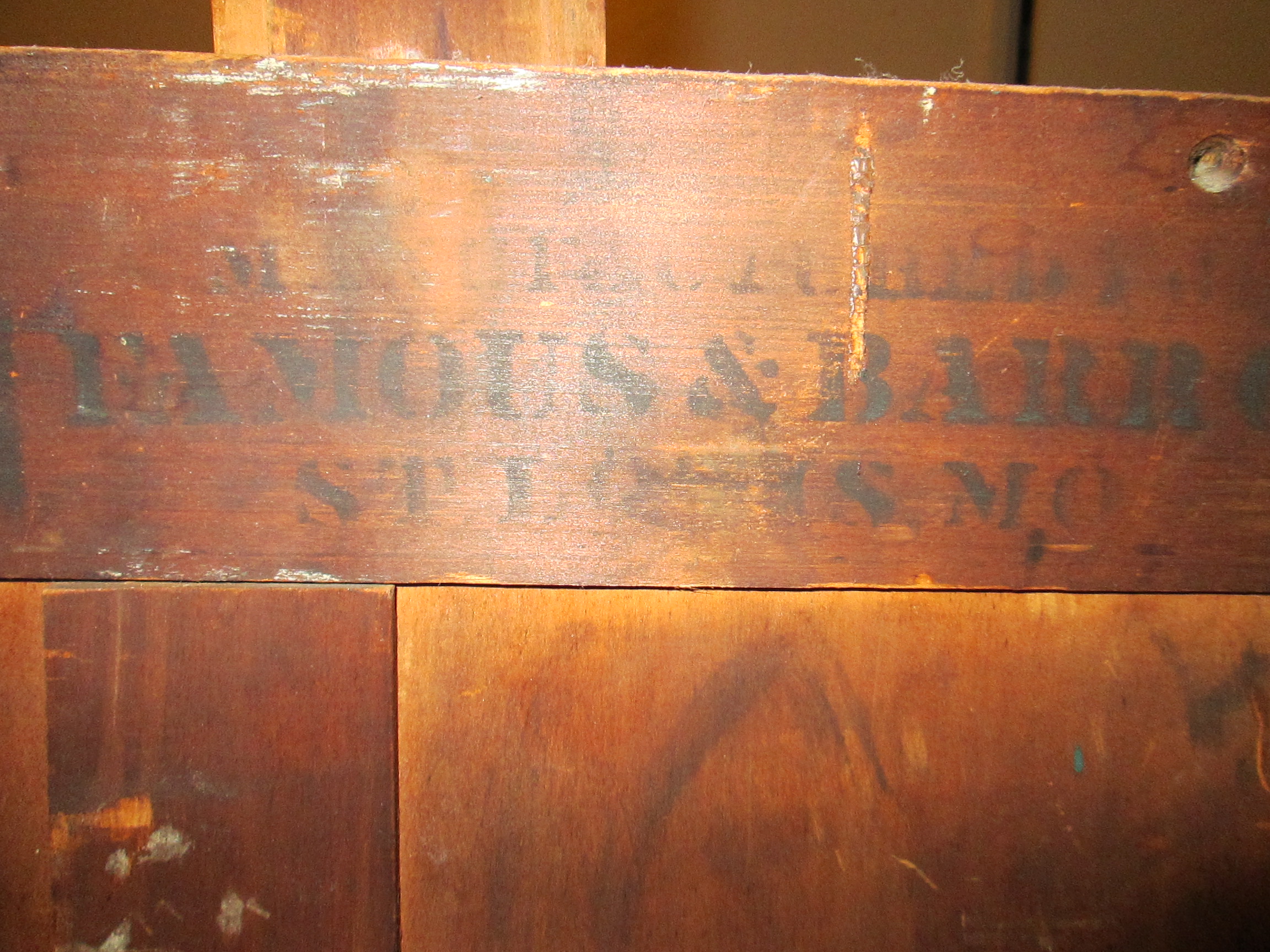 I can make out, what appears to be like a charcoal looking black stamp- the words - "Famous and Barr co - St. Louis, MO, and also has since faded away some- stamped on the back "Made Exclusively for Macy's" and there is some other writing that is too faded in an area and I'm unable to make out all the letters or the complete words.