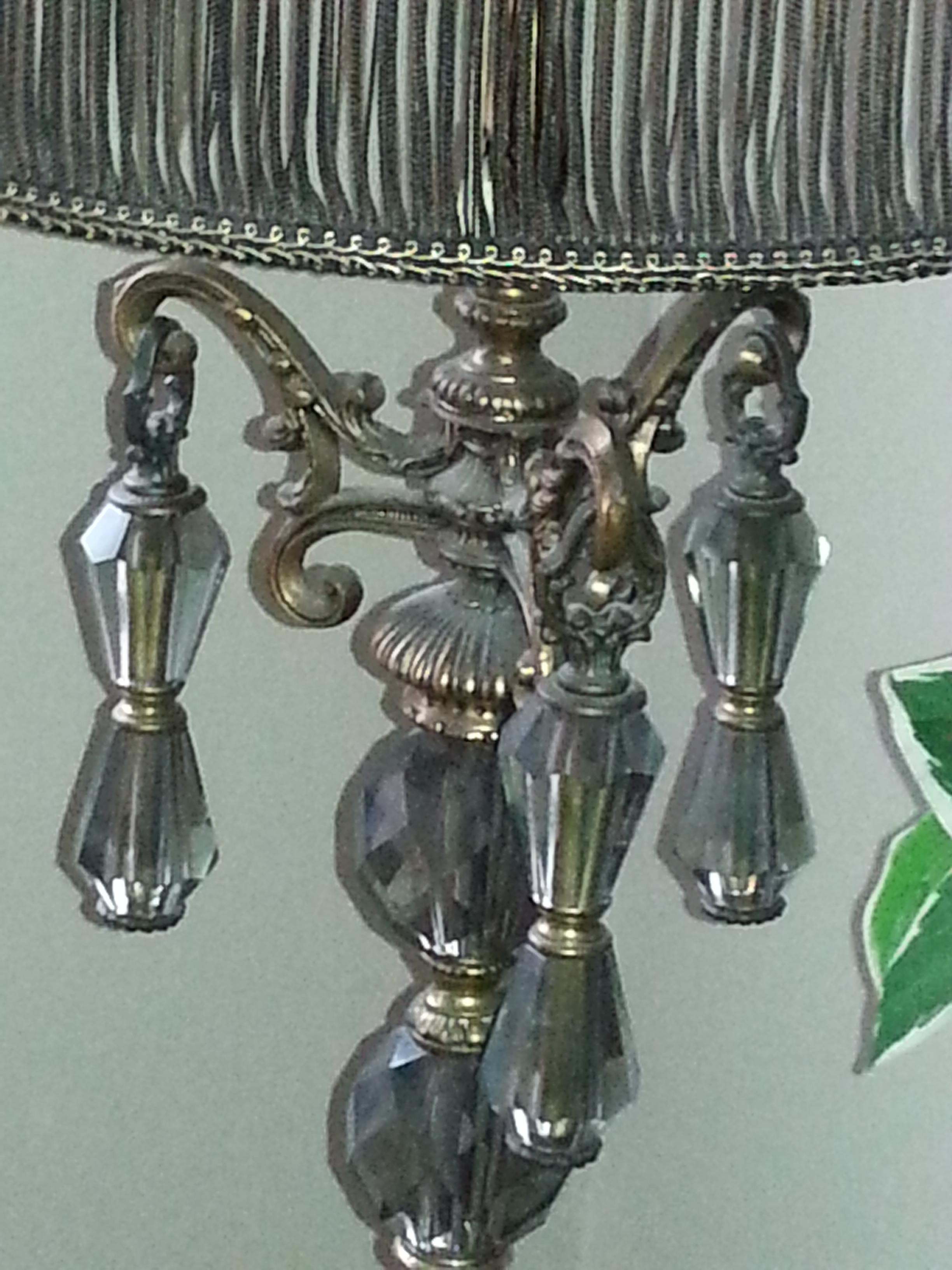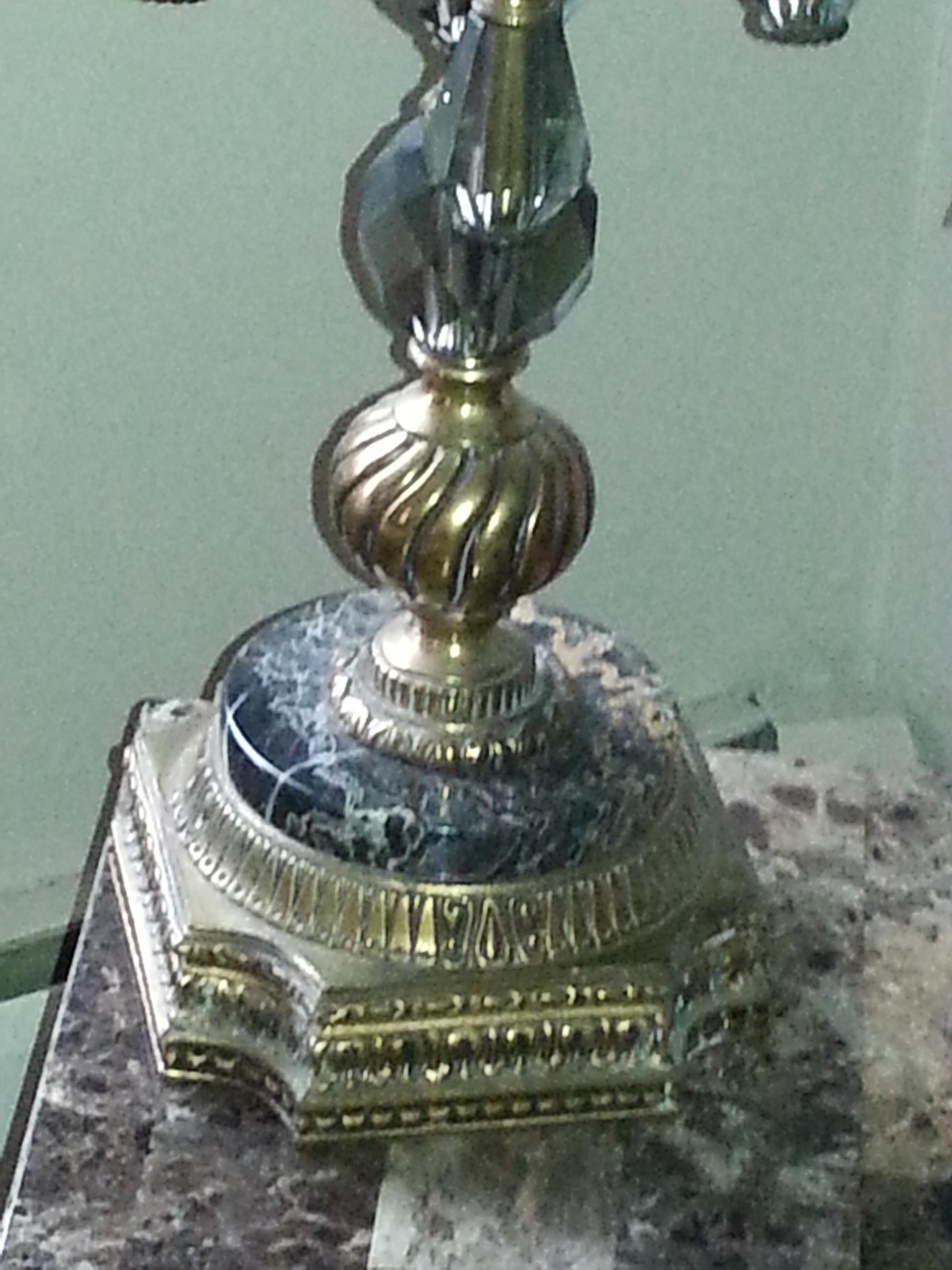 the lamp appears to have marble on the base as well as brass and smoke crystal its heavy and it has the original shade the shade has faded due to time and probably sun exposure but on the shade there is gold type threading around the base
