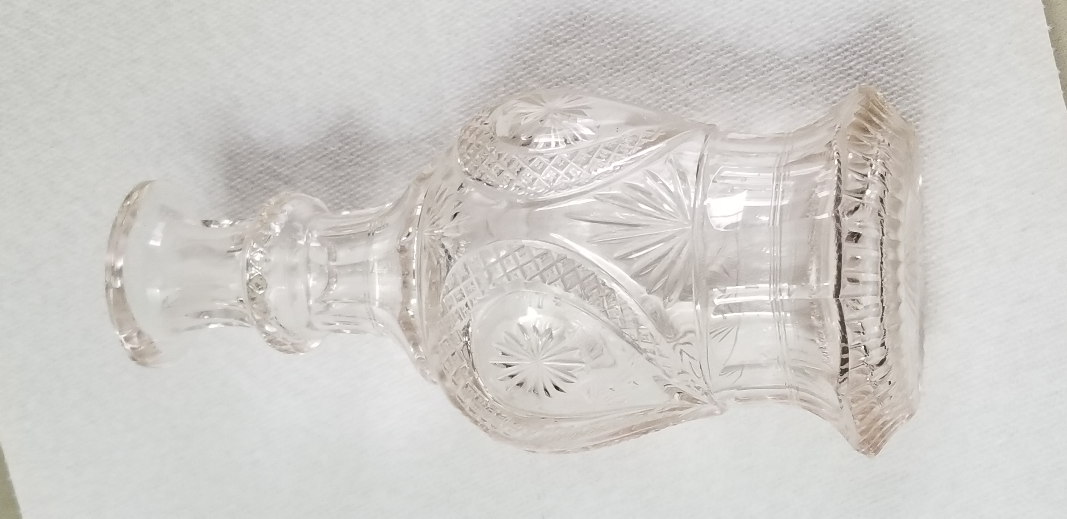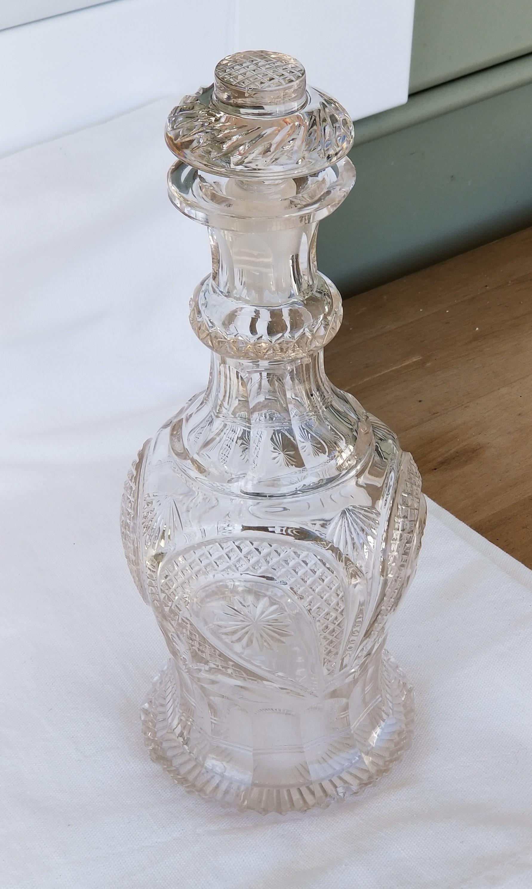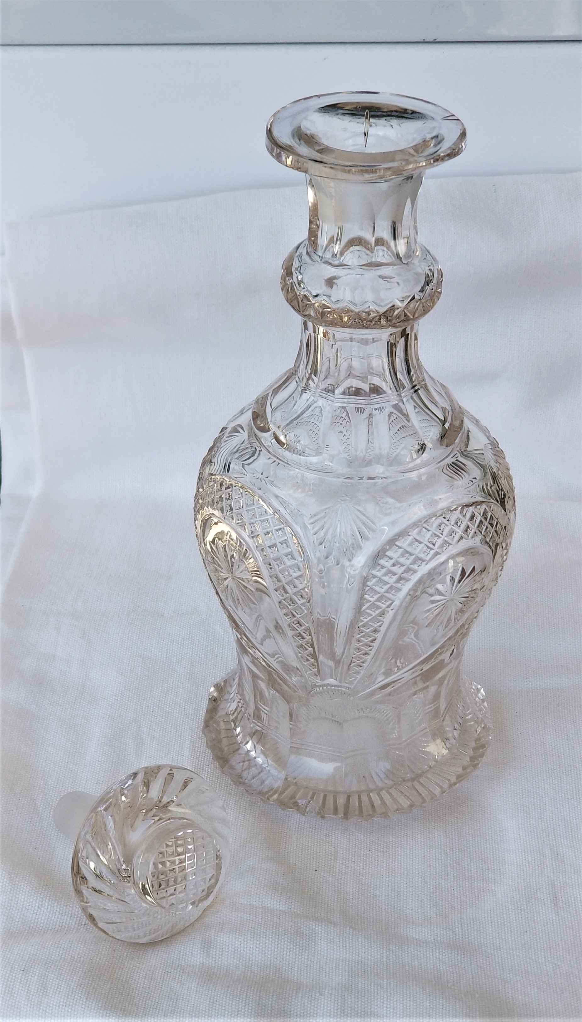 10" tall with stopper. I purchased this decades ago from an elderly (Irish?) lady in a wealthy shore town. It has a beautiful brilliance/clarity and nice cutting. The only imperfections to note: on the 'skirt' a small flake on one of the ruffles. A couple flea bites around the same. A slight speck of mineral? in the neck that shows a tiny amber color. I am clueless as to origin,date, value, even possible maker. It is beautiful.