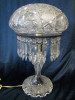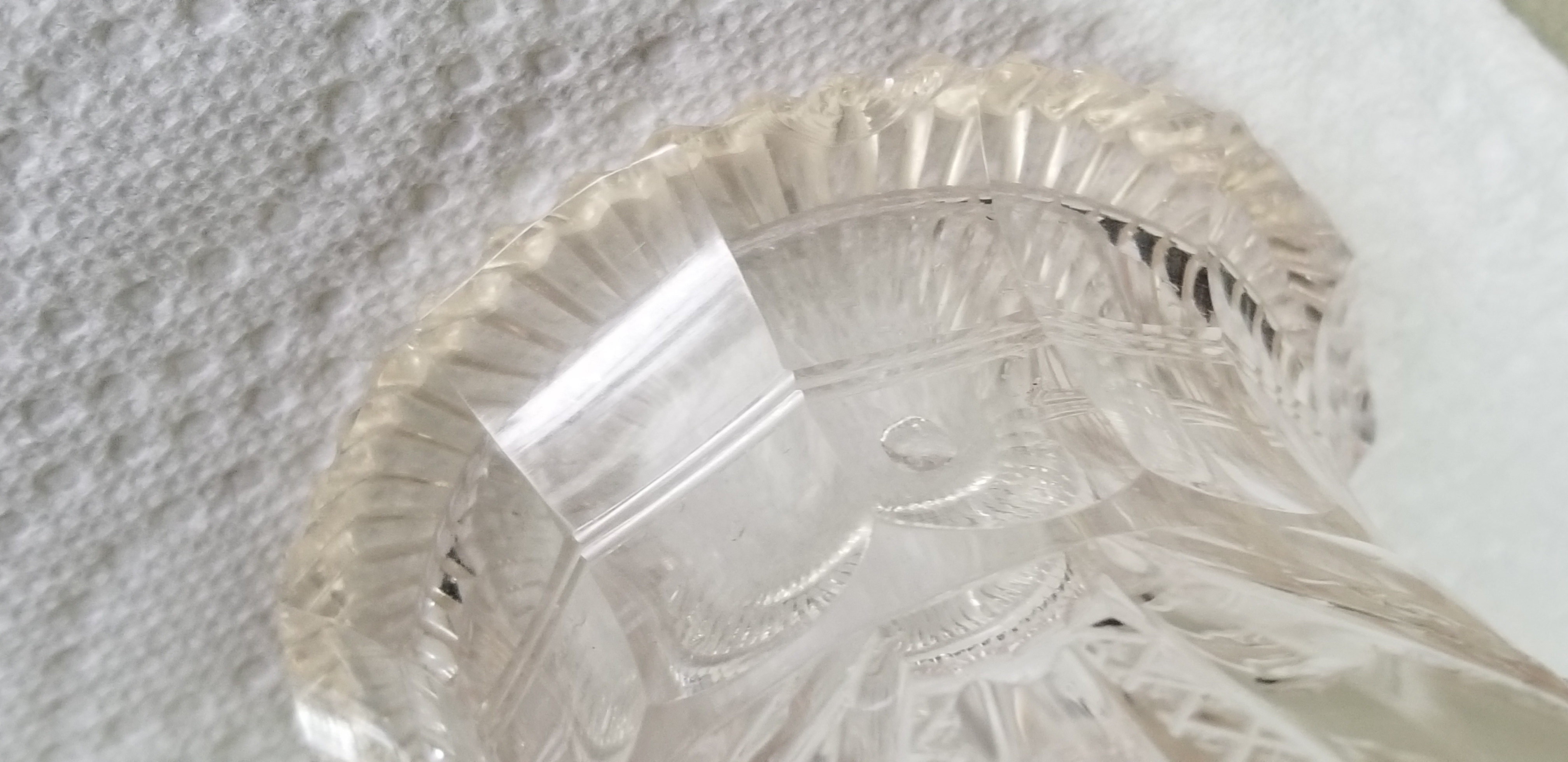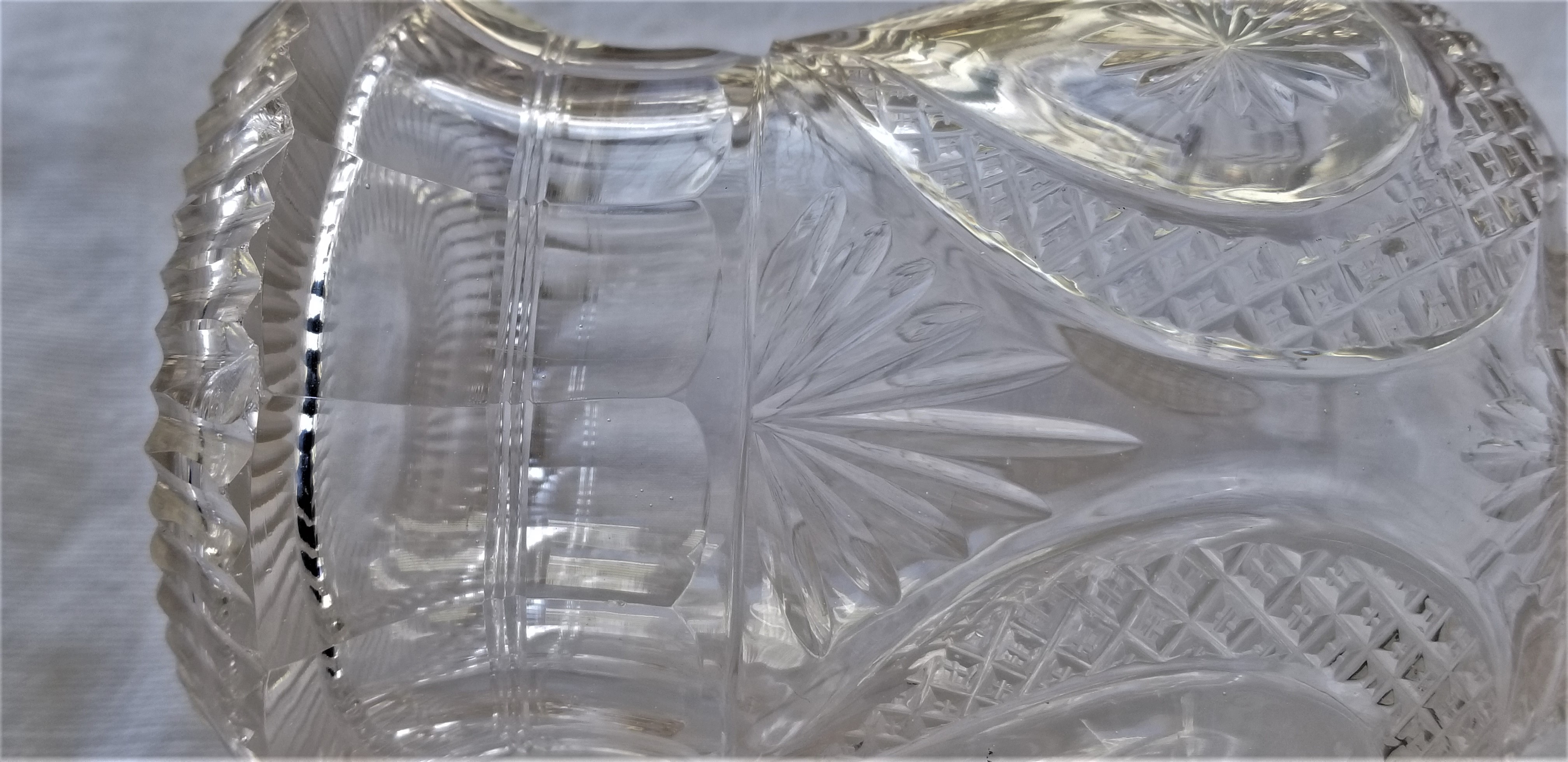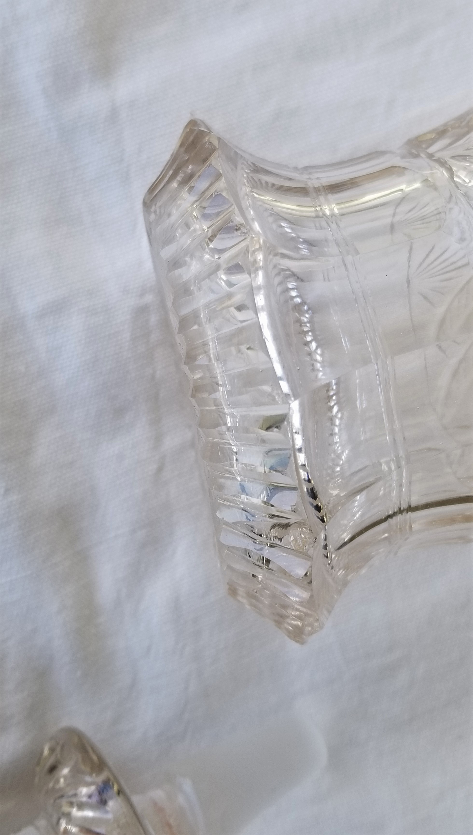 10" tall with stopper. I purchased this decades ago from an elderly (Irish?) lady in a wealthy shore town. It has a beautiful brilliance/clarity and nice cutting. The only imperfections to note: on the 'skirt' a small flake on one of the ruffles. A couple flea bites around the same. A slight speck of mineral? in the neck that shows a tiny amber color. I am clueless as to origin,date, value, even possible maker. It is beautiful.