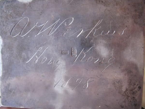 The best description would be a photograph, which I will be attaching. I have been unable to identify the mark. I went to the 925-100 website to attempt identification but have not had success making a post. This is a small silver box engraved "A Werkhuis Hong Kong 1898." I would possibly be interested in selling the box but I am not sure at this point. Any information as to the mark or the value would be greatly appreciated. Thank you! Christine