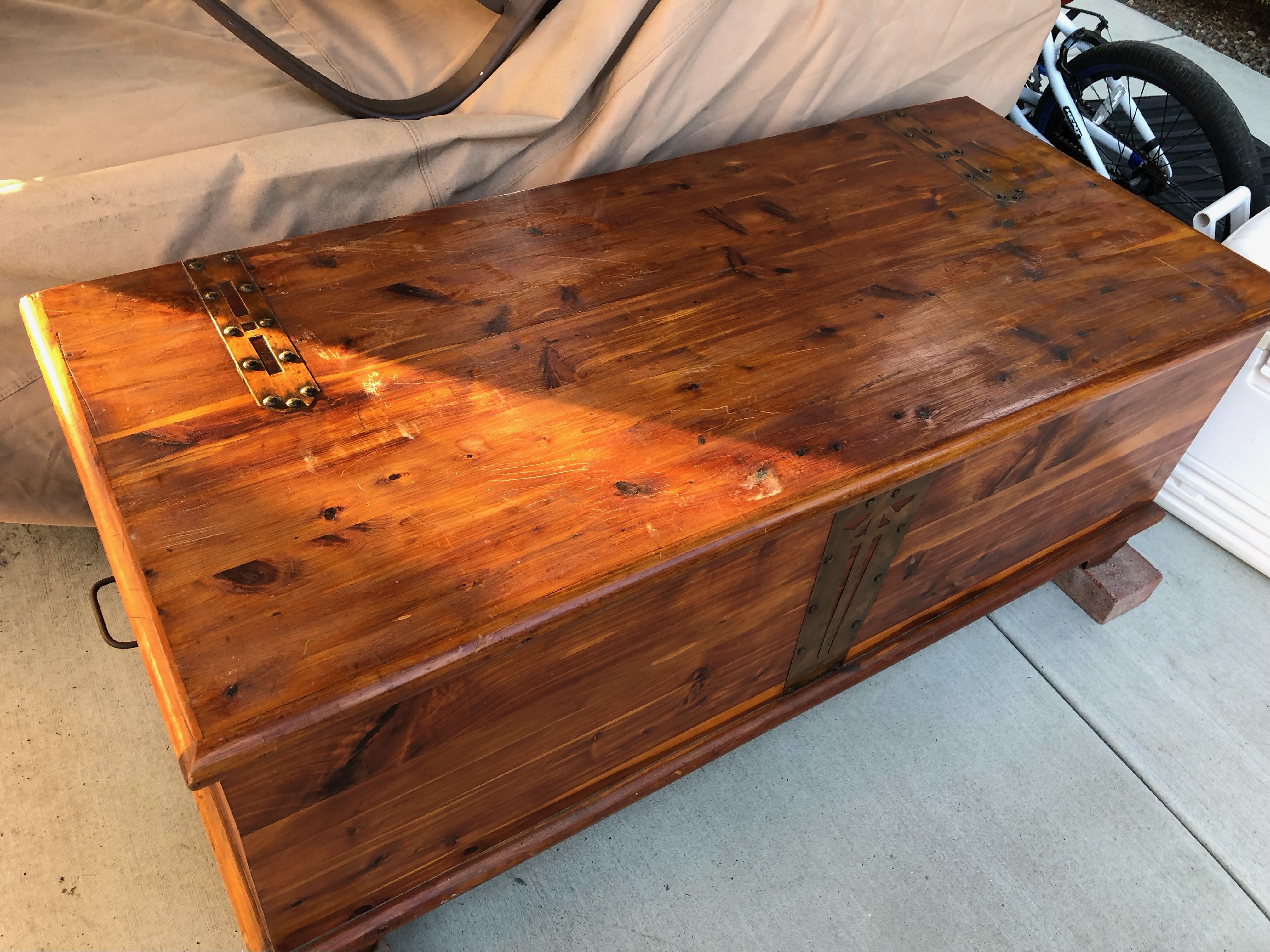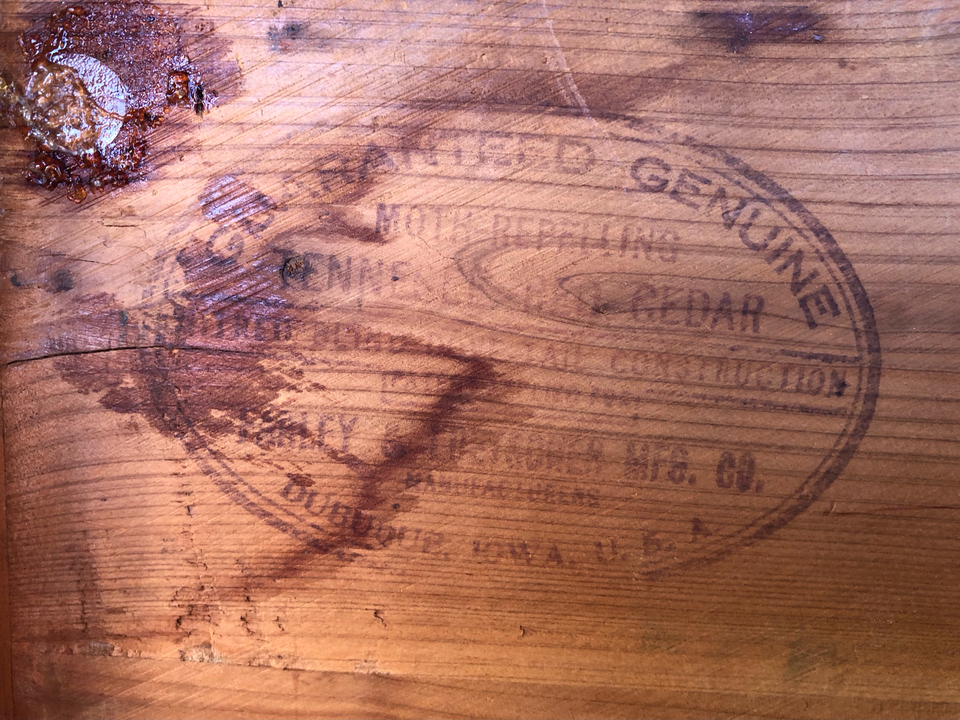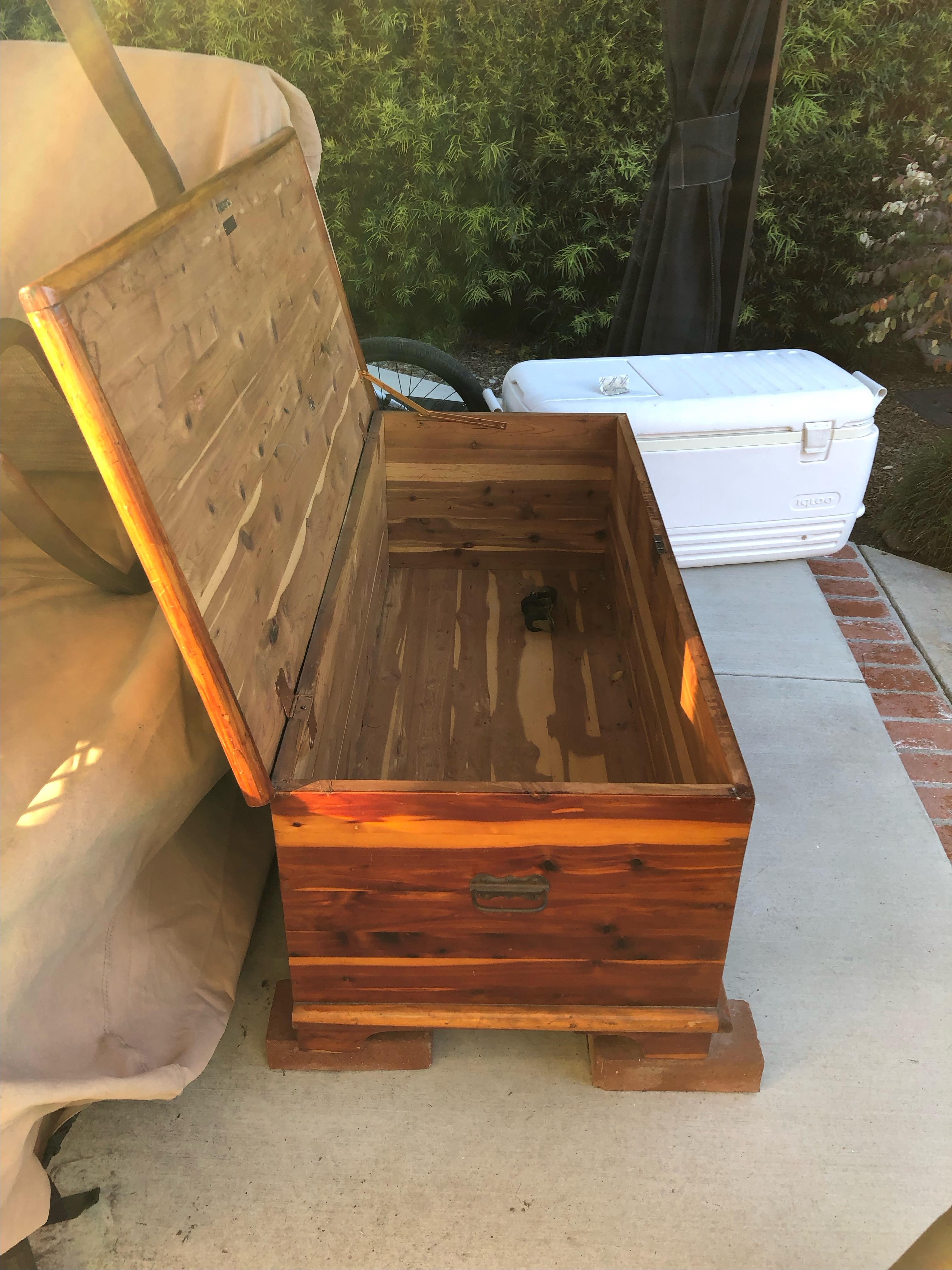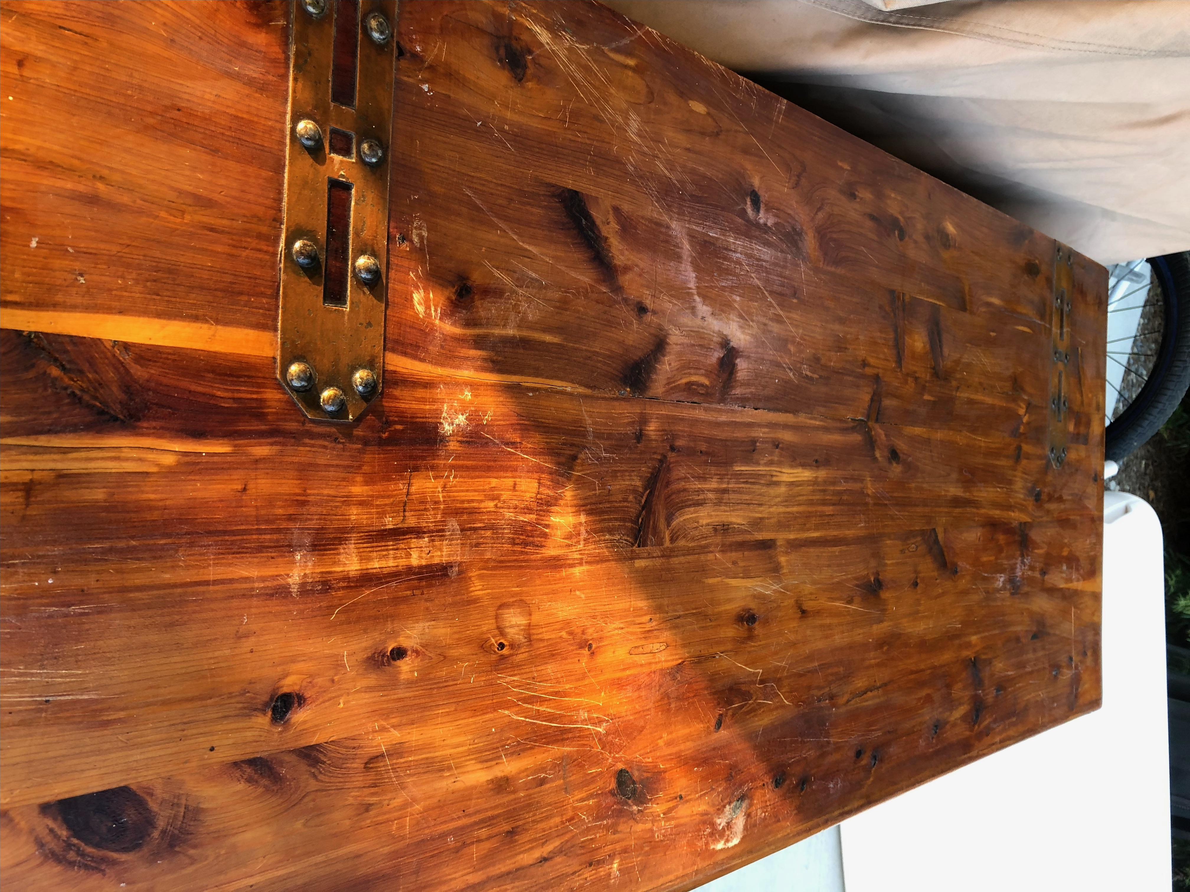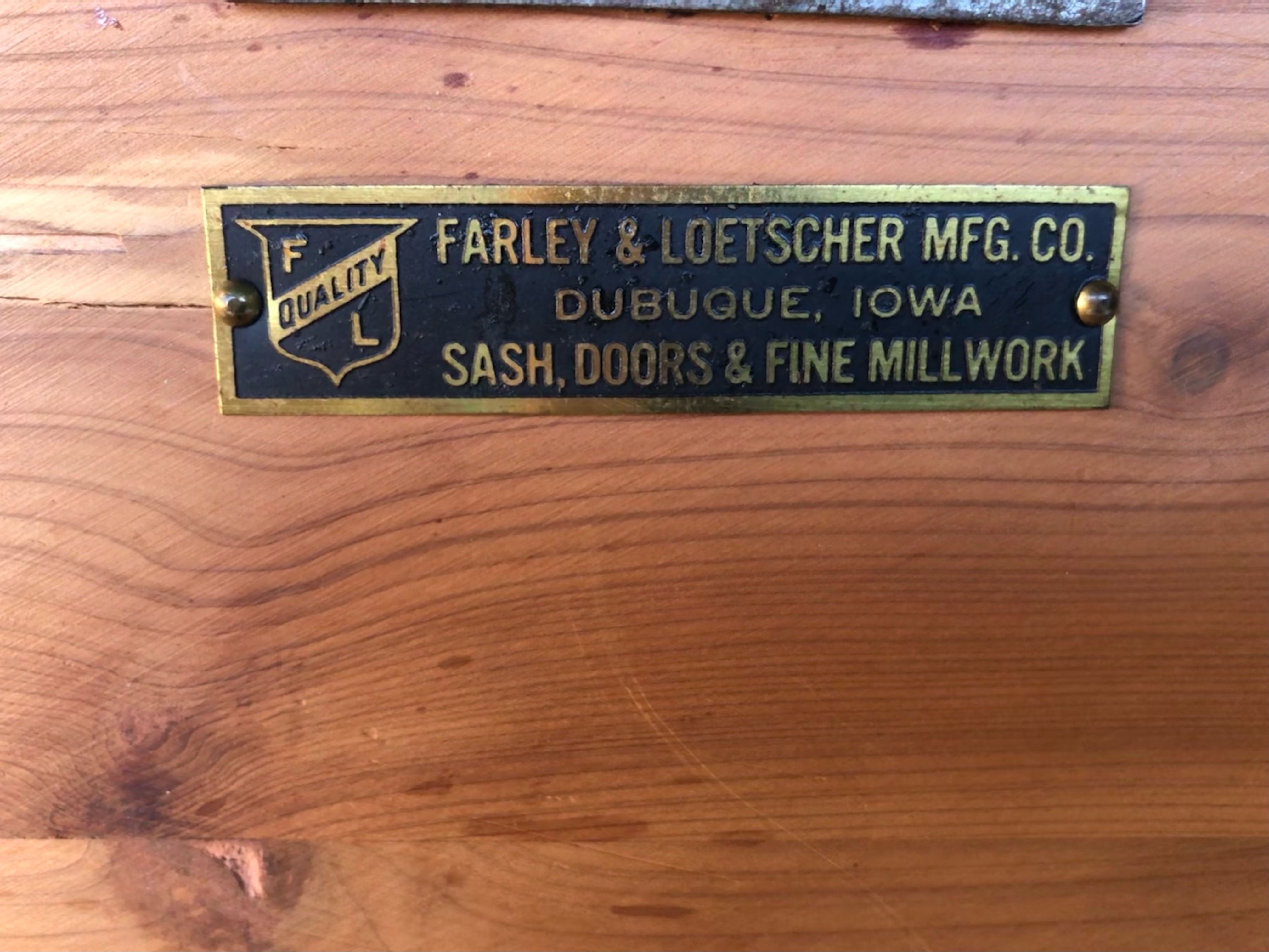 Early 1900's Farley & Loetscher Cedar Chest with copper hinges and front lock plate. Metal tag inside lid reads " Farley & Loetscher Mfg. Co., Dubuque, Iowa". Maker's stamp inside lid. Some scratches on the top but very sturdy condition. Missing one wheel.