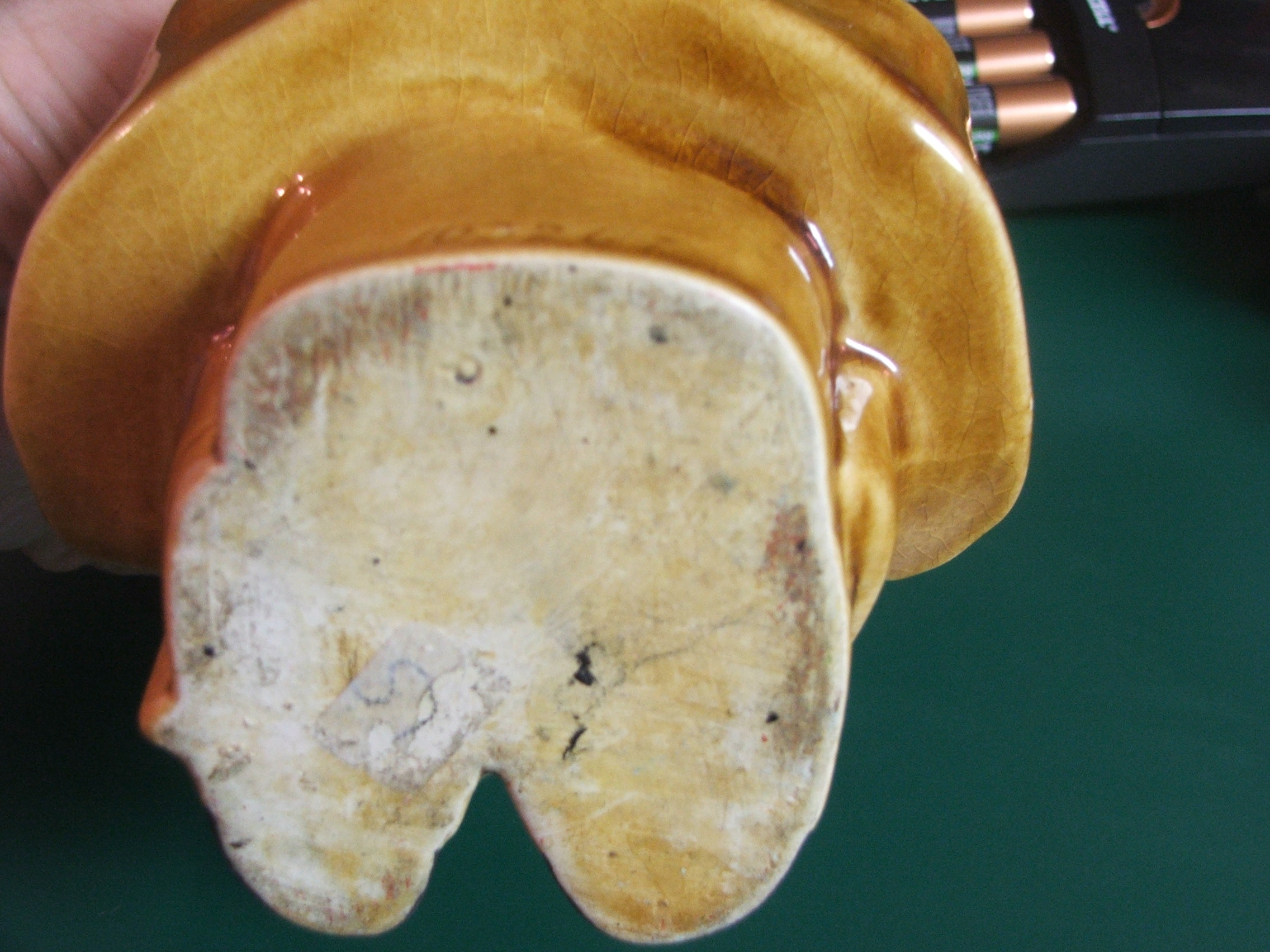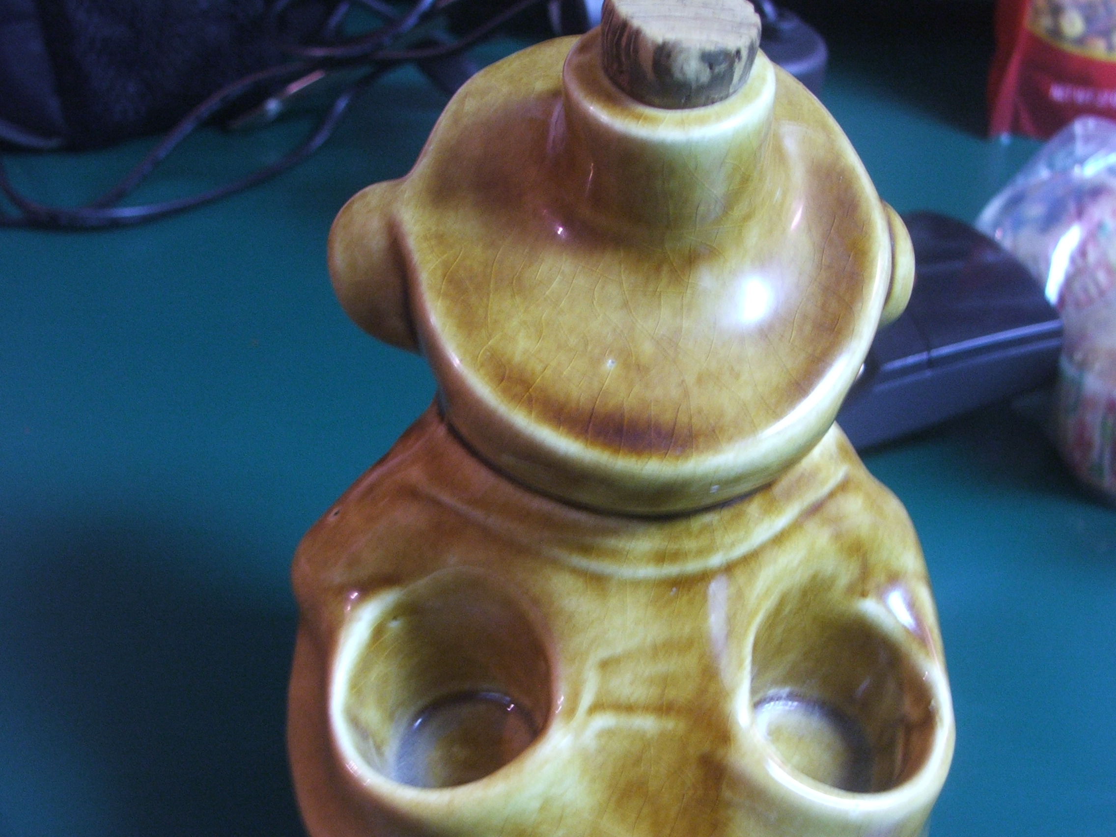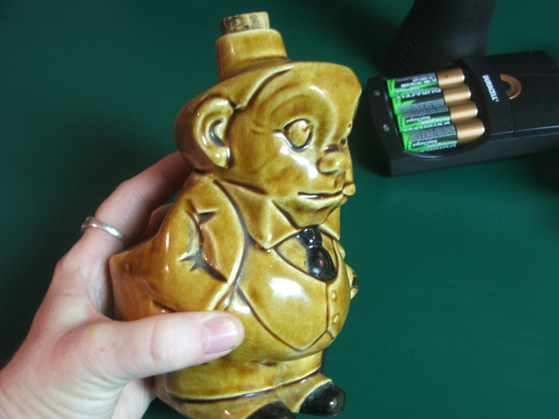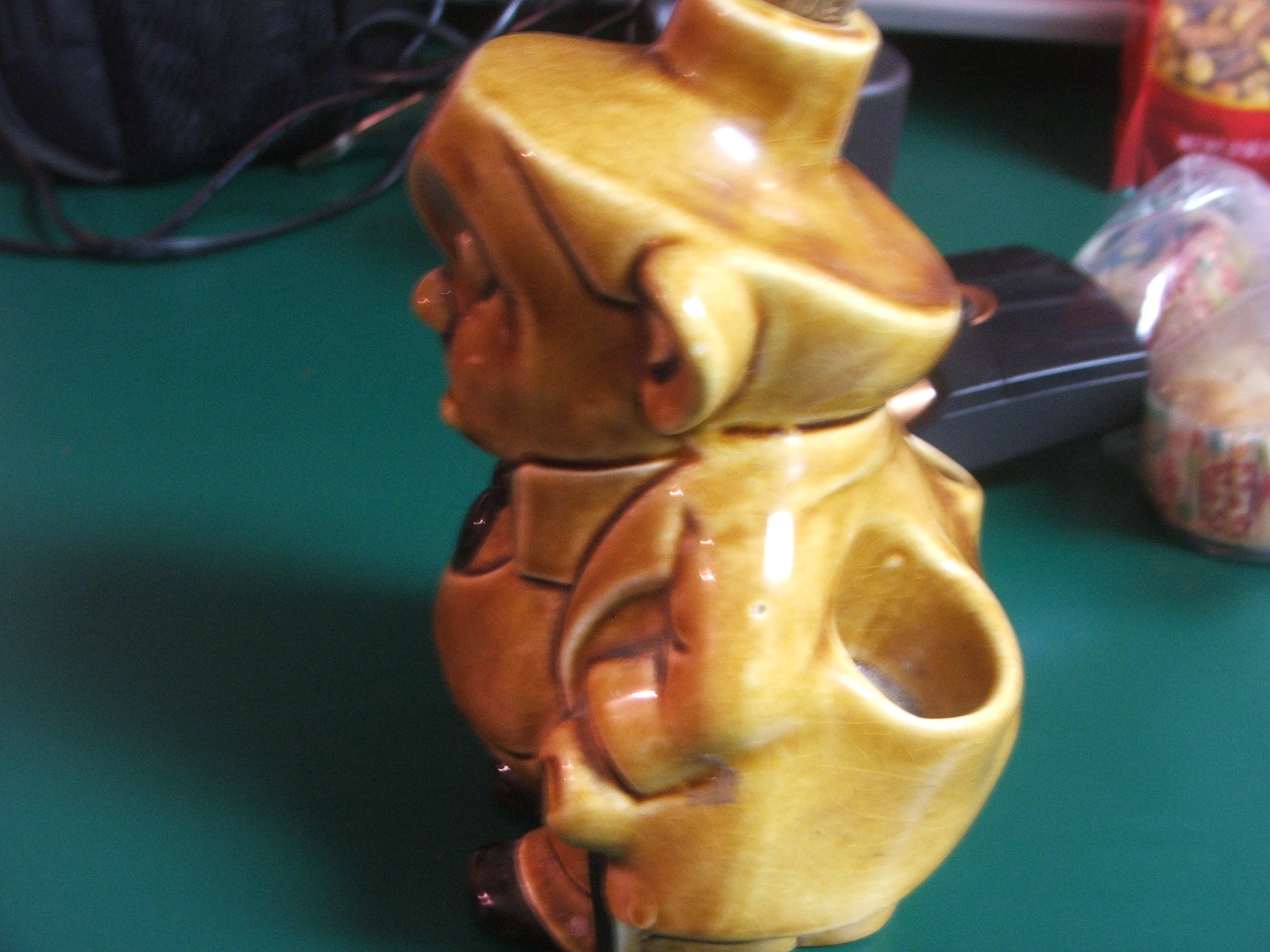I have a ceramic cantainer of sorts depicting the character "Father Jiggs" from the old comic Bringing Up Father. I am not really for sure what the container its...it is like a jug of sorts has a cork stopped rim at top, upon removal of the cork not odor is present inside...the back side has two holes to hold some object. The depiction is Jiggs standing with one hand in his pocket, one hand holding a cane and a cigar in his mouth. The container is 6" tall (not including the height of the stopper top) , napprox 5" across and about 4" deep. It has the number 10326 I on the backside. It is in very good conditon, no cracks or chips...we wonder if maybe it is supposed to have a top piece to it maybe...not sure.