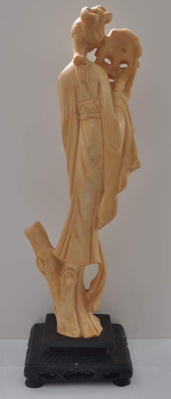 The statue seems to be holding a shost mask.. Seems Japanese to me.. Any information anyone has re the value or history of this peice would be greatly appreciated!!