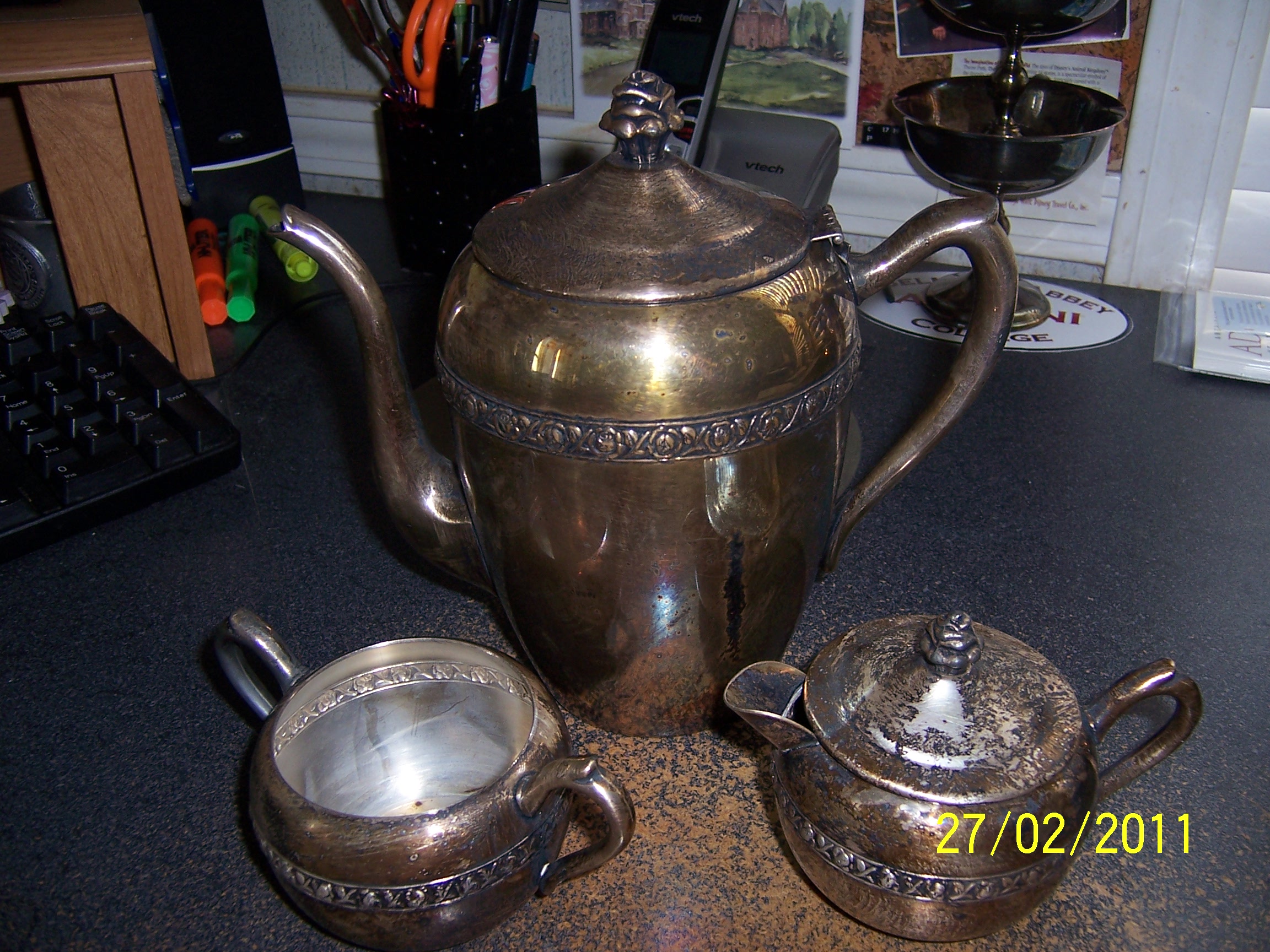 FB Rogers 1888 Silver on copper tea set. Set includes 8" teapot, 3" sugar bowl, 3-1/2" creamer. In need of cleaning.