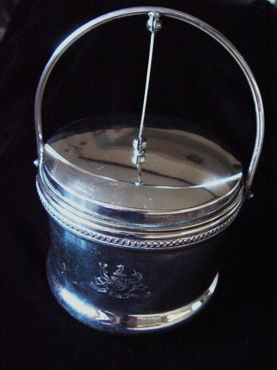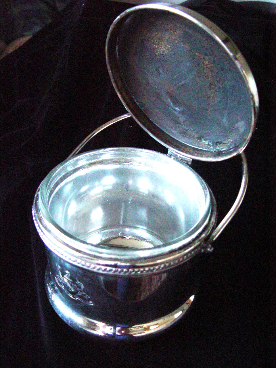 Ice bucket with hinged lid. Pyrex glass insert with silver coating on the exterior.