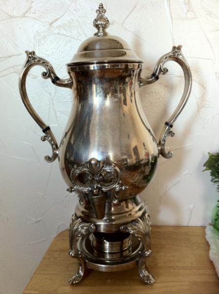 Two Handles and a pourspout in front of this beautiful Silver Tea or Coffee server. Made by FB Rogers Silver Company circa 1883. It has an area below the carafe for a coal oil heater from the day. Coal oil heater can is with this item and can be seen in the lower rim section.