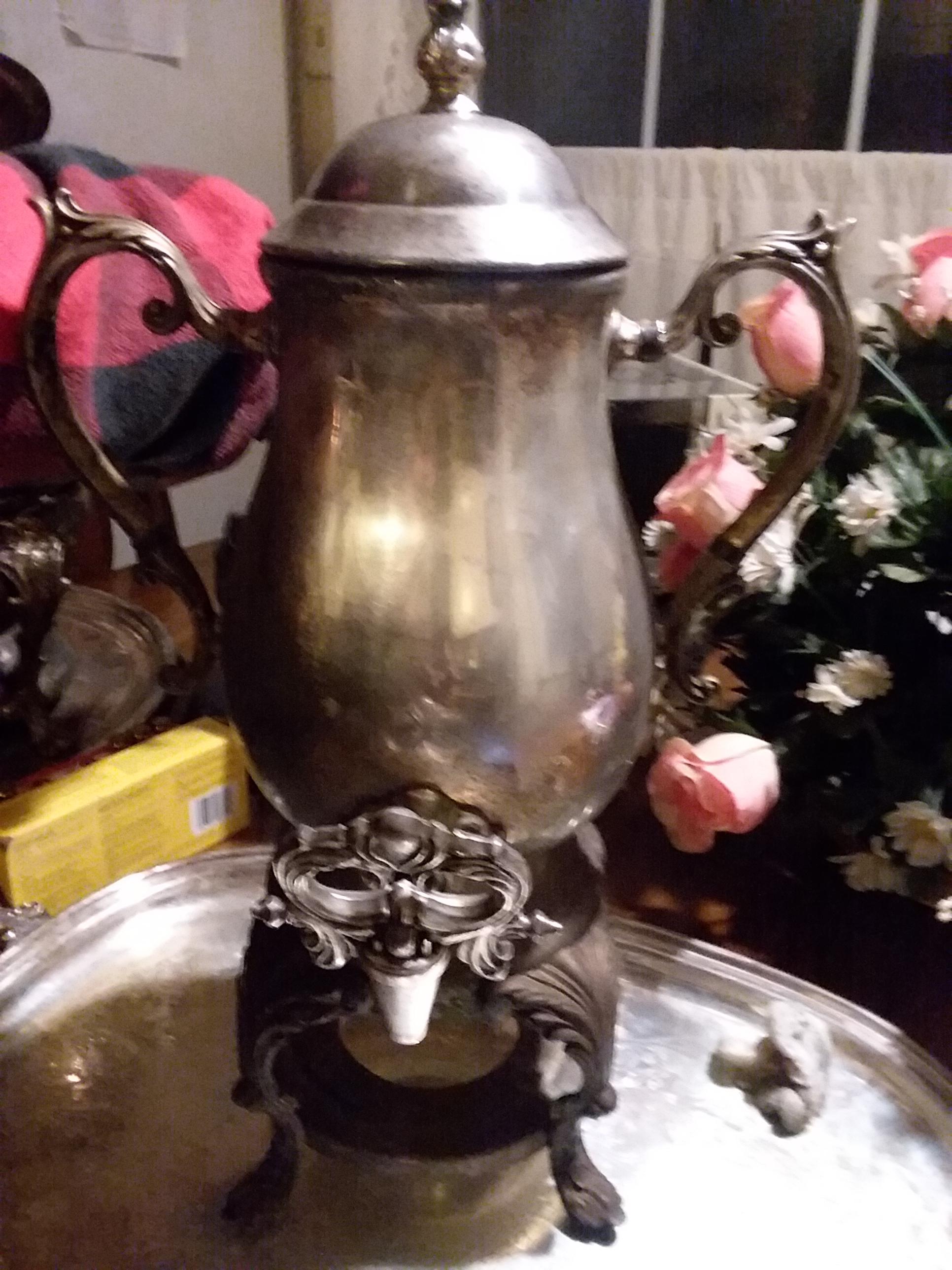 This piece is silver plated. If I had a good picture of the hallmark I would be better able to pinpoint the time frame of its making. If I had to guess I would estimate 1925 - 1935's. I saw a piece on ebay like this but they are off on their dating. This would be called a Coffee / Tea Urn Samovar (Russian for Water boiler)