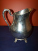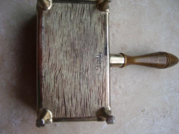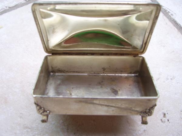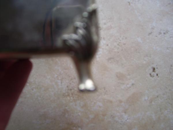 I just bought this today and it is very heavy. It has a nice code of armor on the top of the silver piece, it looks like a deer/buck with antlers on the left and a horse on the right. Wood handle. It says F.B. Rogers Silverplate underneath. I think the person I bought it from was using it as an ashtray because it smells like smoke inside.It is a beautiful piece, I've never seen anything like it before. My scale says it weighs a pound but It feels like it weighs more.