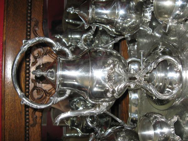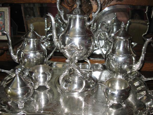 I have a FB Rogers with "Trade Mark", the crown, 1883, FB Rogers Silver Co. stamped on all the pieces. However, there is no pattern number stamped on them. I have the coffee pot with the stand that tilts and the burner, 2 different sizes of tea pots, a sugar, creamer and other server (look like the creamer without handle) and the large service tray they all sit on. Can you help find what they are and the value?