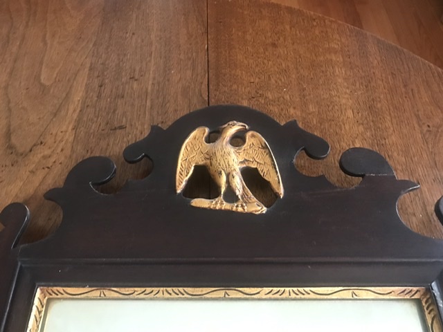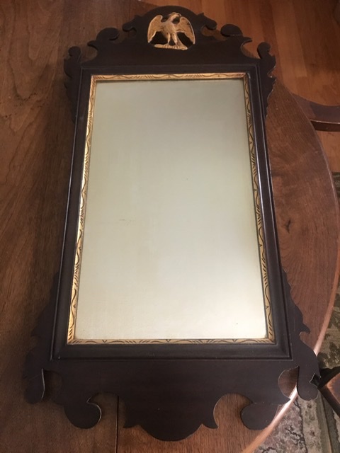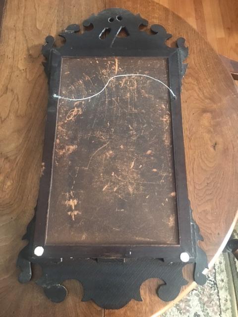 The mirror is in the Chippendale style. It is likley a reproduction and note the mirror is unfoxed (silver peeling and or oxidized) Also there was a period 100 years after the founding of our country when it became very popular to build replica items. These items are known as Centenial Furniture since they were made for the 1876 centenial. They are now quite old and difficult to separate as replicas.