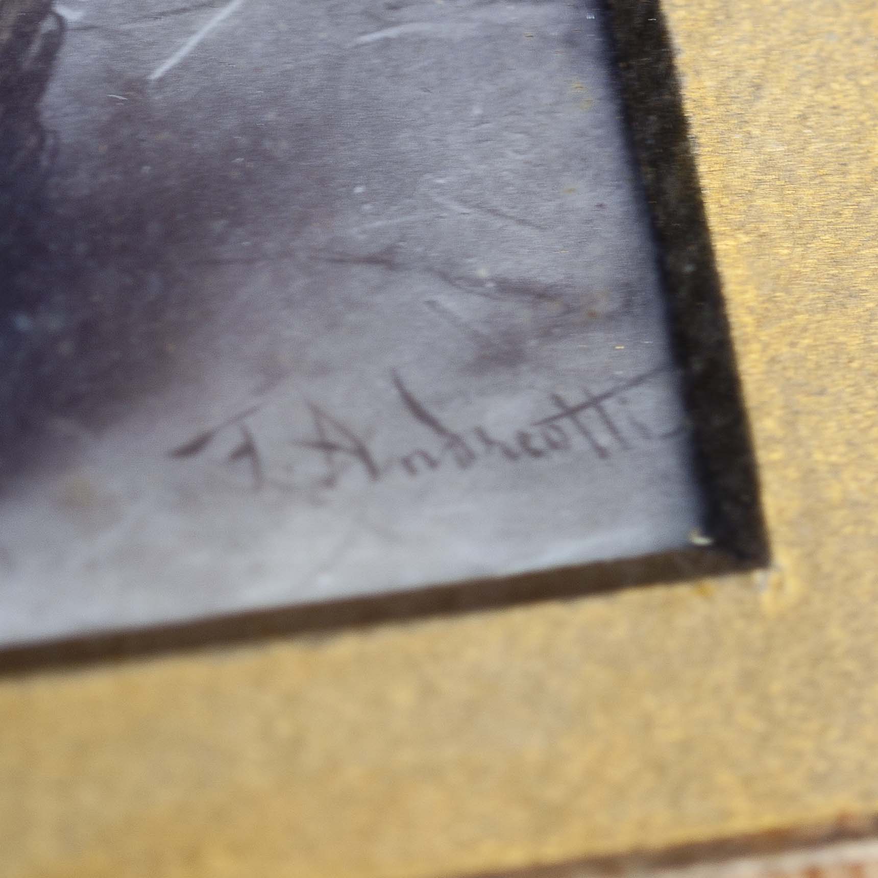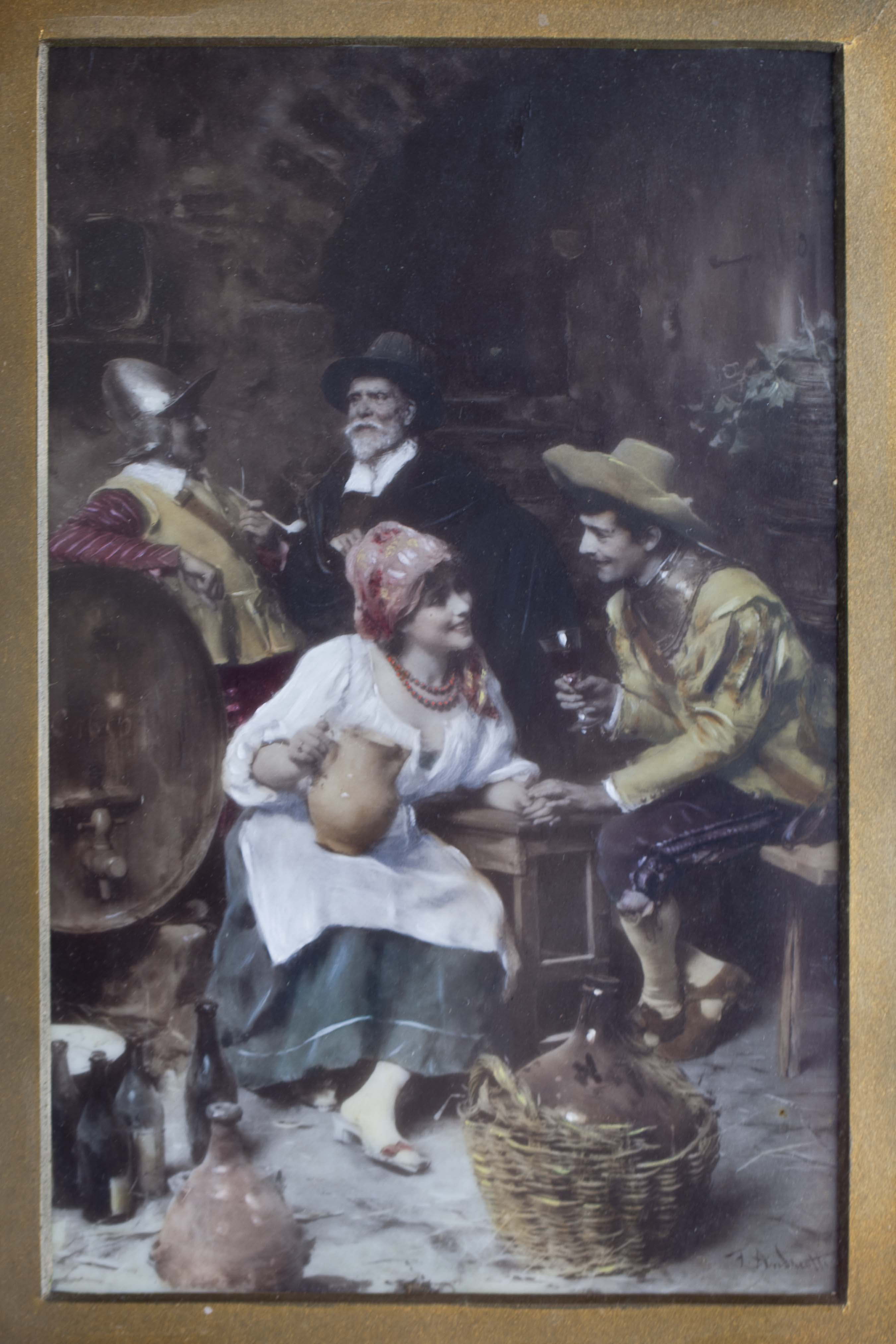 A painting That I think was done by Federico Andreotti. It could be painted on glass or ceramic maybe. I found a similar looking painting on another website and it was called Old Wine, Young Love.