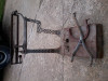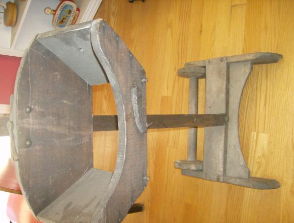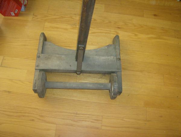 Has wooden wheels to roll onto scale. Screws and nails to secure grain sack in place.