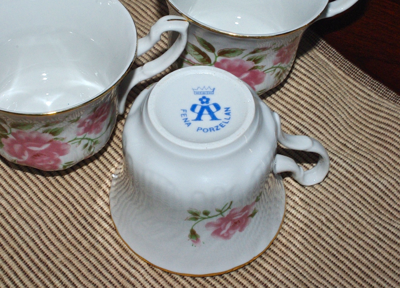 Picked this Fena Porzellan set up at a barn sale in Bavaria, Germany over 10 years ago and they've been in storage ever since. I am not a collector of anything and don't know one thing about this set. Looking to sell before we move but I do not know what they are worth, if anything. Double rose w/ green leaves on one side and a single rose on the reverse side. Gold on the brims. 11 peices/no saucers. No chips or cracks, in excellent condition. Any information would be helpful. Thanks, JC
