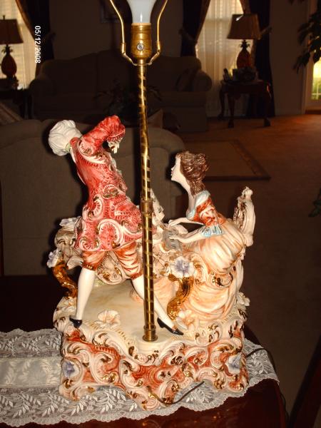 <p>Sorry to rain on the parade, but this lamp is quite modern. Country of origin marks such as " made In Italy' were not in use until the 1920's. Figural lamps of this type tend to date after world war two, though they were made from the 1920's onward. Values for them though tend to be a bit of a puzzle , or a matter of taste ;~) We have seen similar lamps sell for over $400.00 at auction, then later in the same year an identical lamp will go for $150.00......</p><p> </p><p>Lovejoy </p>