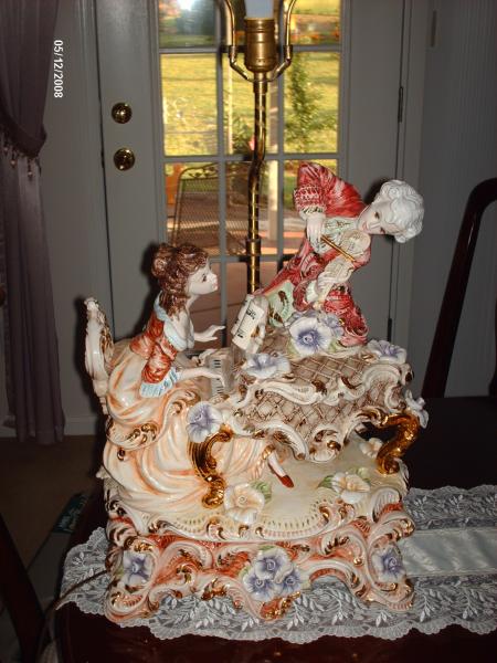 Pordcelain, very Detailed, Man standing playing violin, woman sitting playing baby grand piano, trimmed in gold, hand written inside base housing, Fendi F662, Made in Italy, no bad places at all, excellent condition, woman dressed in victorian ball gown and man dressed in ballroom garb, don't know what you call them. Woman has brown hair and man has white, all of this is trimmed in gold.