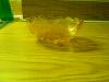 This is a nice little piece. It is round with a fluted rim. It is pink and green frosted glass with handpainted trees and mountains.