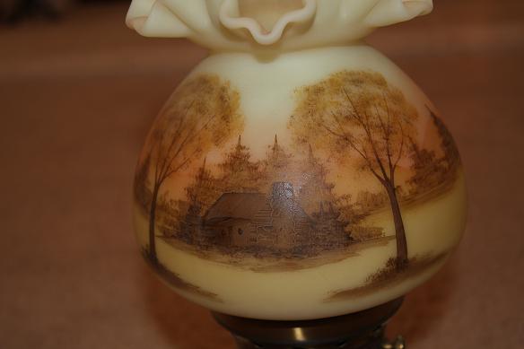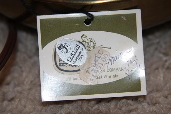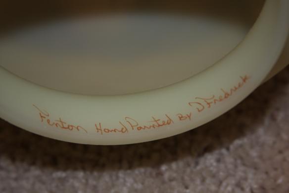 There is an original Fenton tag on it "Authentic Fenton Handmade", the glass is signed Fenton Handpainted by D Fredrick, the glass has brown painting of trees and a small house