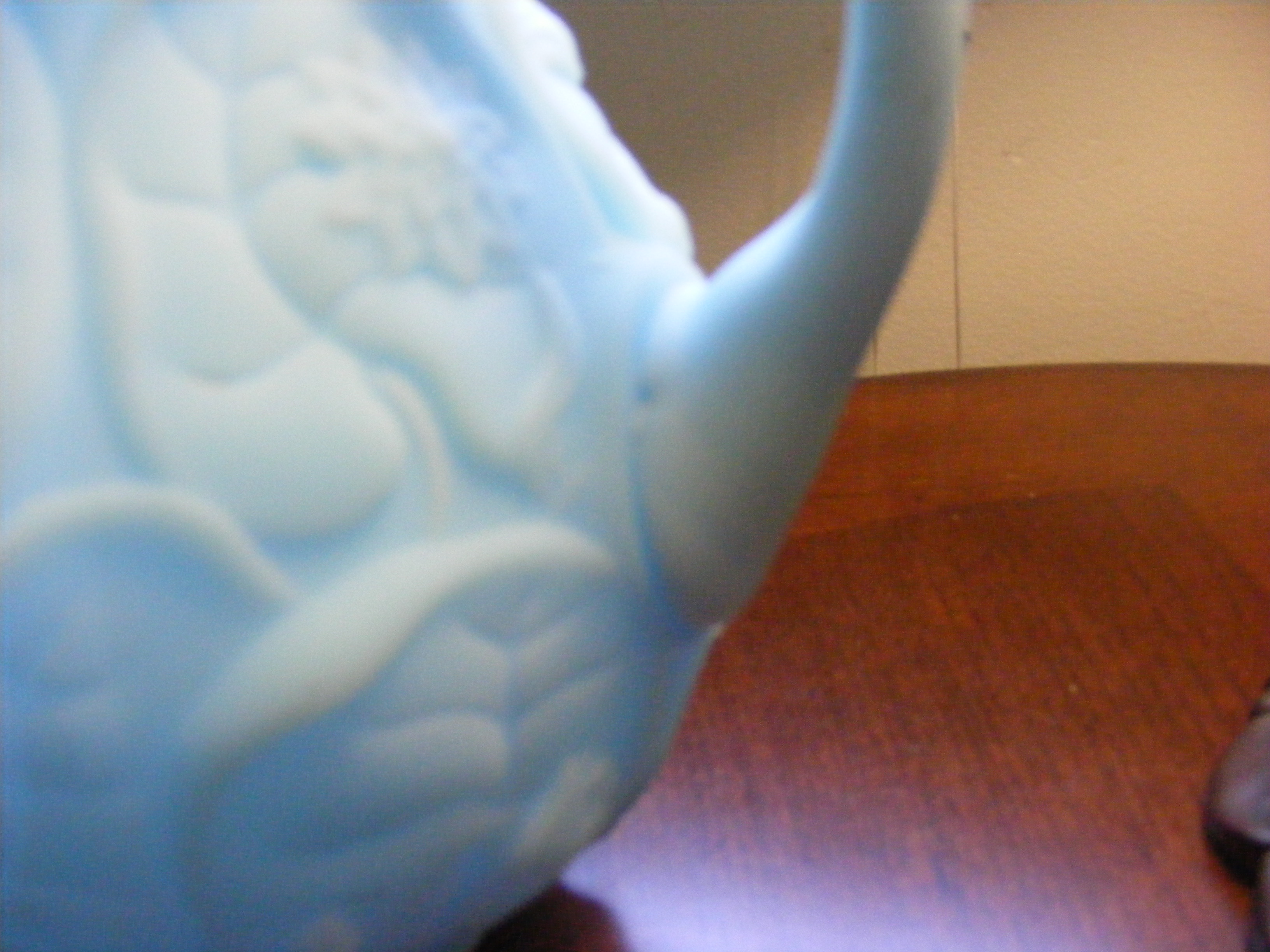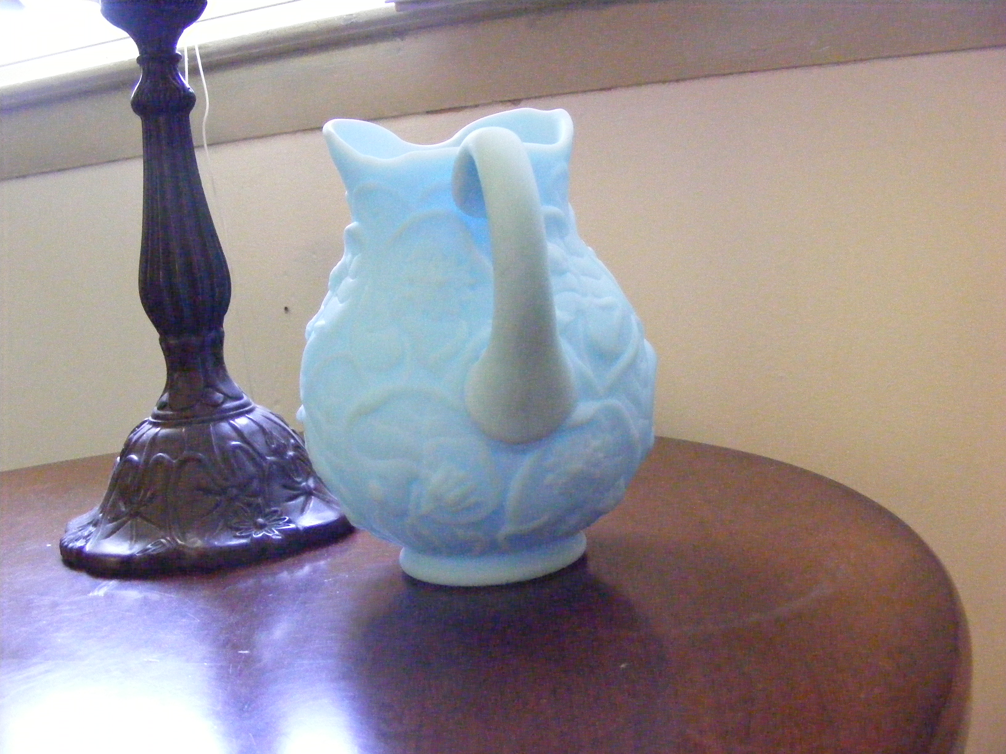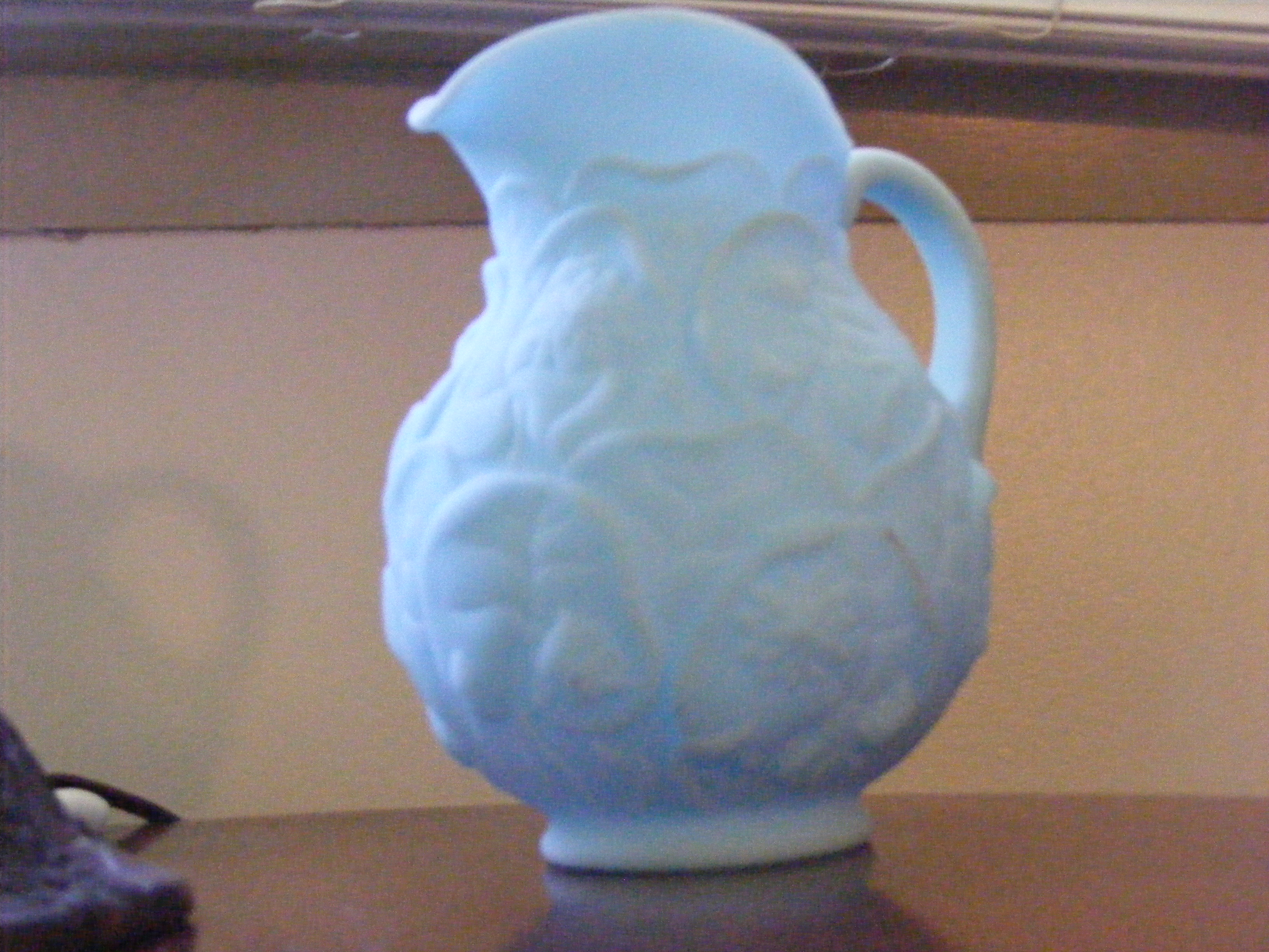 I have a light blue Fenton pitcher. It is small, approximately 6" tall. Near the top of the pitcher, you can see the light through it. I believe it was made in a cast, the decoration on the outside appears to be pressed. The raised pattern on the outside is of water lily's and flowers.