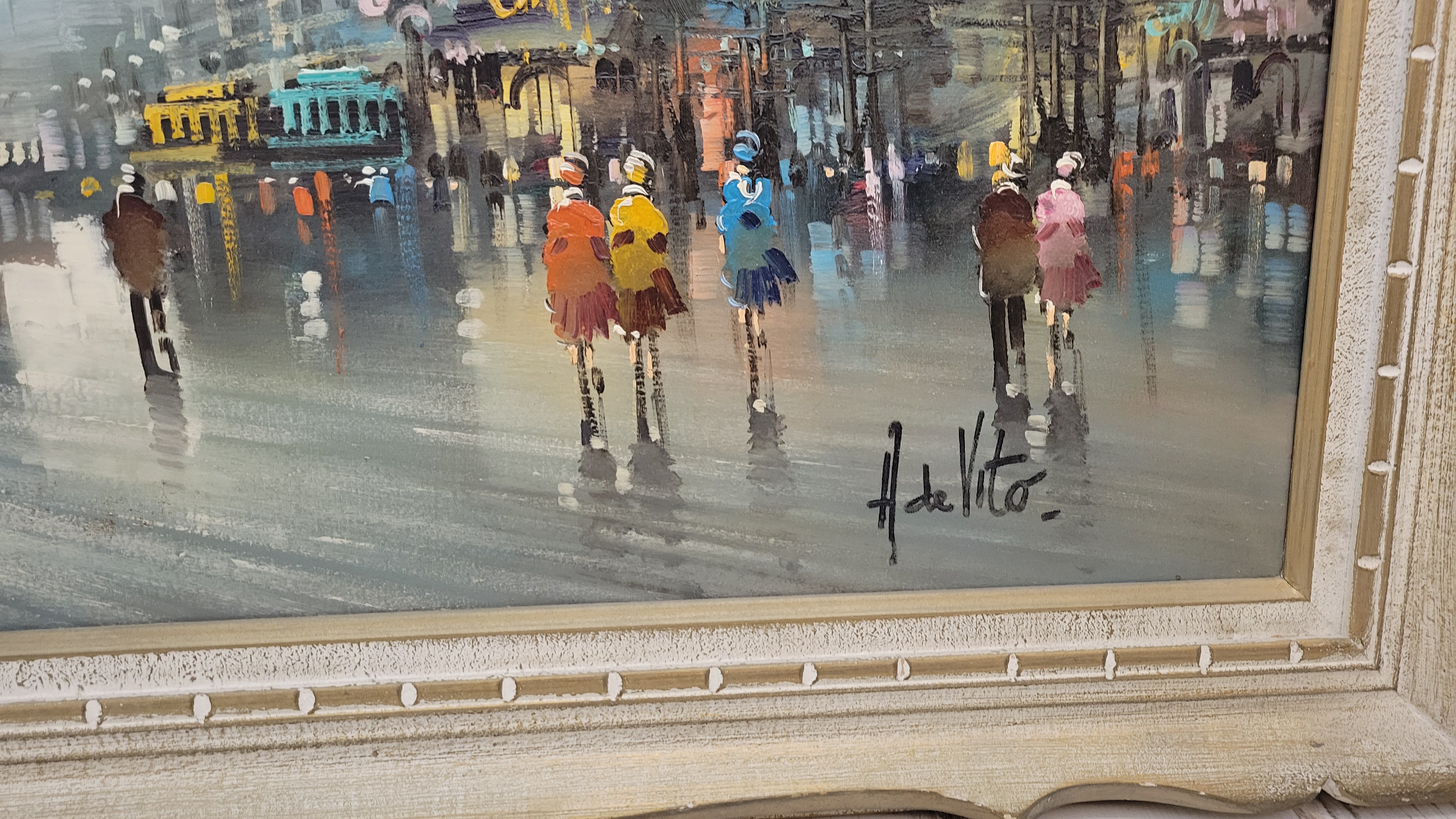 Original, signed oil painting on stretched canvas by Ferdinand A. DeVito of the Arc De Triomphe. Also original frame with brass plaque DE.VITO.