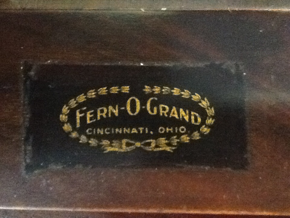The Fern-O-Grand Company, was located at 212 West Central Parkway, Cincinnati, Ohio, this phnograph made in the form of a small piano was made by them Circa 1920. They were not a terribly good phongraph, but their unusal cabinet makes them highly collectible, the last five we've seen go at auction sold between $550.00- $1750.00. A lot depend on the condition of the cabinet and the working components.