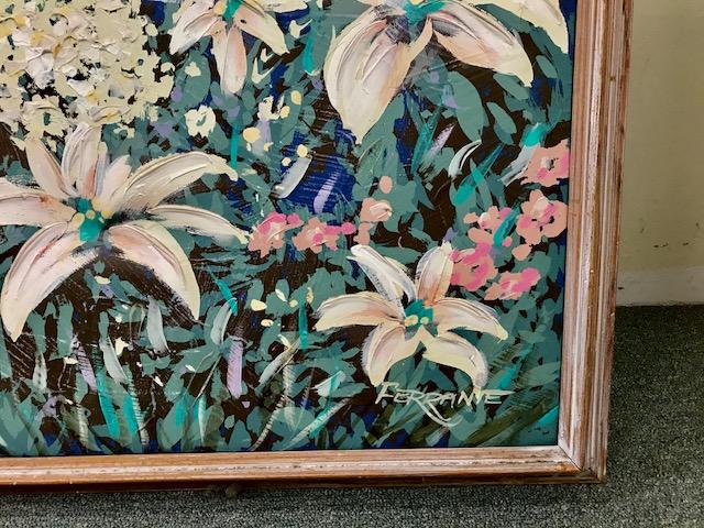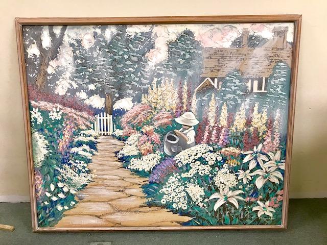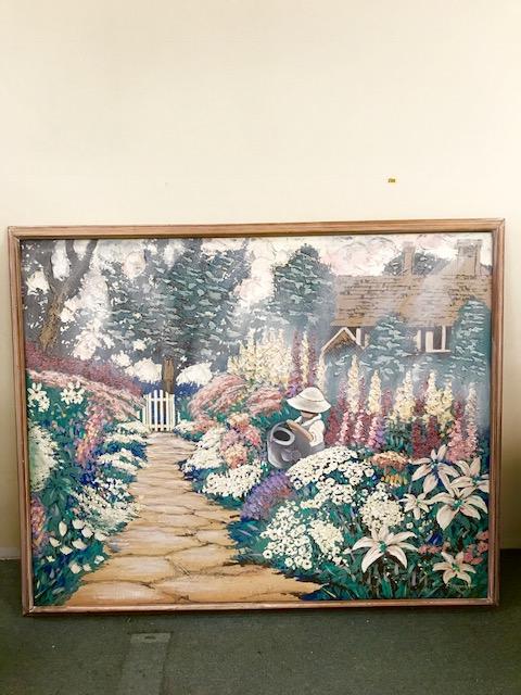 A large oil on canvas painting of a flower garden and a young boy with a watering can.
