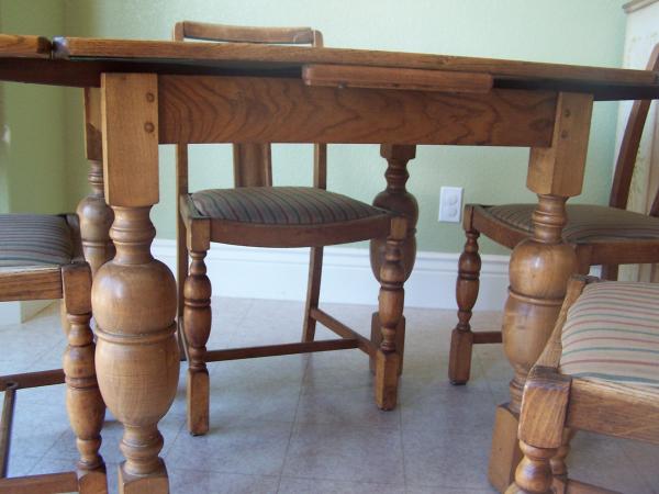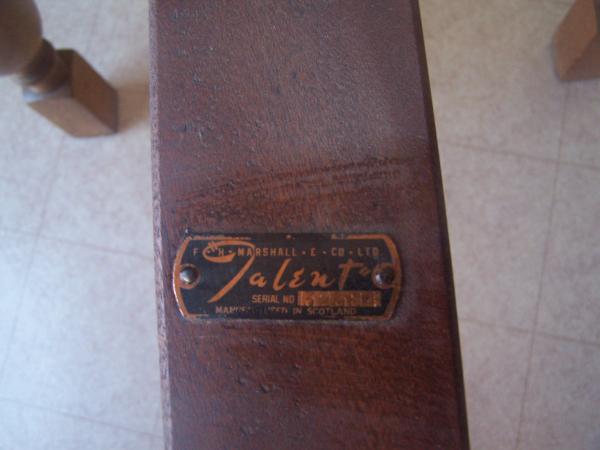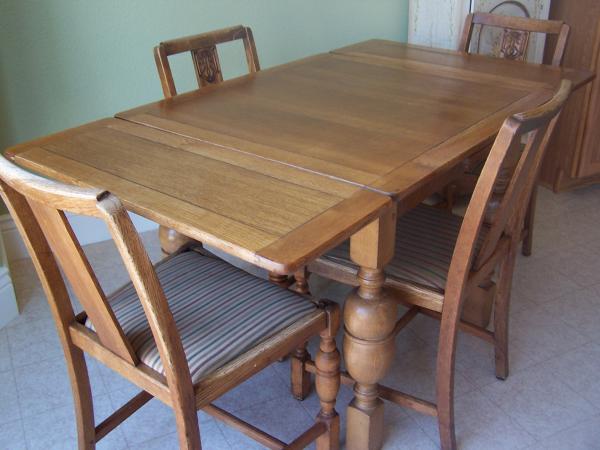 Oak dining table and 4 chairs. Metal plate on table base, under removable table top reads, "FH Marshall & Co Ltd". Serial# 132384, Mfg in Scotland. The oak leafs slide in and out. The chairs had been recovered by the previous owner. One chair had been repaired at the top. I'm thinking about giving this item to charity, but wanted to first check it's possible value. However, I would sell it if someone is interested. Thank you.