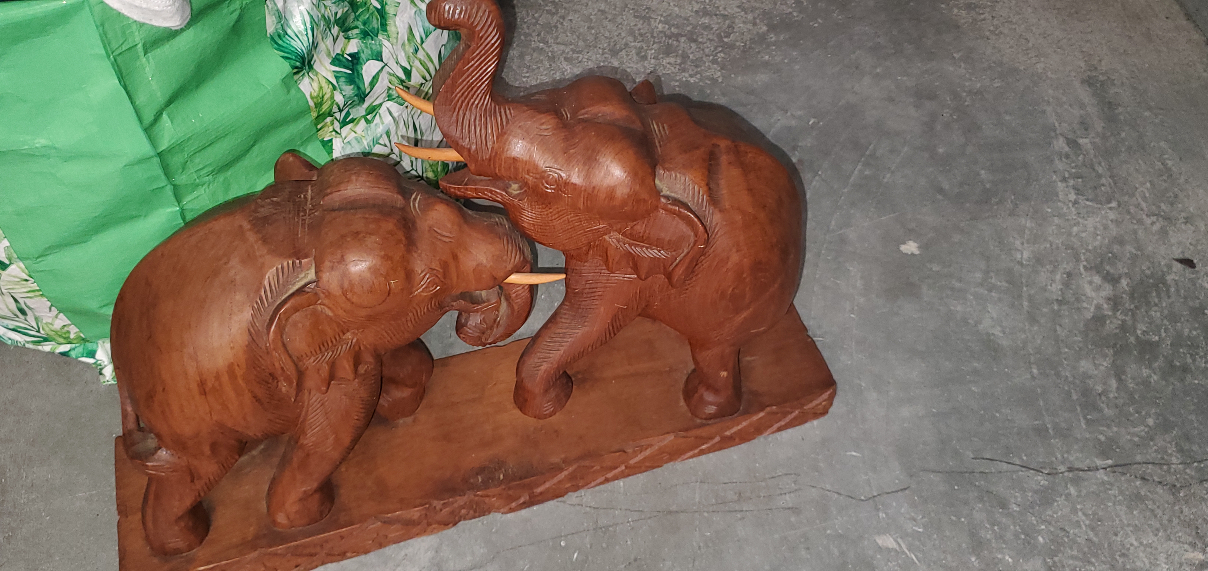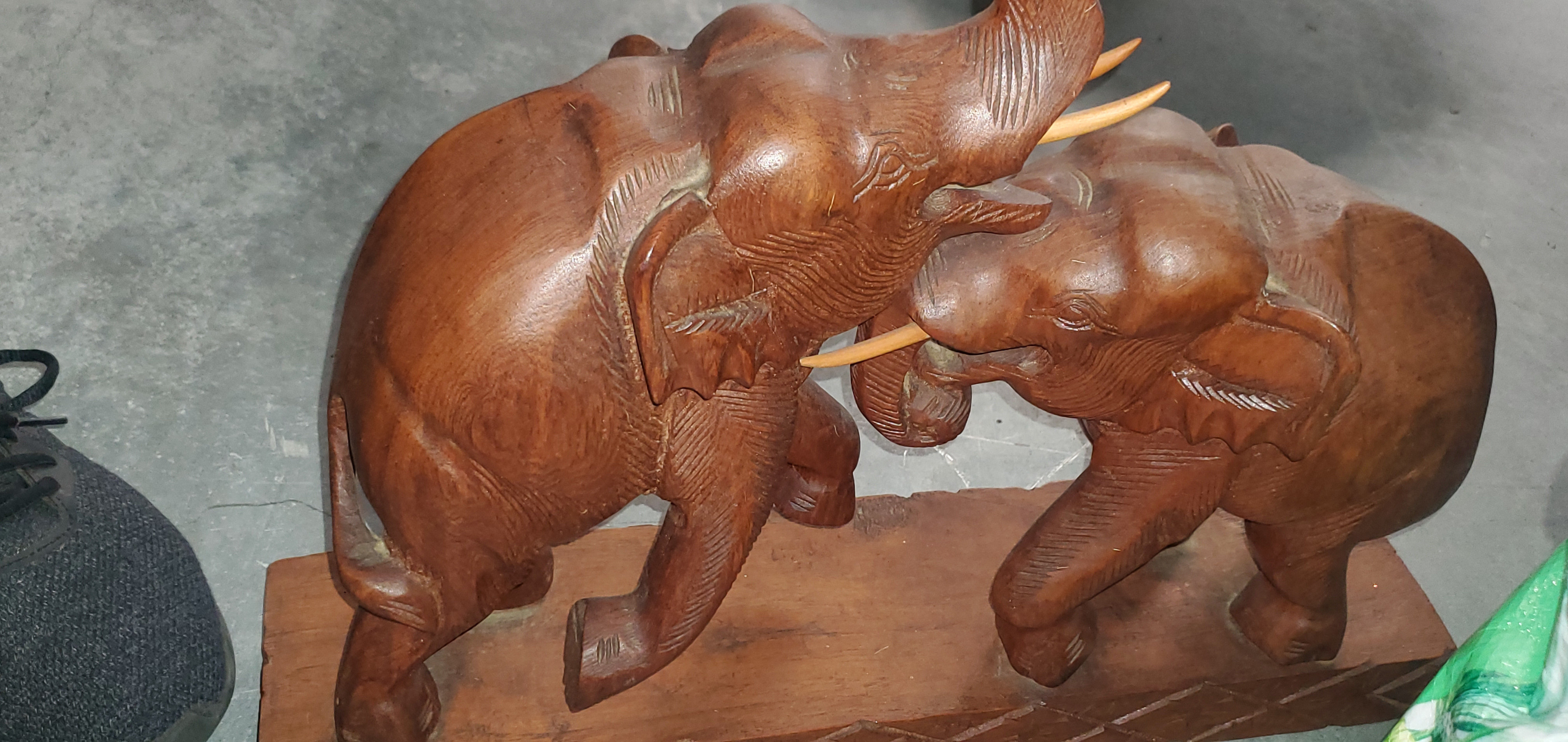 Physical Description: This hand-carved wooden sculpture features two intricately detailed elephants facing each other, seemingly engaged in playful or combative interaction. The piece is mounted on a hand-carved wooden stand. The wood appears to be walnut, known for its durability and rich color. The dimensions are approximately 15.5 inches in height, 17 inches in length, and 3.5 inches in width. The sculpture weighs around 15 pounds.