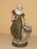 Figure of barefoot girl with basket standing in front of a tree stump. Looks hand painted and has gilt scroll round the base. No backstamp but a glazed letter B.