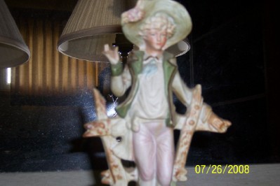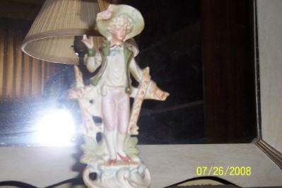 There is a set of two lamps, one is a young man and the other is a young woman both standing by a fence and waving. The man lamp is in good condition. The lady lamp however had a head and a hand glued on as apparently they were broken off at some time. There are only those two pieces glued...it wasn't shattered or in chips. They stand on a metal base and there is a metal tube that runs behind the figurines to go up to hold the lampshade and bulb above them. The lampshade that is shown behind the figurine is reflecting from a mirror and is really up above the lamp. My mistake in taking the picture. These lamps are for nightstands or as my parents had them, at either end of a long bedroom dresser. I can upload the lady figurine picture if needed. Just curious about them because of the age. Would consider selling if anyone is interested but figured that because of the lady lamp having two pieces glued on, there wouldn't be much interest.