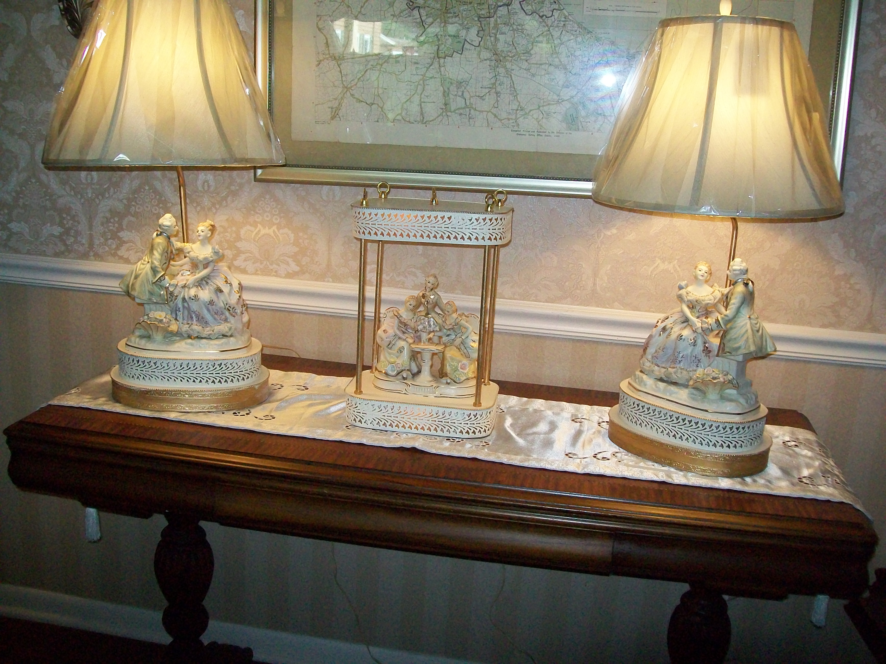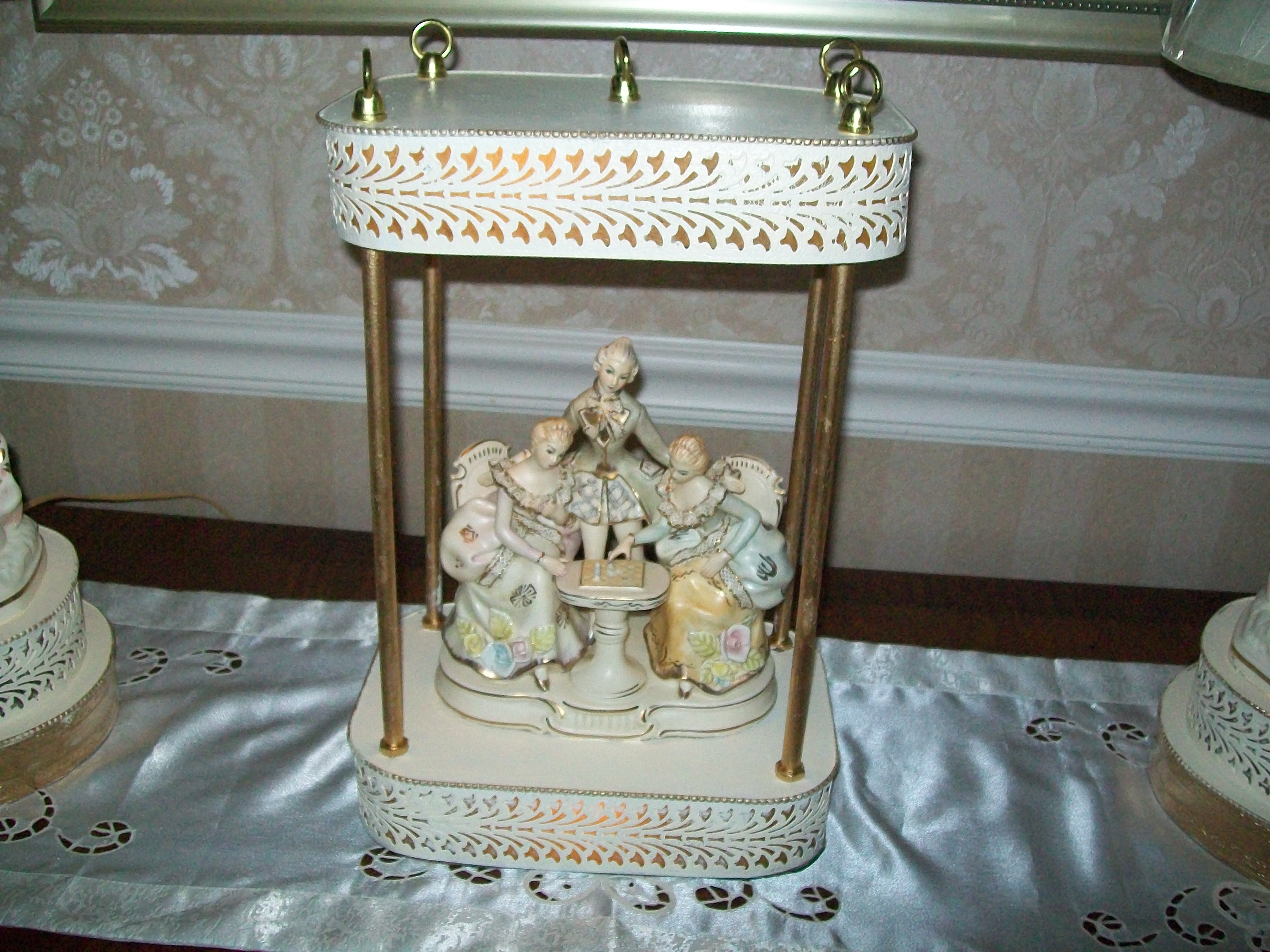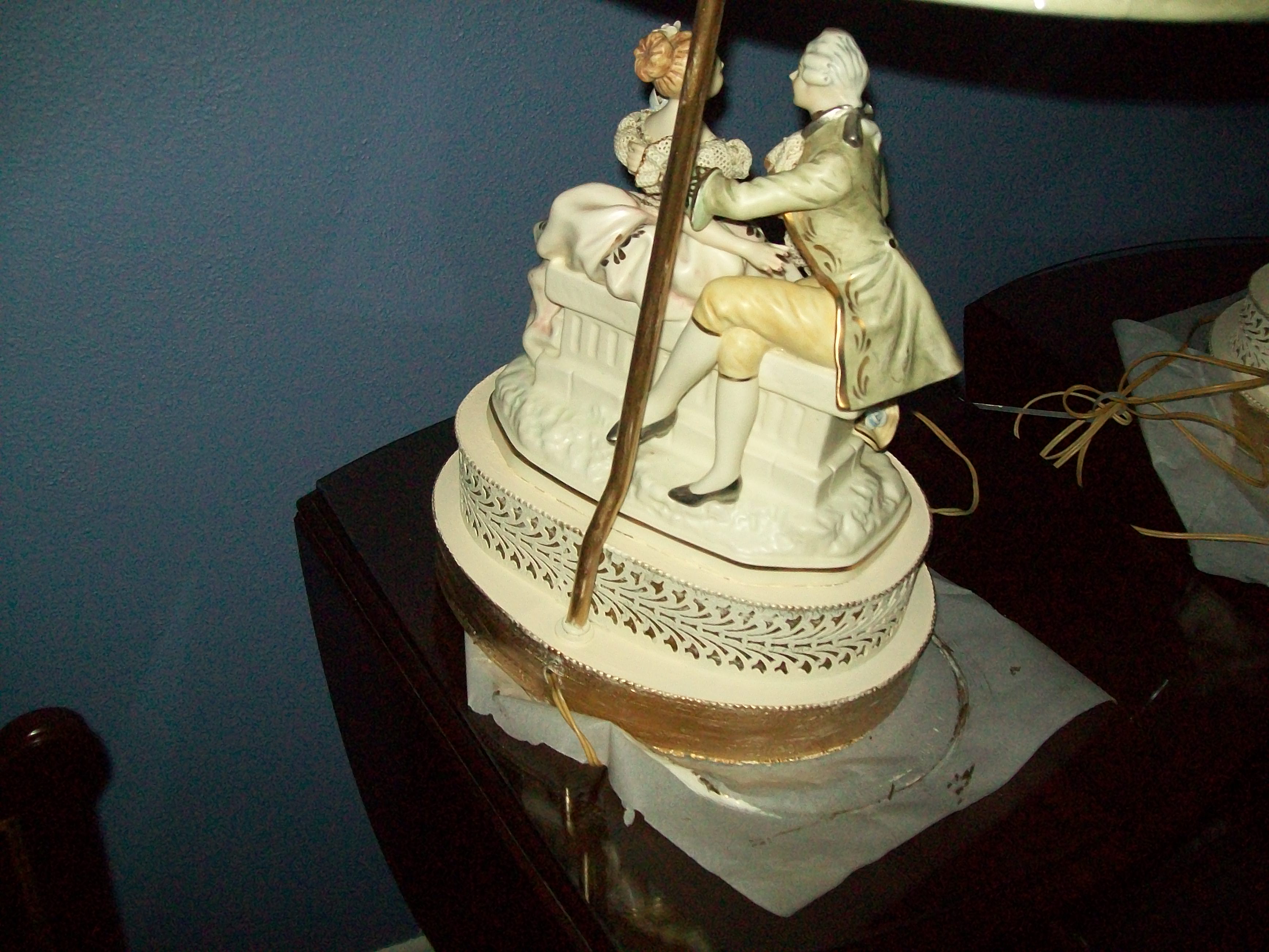 please view all images and please i d these lamps there are vintage and what value would you put on them they are a set 3 lamps in all with porcelains figurines seated on a couch all in great shape with one exception lady seated on one of the lamps has a broken finger other than that everything is good conditionmeaseurement of the lamps are 29" tall to finial,base 11" x 9" , the other square lamp is 15 1/2 " tall to finals which have been replaced" 3 people seated 10" x 7' wide base there are no markings any where on the the 3 lamps l thevalue please and the there i d thank you for your help in this matter ,bob.
