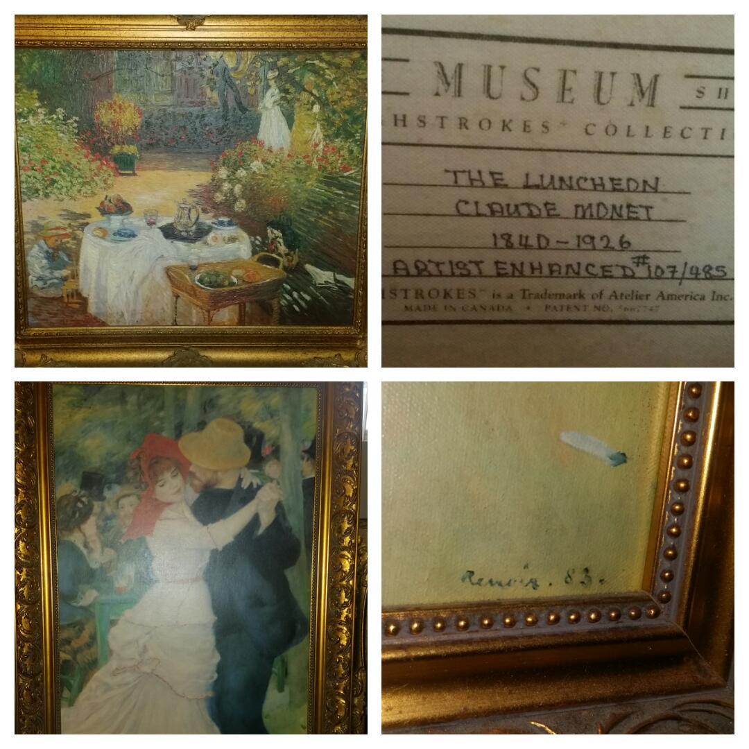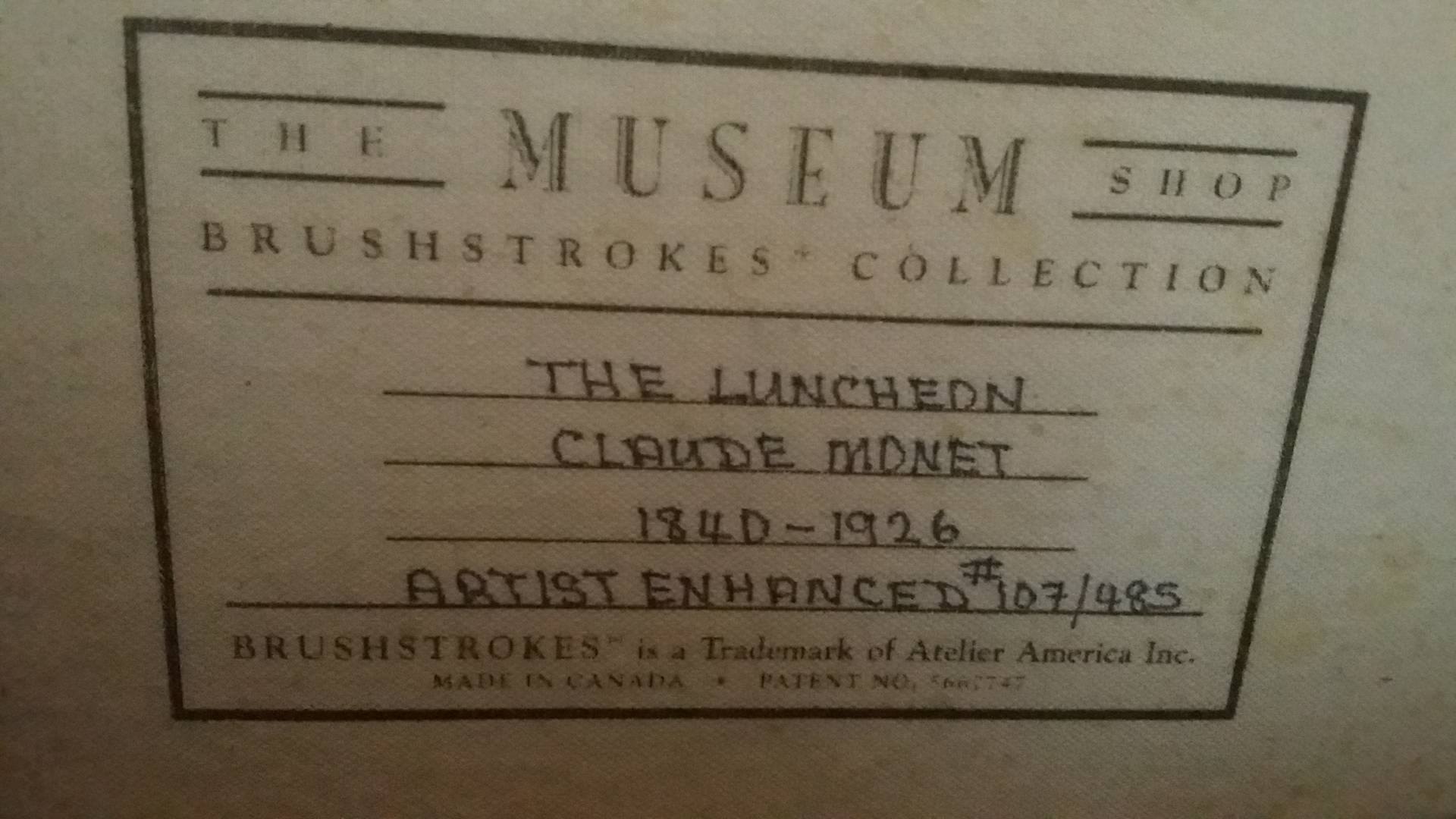 I have two pieces both in museum quality frames. The first is The Luncheon by Claude Monet. On the back of the canvas is stamped The Museum Shop Brushstrokes collection 1840-1926 Artist enhanced #107/485.